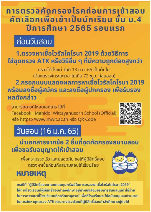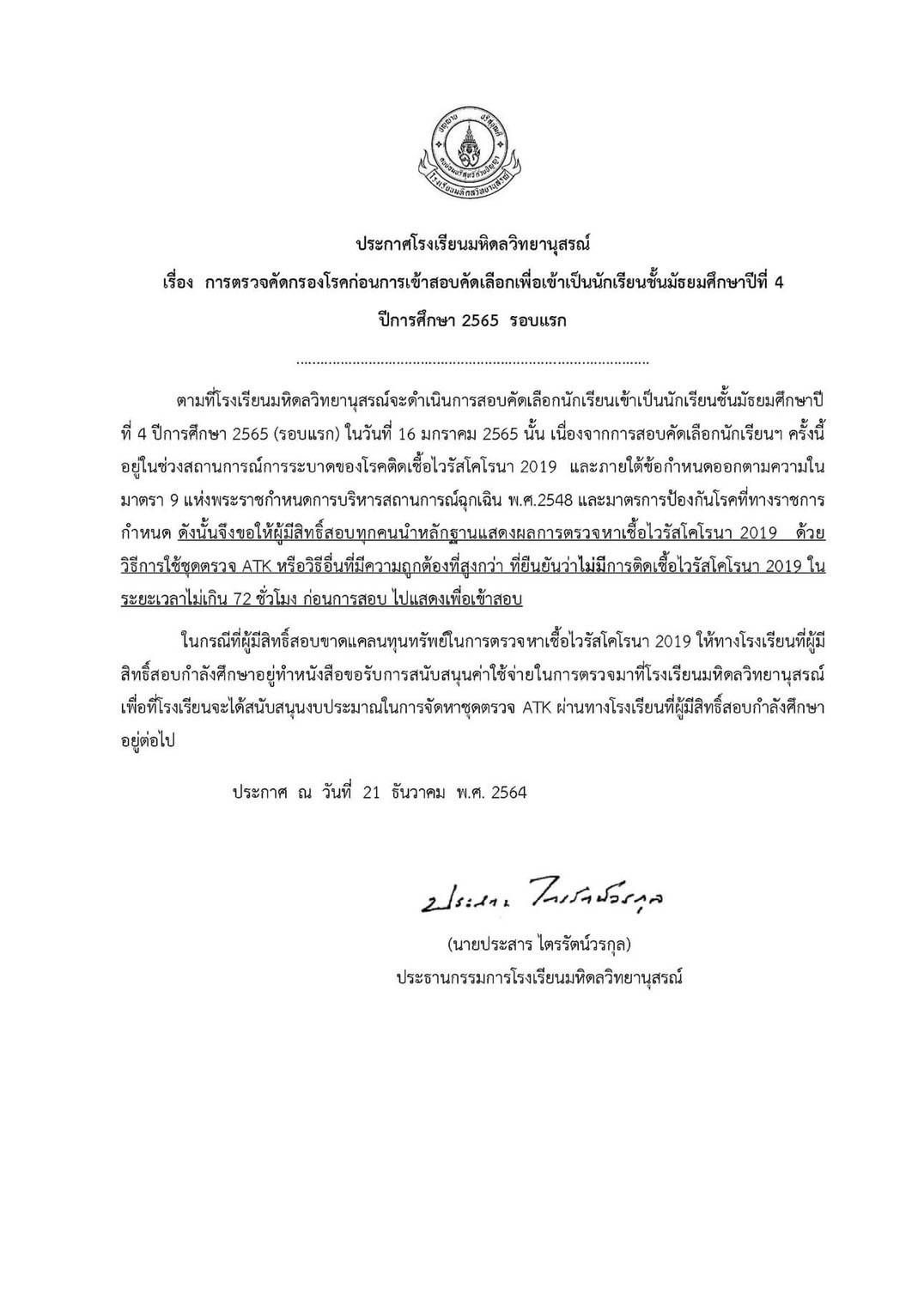 ประกาศการตรวจคัดกรองโรคก่อนเข้าสอบคัดเลือกเพื่อเข้าเป็นนักเรียนชั้นมัธยมศึกษาปีที่ 4 ปีการศึกษา 2565 รอบแรก
