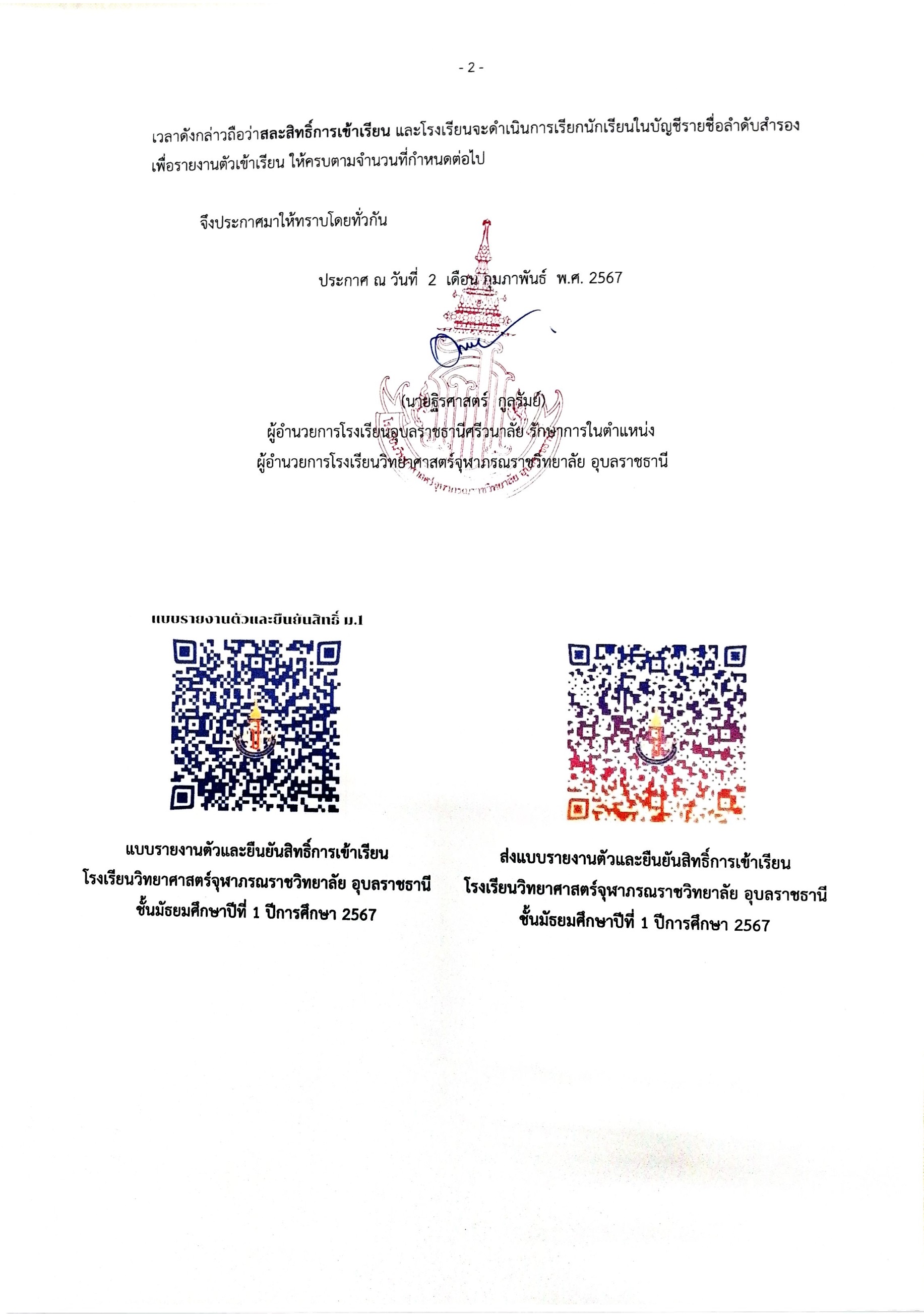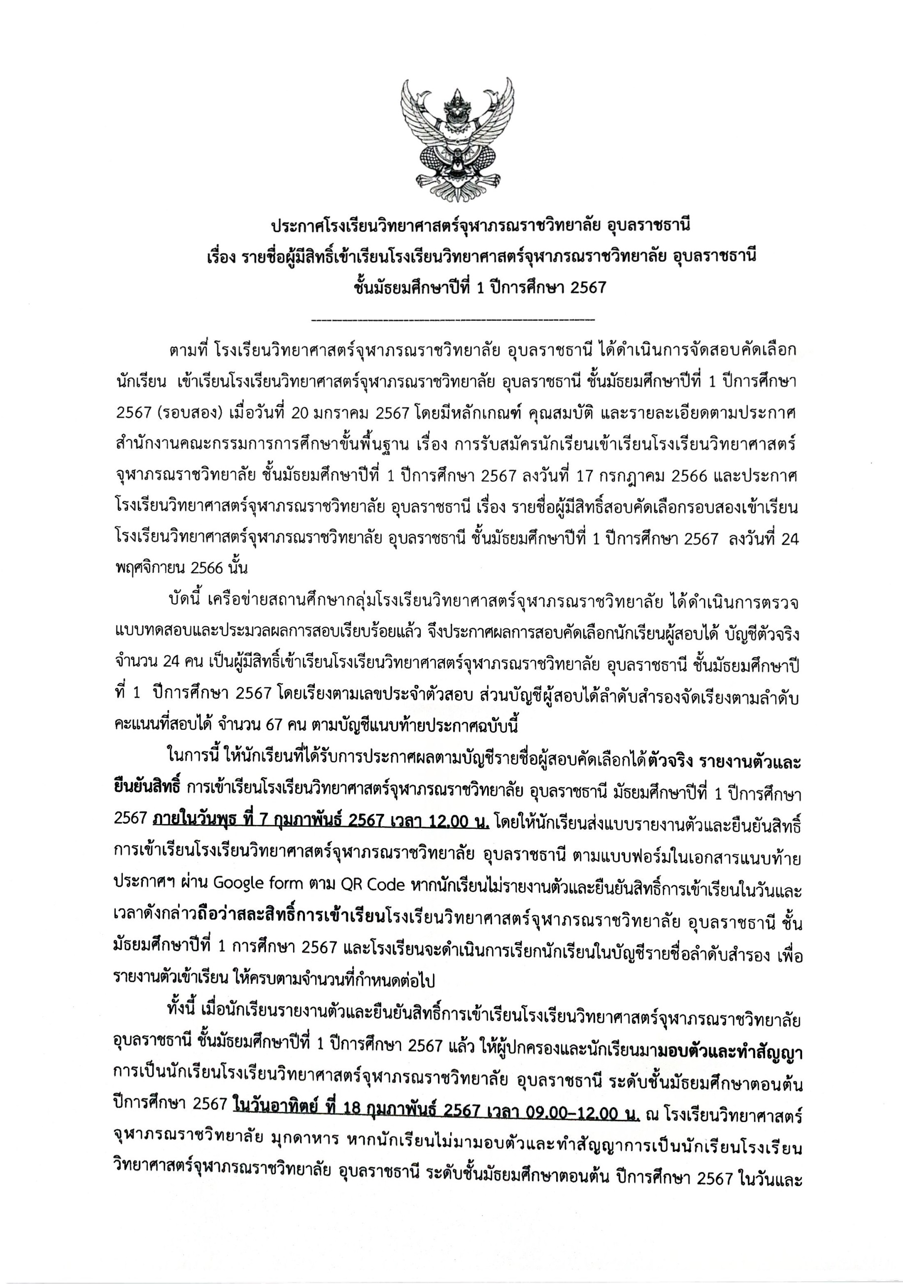 ประกาศรายชื่อผู้มีสิทธิ์เข้าเรียนชั้นมัธยมศึกษาปีที่ 1 โรงเรียนวิทยาศาสร์จุฬาภรณราชวิทยาลัย อุบลราชธานี ปีการศึกษา 2567