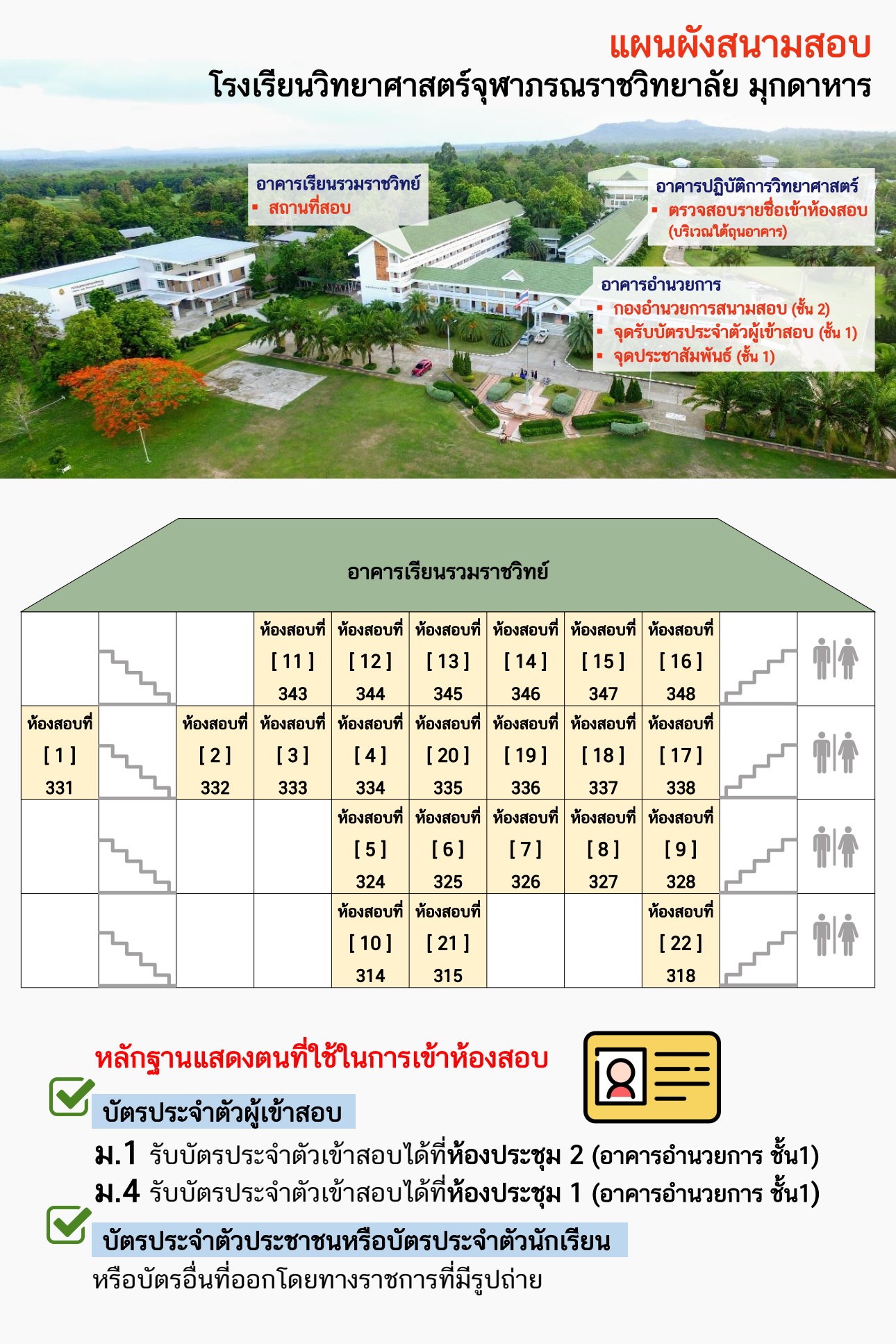 แผนผังสนามสอบคัดเลือกเข้าเรียนชั้นมัธยมศึกษาปีที่ 1 และ 4 รอบสอง โรงเรียนวิทยาศาสตร์จุฬาภรณราชวิทยาลัย มุกดาหาร