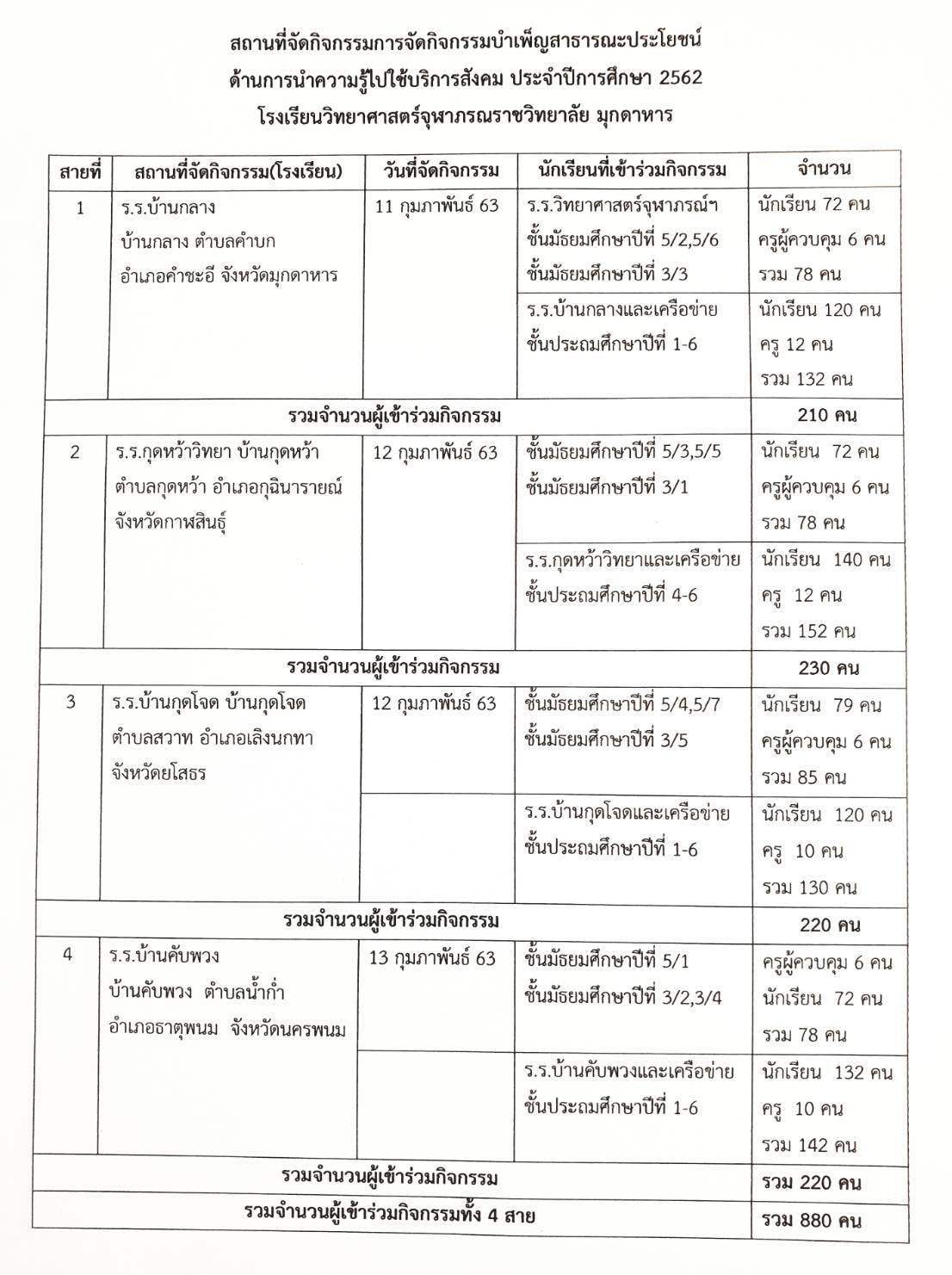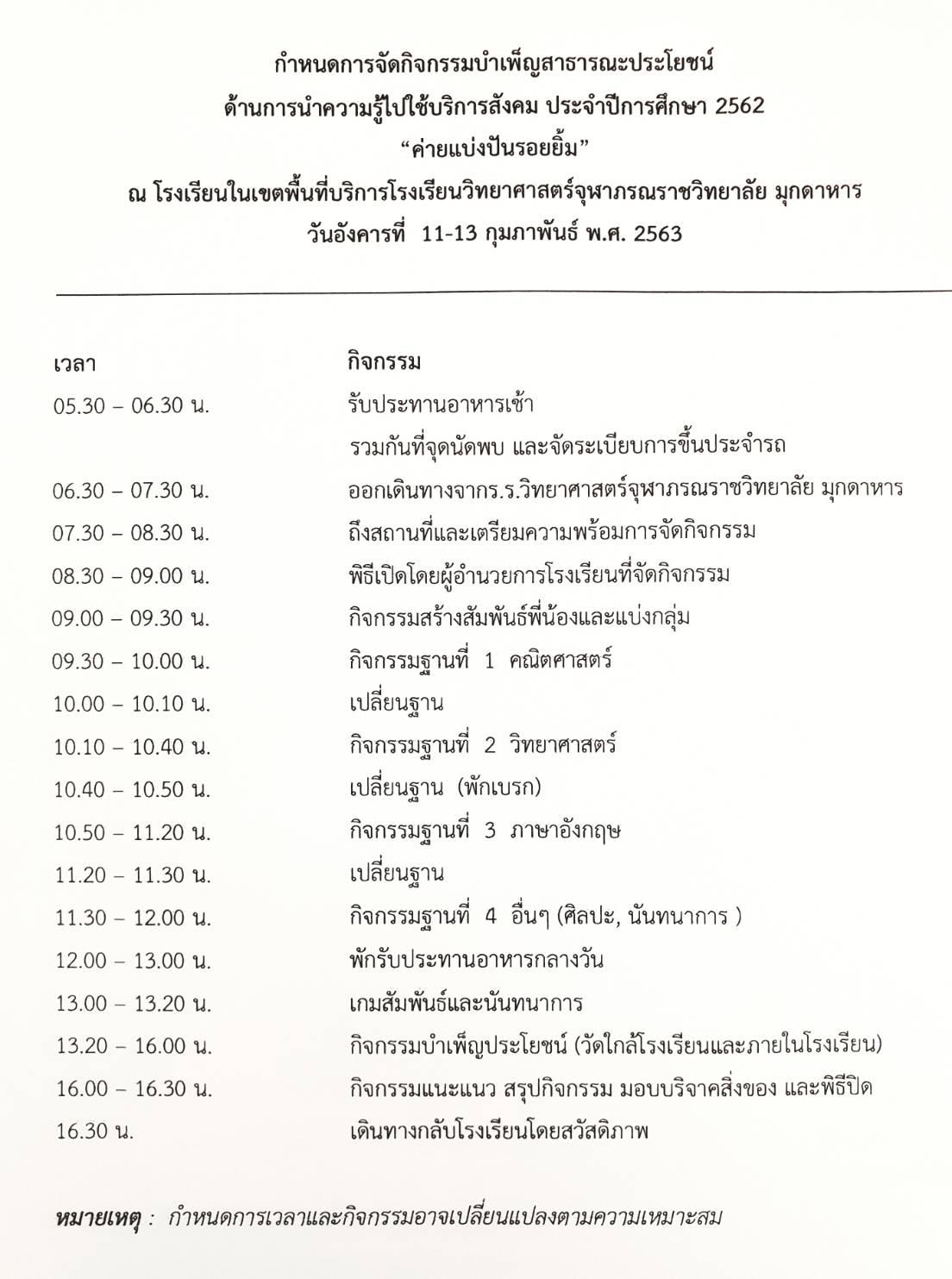 กิจกรรมบำเพ็ญสาธารณประโยชน์ ค่ายแบ่งปันรอยยื้ม ประจำปีการศึกษา 2562 มีกำหนดจัดขึ้นในวันที่ 11-13 กุมภาพันธ์ 2563