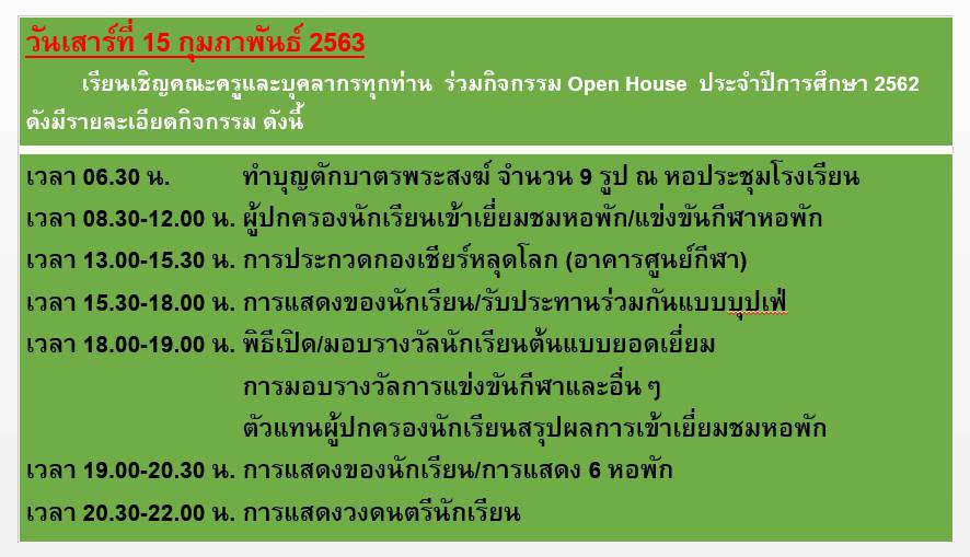 กิจกรรมเปิดหอพัก (Open House) ประจำปี 2563 มีกำหนดจัดกิจกรรมในวันที่ 15 กุมภาพันธ์ 2563 เวลา 07.00 - 21.00 น.