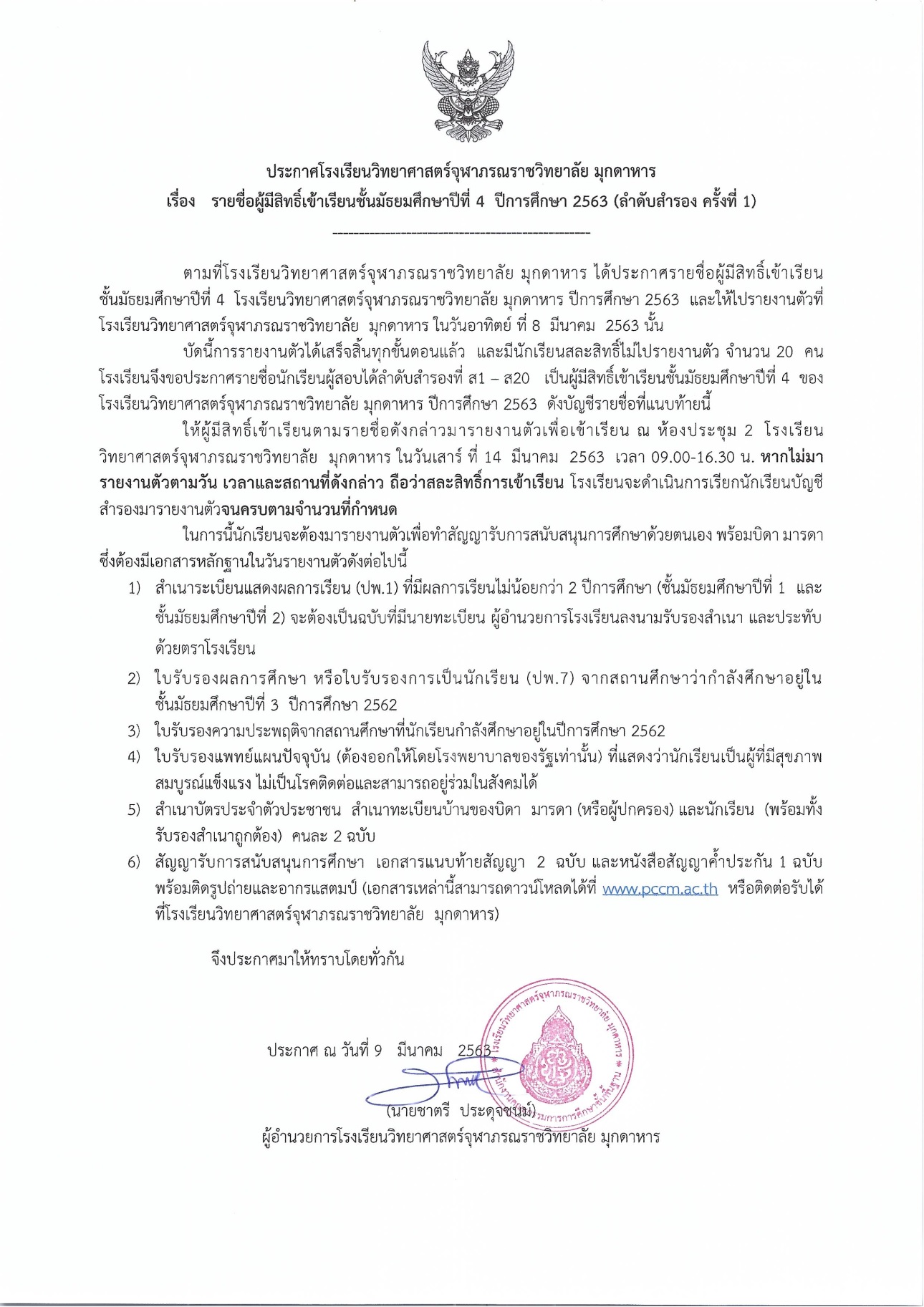 ประกาศรายชื่อผู้มีสิทธิ์เข้าเรียนชั้นมัธยมศึกษาปีที่ 4 ปีการศึกษา 2563 (เรียกลำดับสำรองครั้งที่ 1)