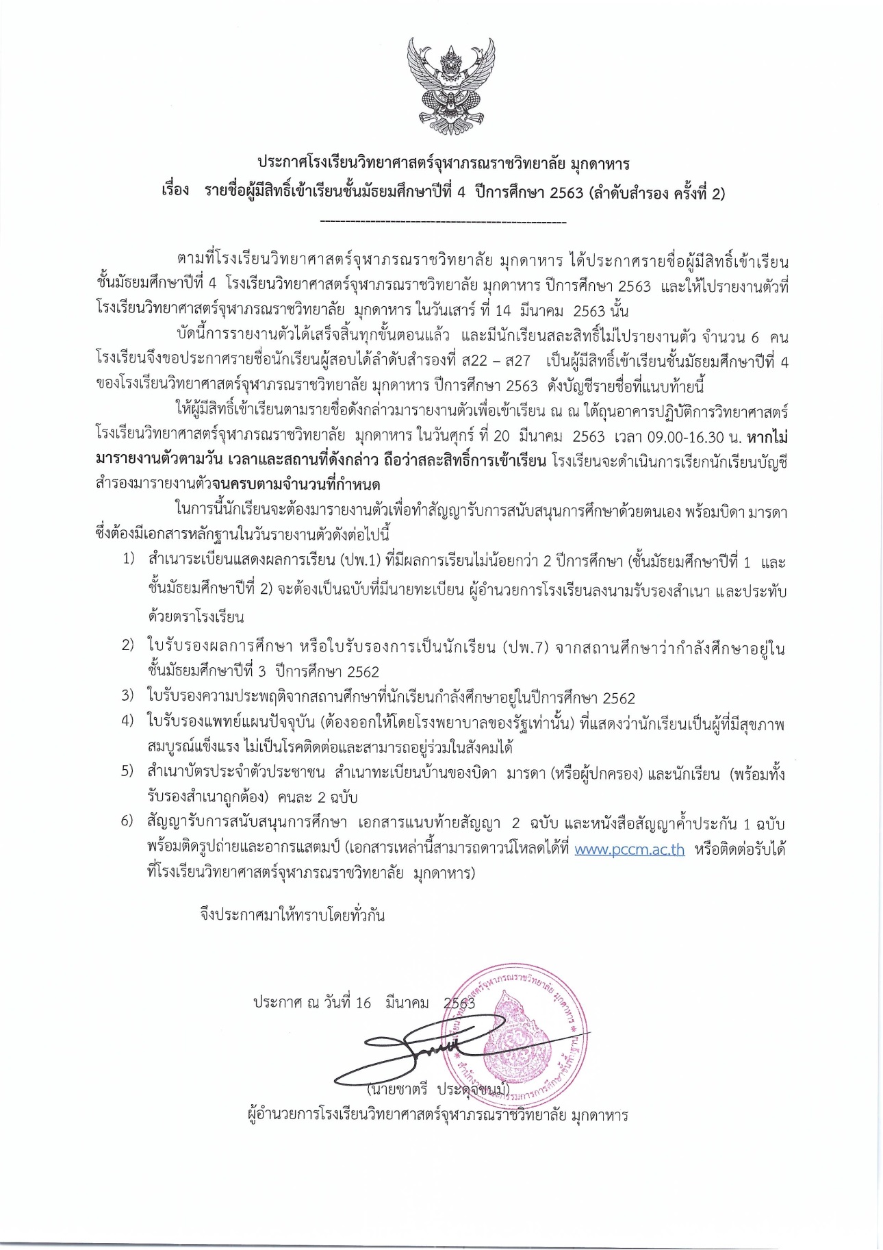 ประกาศรายชื่อผู้มีสิทธิ์เข้าเรียนชั้นมัธยมศึกษาปีที่ 4 ปีการศึกษา 2563 (เรียกลำดับสำรองครั้งที่ 2)