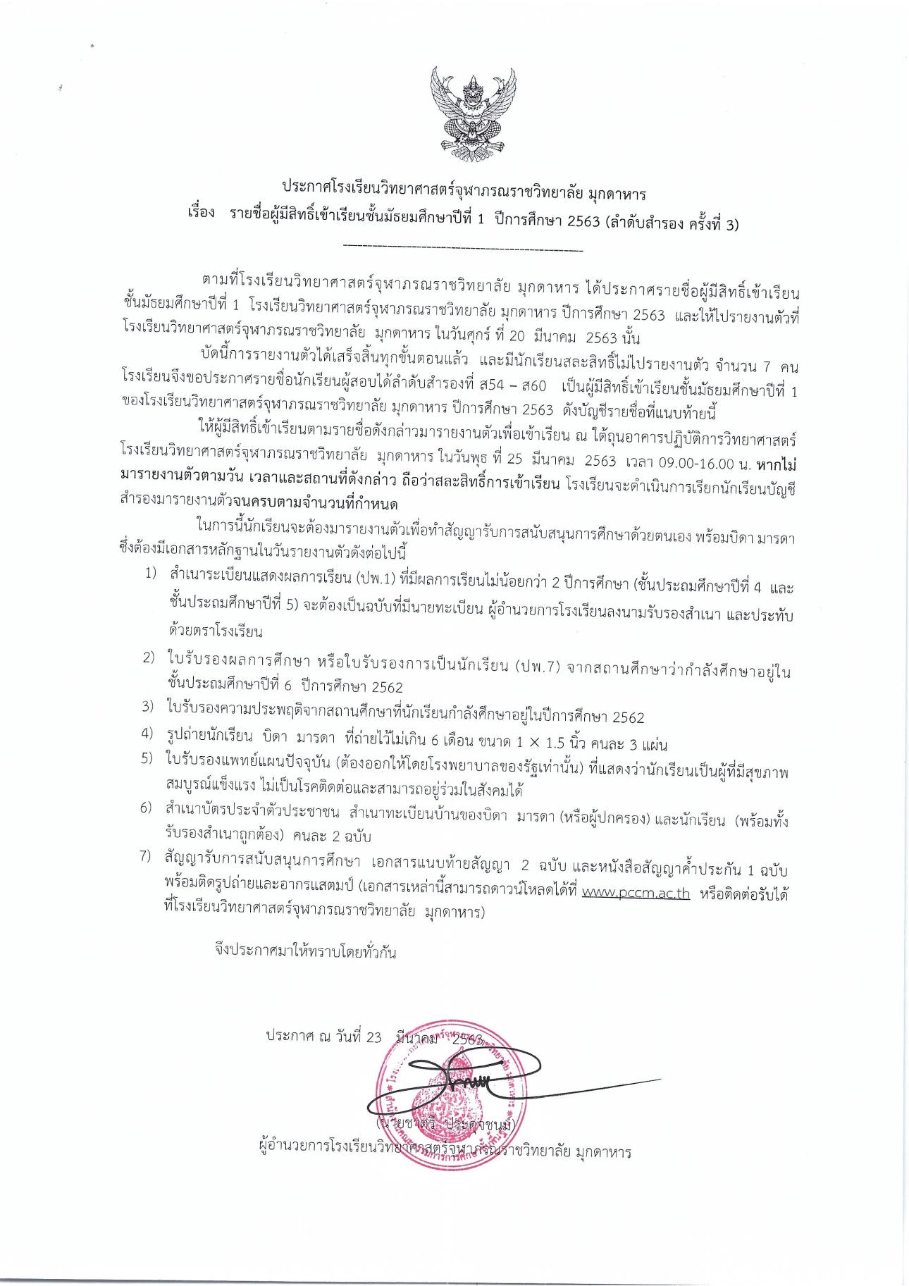 ประกาศรายชื่อผู้มีสิทธิ์เข้าเรียนชั้นมัธยมศึกษาปีที่ 1 ปีการศึกษา 2563 (เรียกลำดับสำรองครั้งที่ 3)