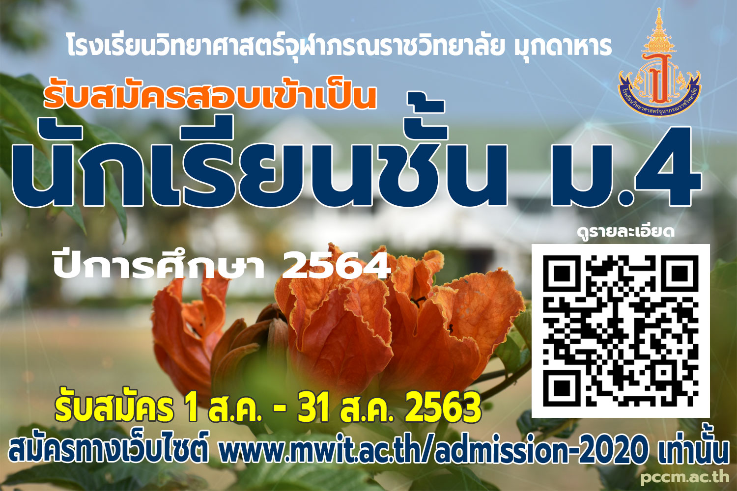 โรงเรียนวิทยาศาสตร์จุฬาภรณราชวิทยาลัย มุกดาหาร ประกาศรับสมัครสอบคัดเลือกเข้าเป็นนักเรียนระดับชั้น ม.4 ประจำปีการศึกษา 2564