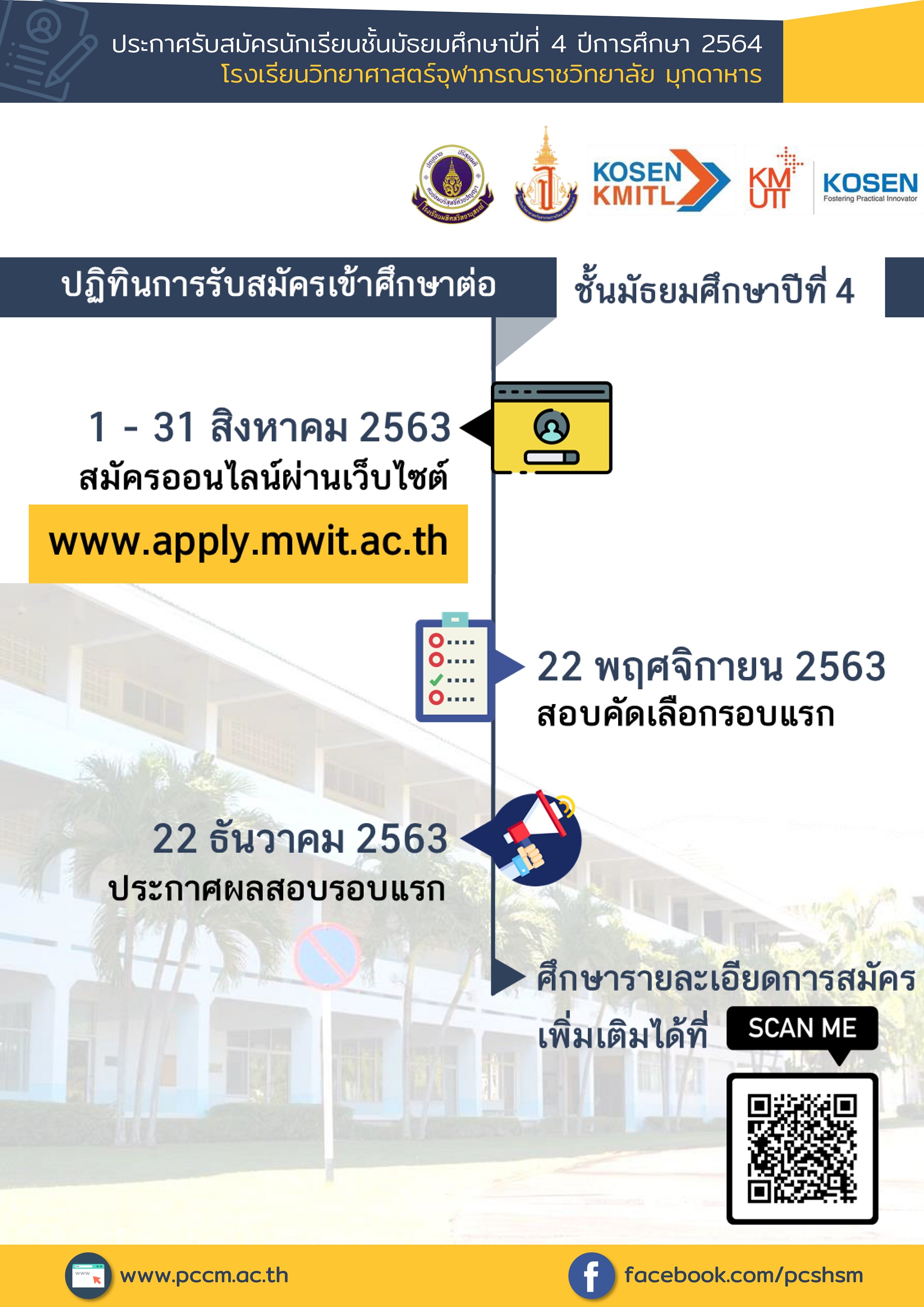 - จัดสอบที่ โรงเรียนวิทยาศาสตร์จุฬาภรฌราชวิทยาลัย มุกดาหาร กำหนดการสอบ จะแจ้งในวันประกาศผลสอบรอบแรก