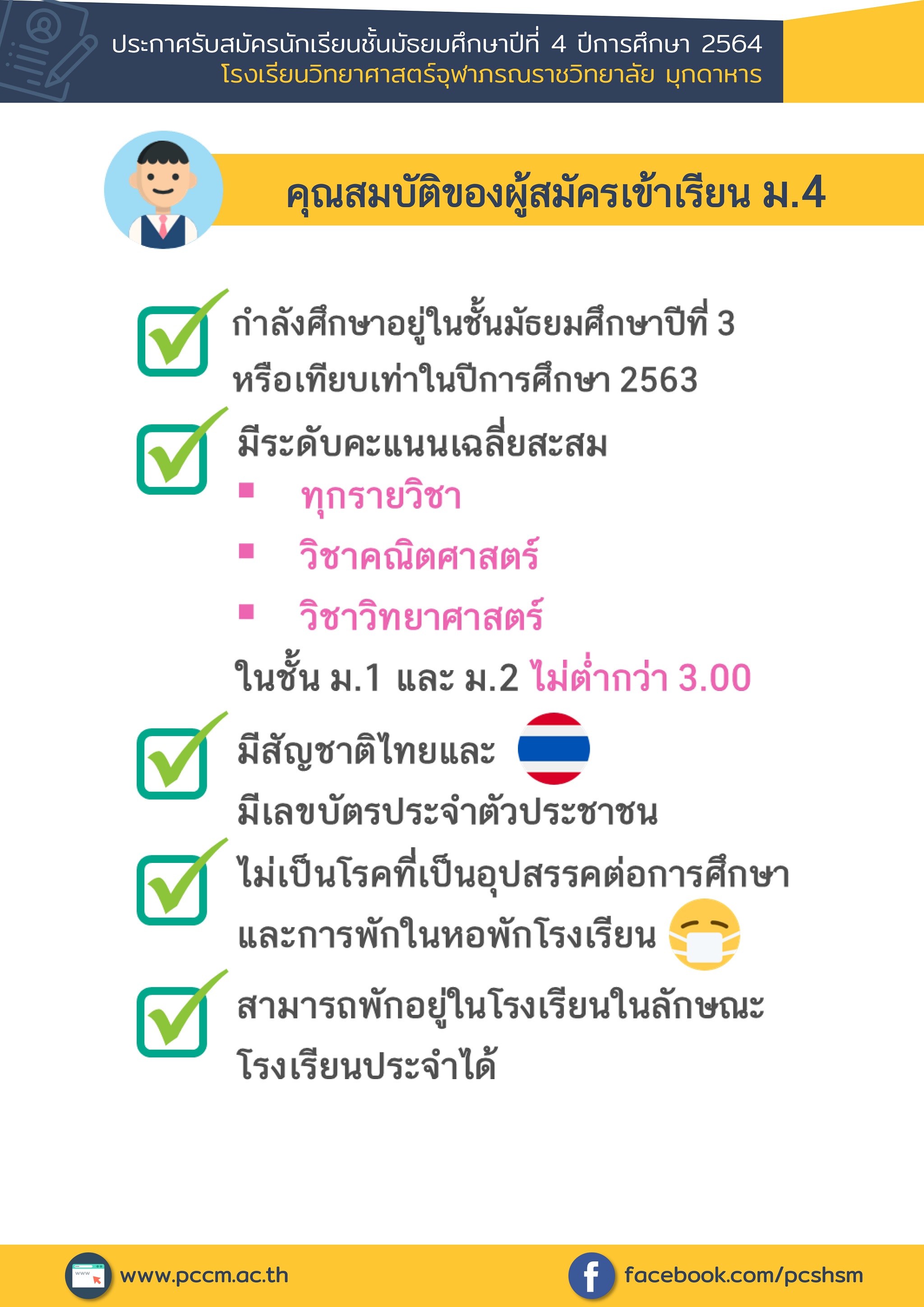 - ระดับคะแนนสะสมรวมทุกวิชาในชั้น ม.1 และ ม.2 ไม่ต่ำกว่า 3.00