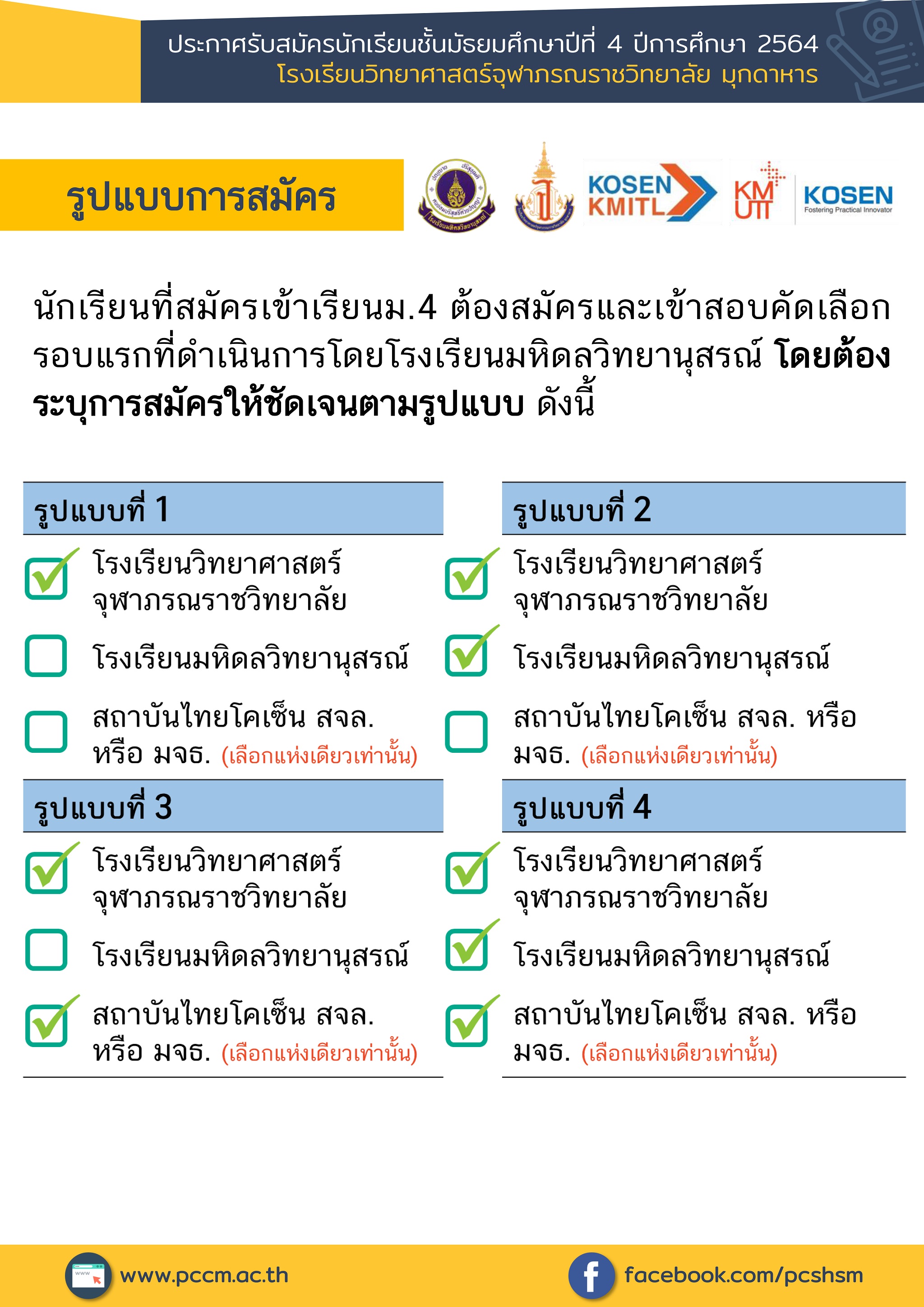 - ตรวจสอบผลการสมัครทางเว็บไซต์ www.pccm.ac.th