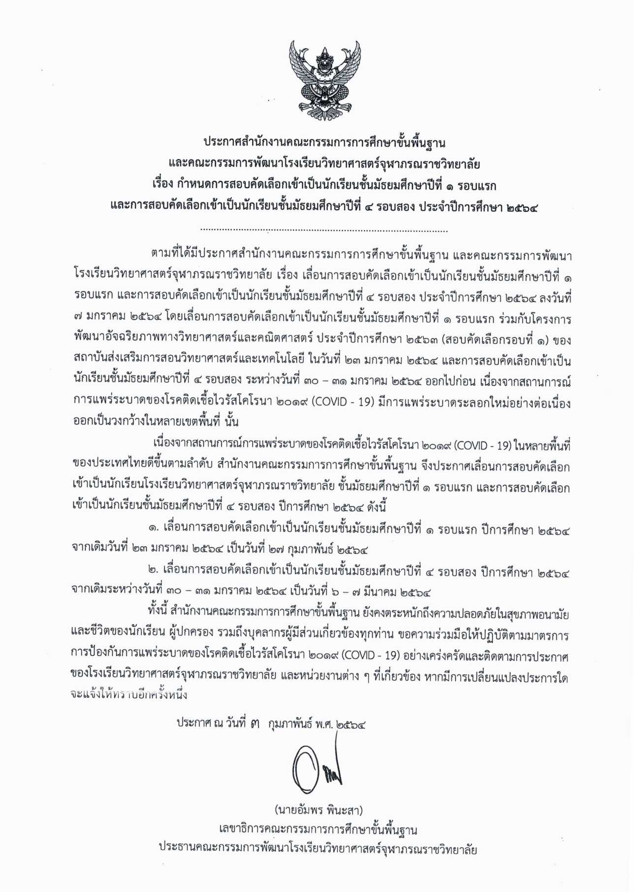 กำหนดการสอบเข้า ม.1 รอบแรก และการสอบเข้า ม4. รอบสอง ประจำปีการศึกษา 2564