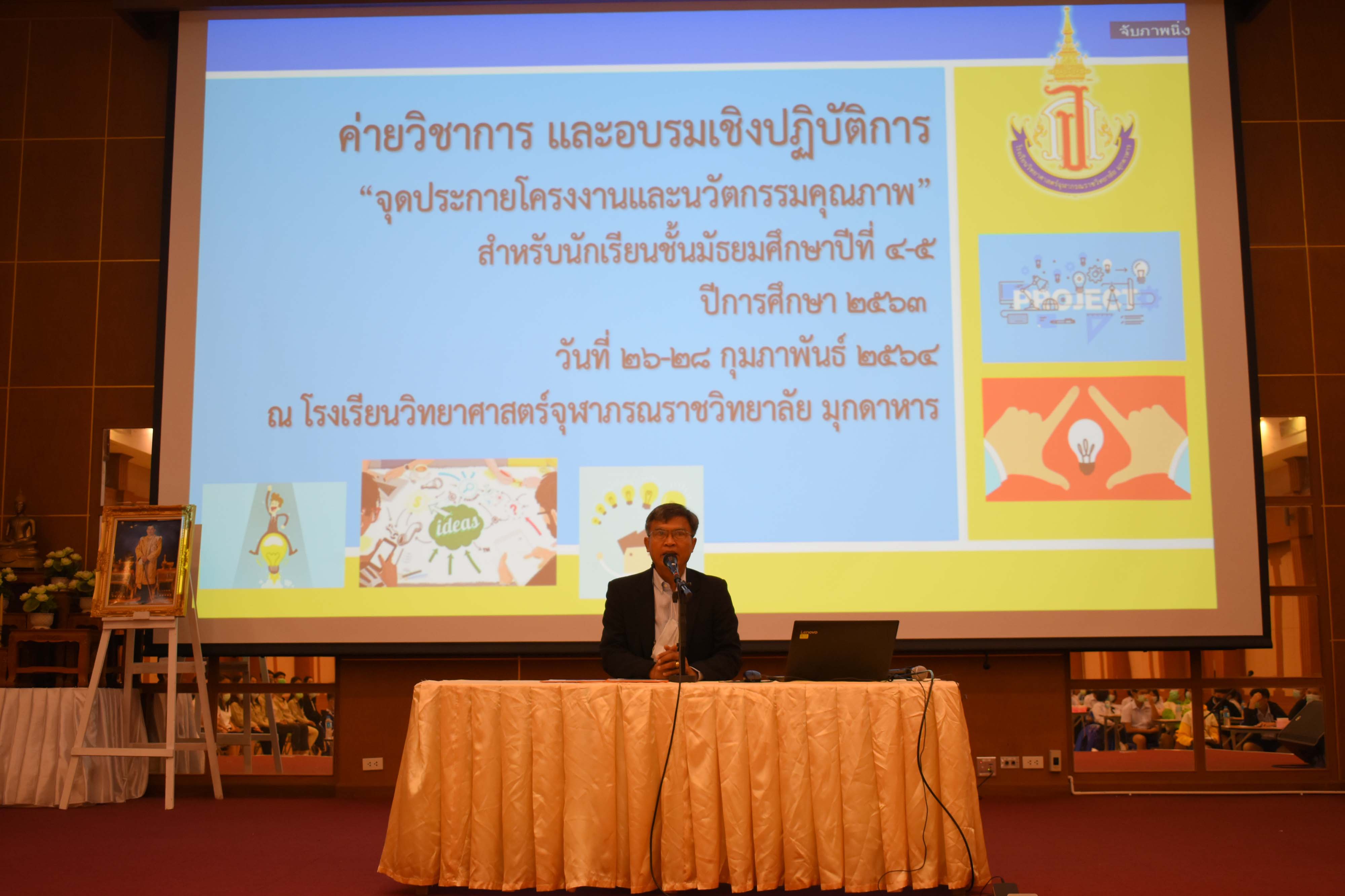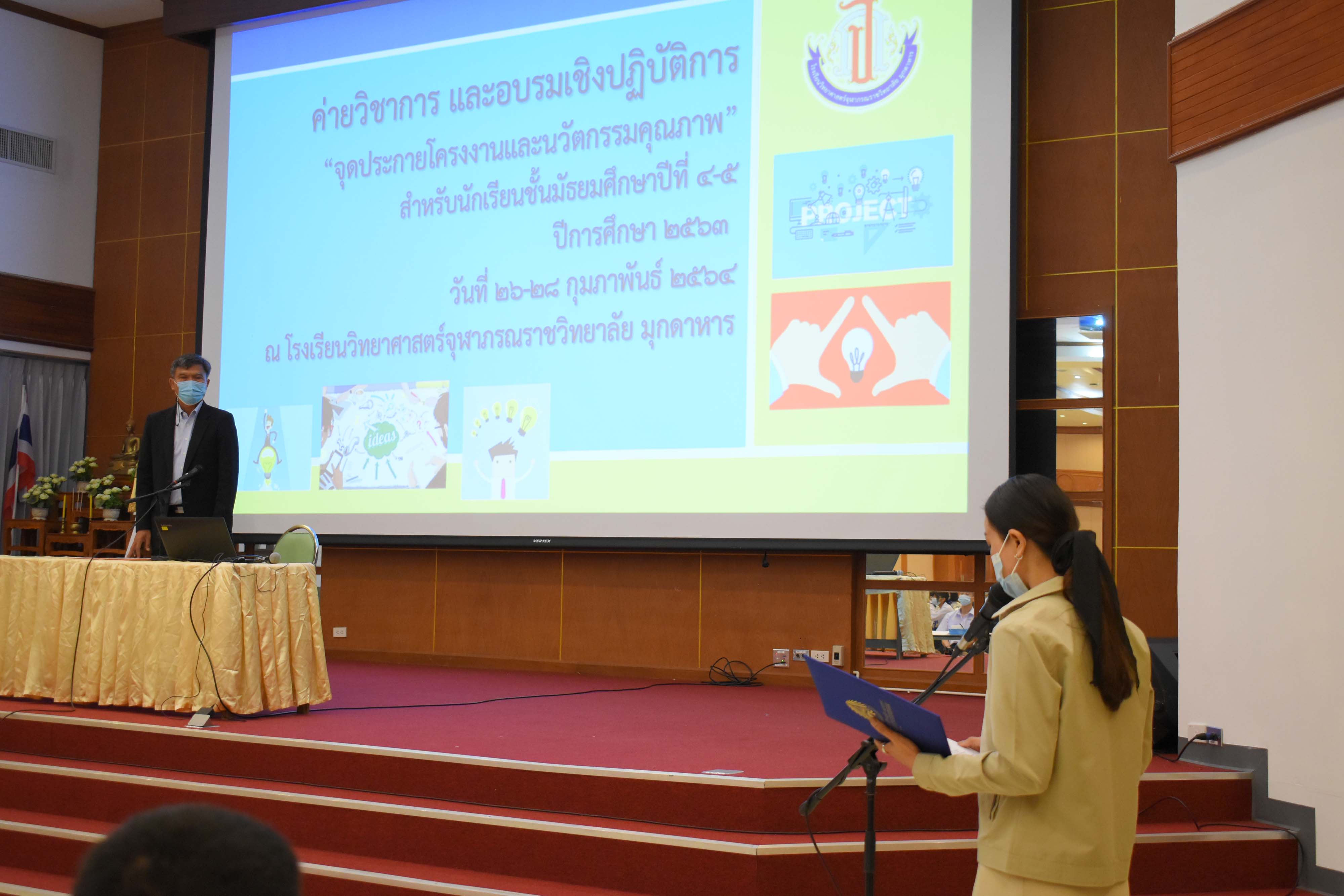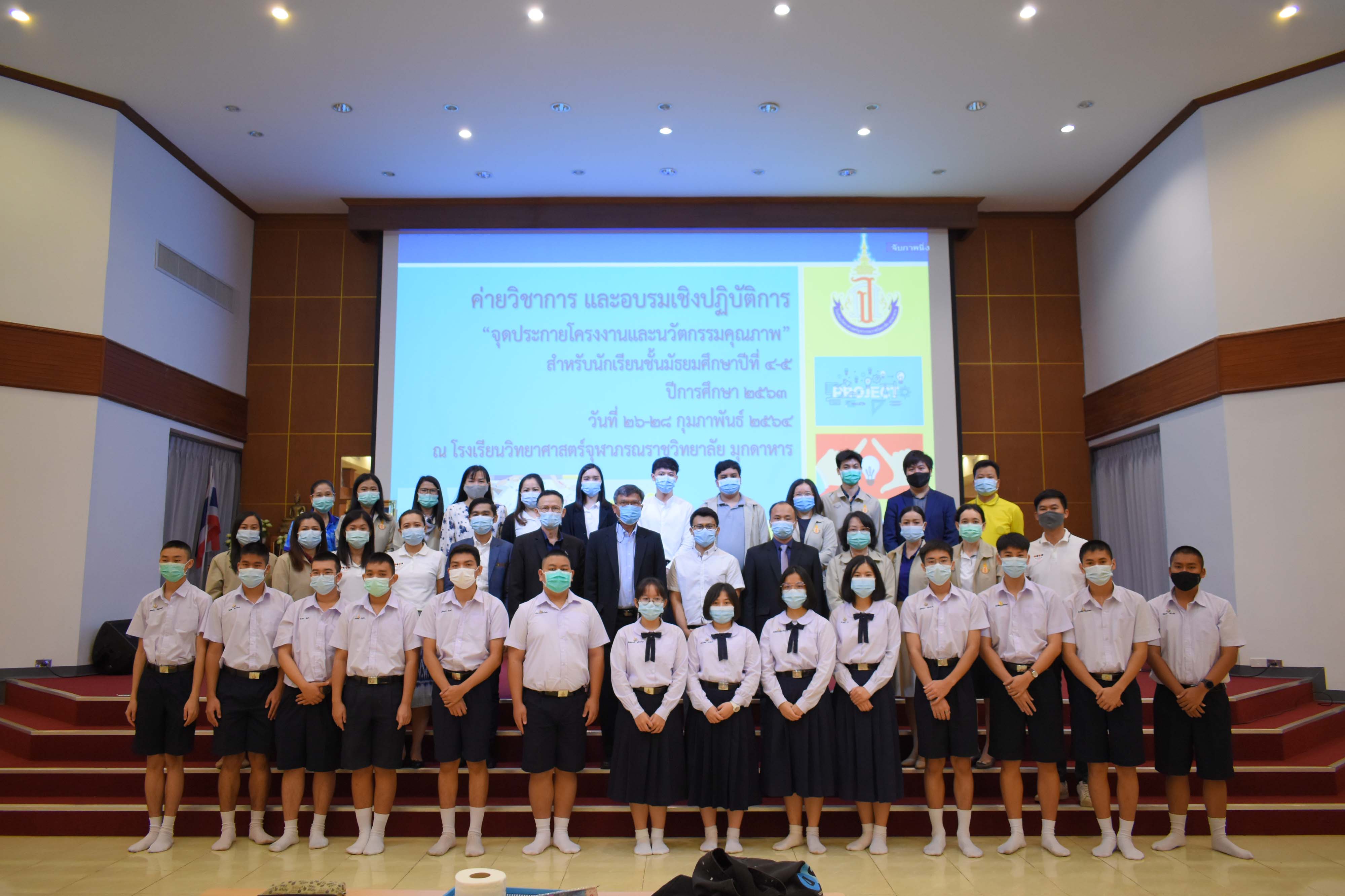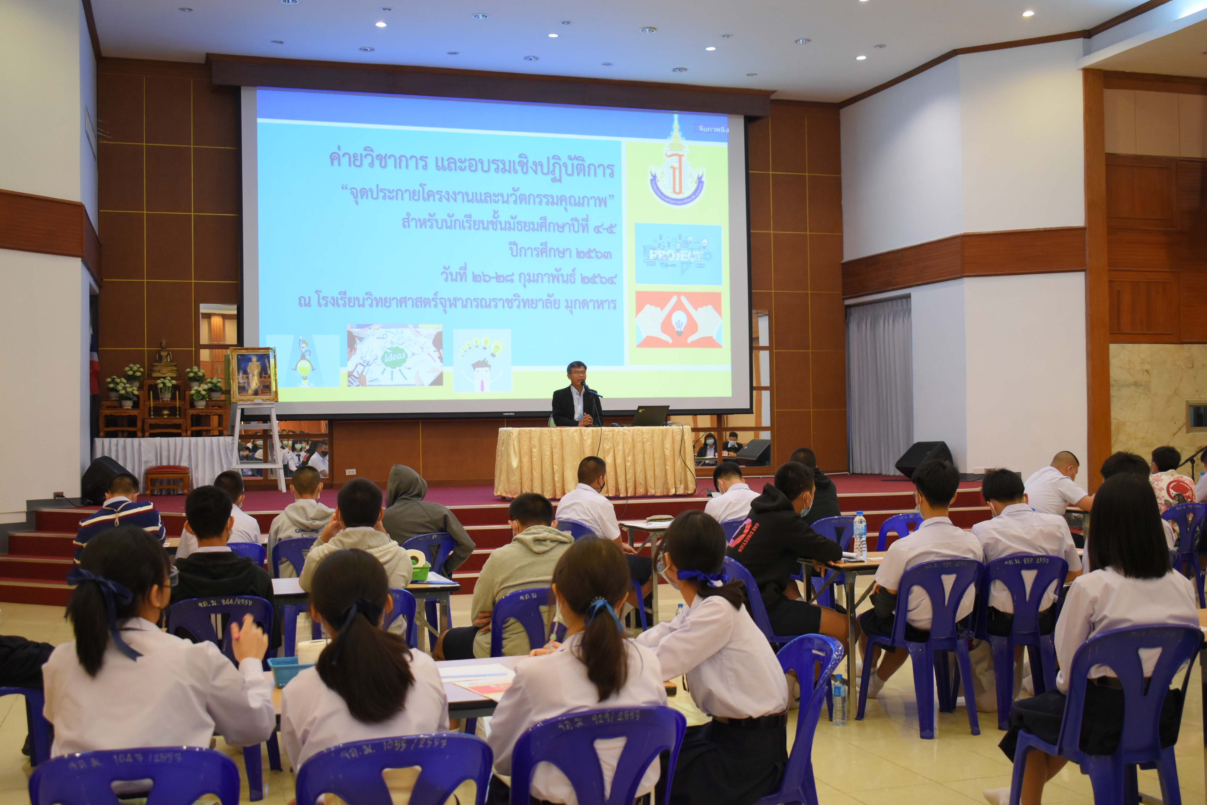 กลุ่มสาระการเรียนรู้วิทยาศาสตร์และเทคโนโลยี โรงเรียนวิทยาศาสตร์จุฬาภรณราชวิทยาลัย มุกดาหาร จัดกิจกรรมค่ายจุดประกายโครงงานและนวัตกรรมสำหรับนักเรียนชั้น ม.4 และ ม.5 ในวันที่ 26-28 กุมภาพันธ์ 2564 โดยได้เชิญวิทยากร จากโรงเรียนวิทยาศาสตร์จุฬาภรณราชวิทยาลัย เพชรบุรี โรงเรียนวิทยาศาสตร์จุฬาภรณราชวิทยาลัย ชลบุรี และโรงเรียนวิทยาศาสตร์จุฬาภรณราชวิทยาลัย ปทุมธานี ดังนี้ คุณครูศักดิ์นรินทร์ จันทร์นาค ครูคณิตศาสตร์ คุณครูชิตพงศ์ เหนือเกาะหวาย ครูคอมพิวเตอร์ และคุณครูขุนทอง คล้ายทอง ครูวิทยาศาสตร์ วิทยากรทั้ง 3 ท่าน มีผลงานเป็นครูที่ปรึกษาโครงงานนักเรียนที่มีคุณภาพ