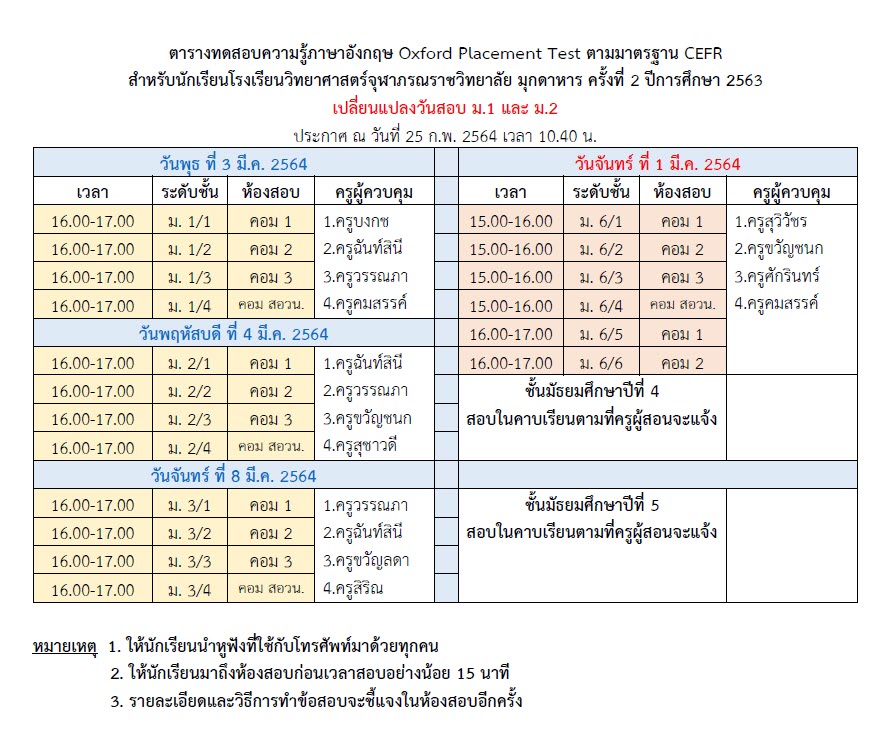 ตารางการทดสอบความรู้ภาษาอังกฤษ Oxford Placement Test ตามมาตรฐาน CEFR ครั้งที่ 2 ปีการศึกษา 2563