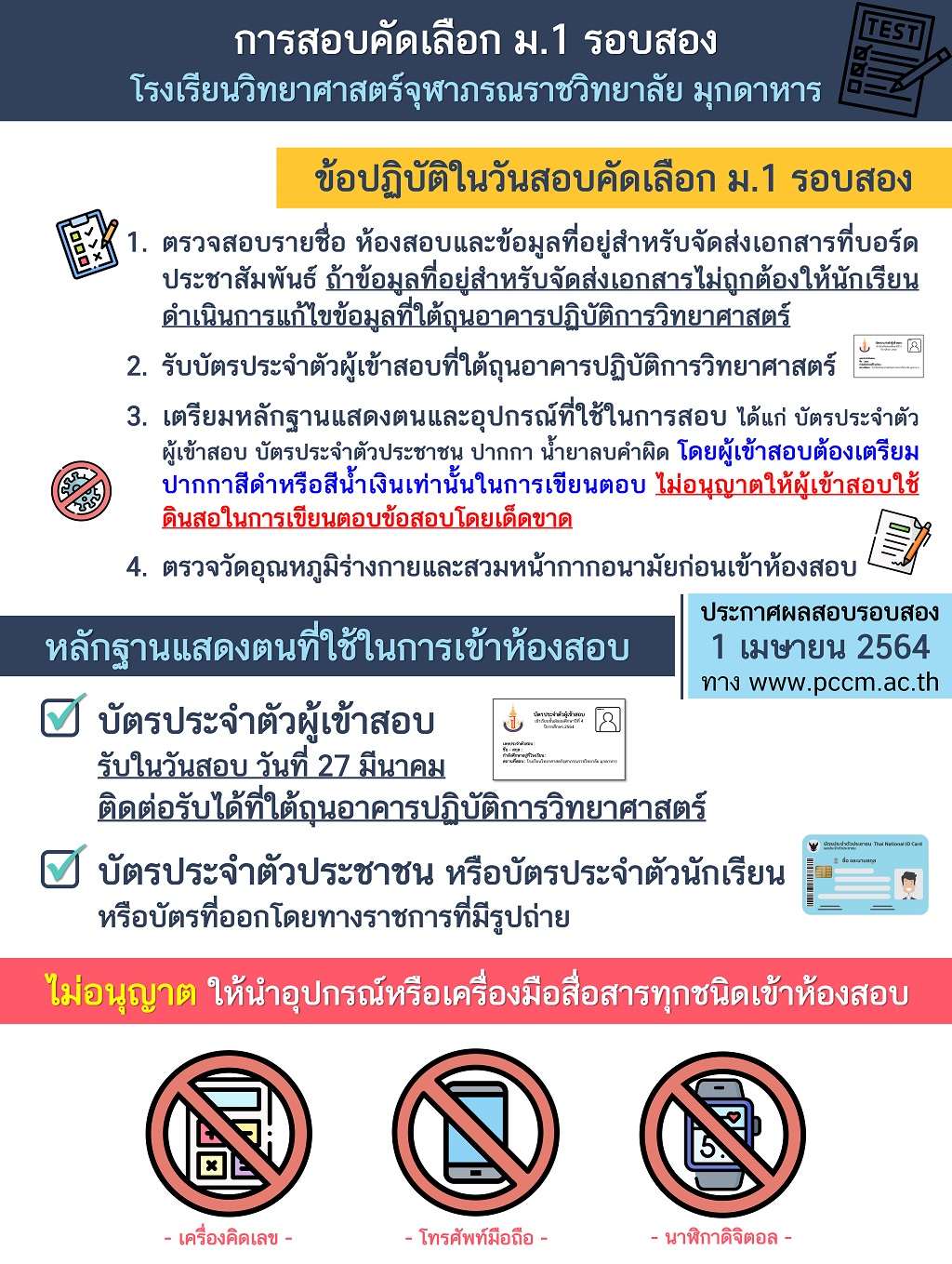 โรงเรียนวิทยาศาสตร์จุฬาภรณราชวิทยาลัย มุกดาหาร ได้ดำเนินการสอบคัดเลือกนักเรียนเข้าศึกษาต่อระดับชั้นมัธยมศึกษาปีที่ 1 (รอบสอง) ปีการศึกษา 2564 ในวันเสาร์ที่ 27 เดือนมีนาคม พ.ศ.2564 นี้ แต่เนื่องด้วยสถานการณ์การแพร่ระบาดของโรคติดเชื้อไวรัสโคโรนา 2019 (COVID 19) ได้มีผู้ติดเชื้อในจังหวัดมุกดาหารแล้วนั้น โรงเรียนวิทยาศาสตร์จุฬาภรณราชวิทยาลัย มุกดาหาร จึงมีความห่วงใยต่อสวัสดิภาพของนักเรียน ผู้ปกครองนักเรียน ข้าราชการครูและบุคลากรทางการศึกษา จึงกำหนดแนวปฏิบัติ ดังนี้