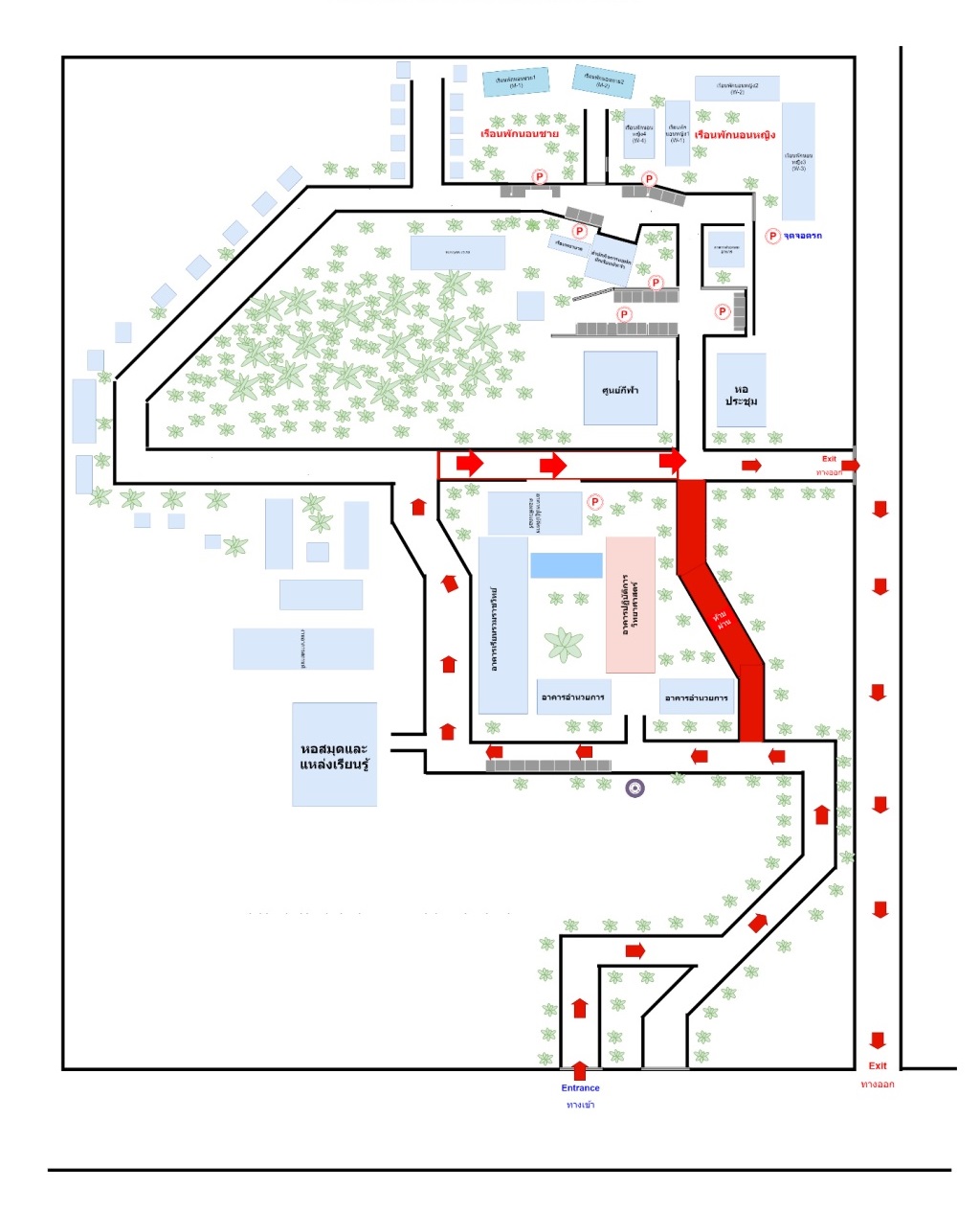 ขอความร่วมมือผู้ปกครองใช้เส้นทางเดินรถตามลูกศรสีแดงในแผนผังดังรูปทั้งการเดินทางเข้าและออกจากโรงเรียน เพื่อให้การสัญจรภายในโรงเรียนเป็นไปด้วยความสะดวกรวดเร็วและปลอดภัย