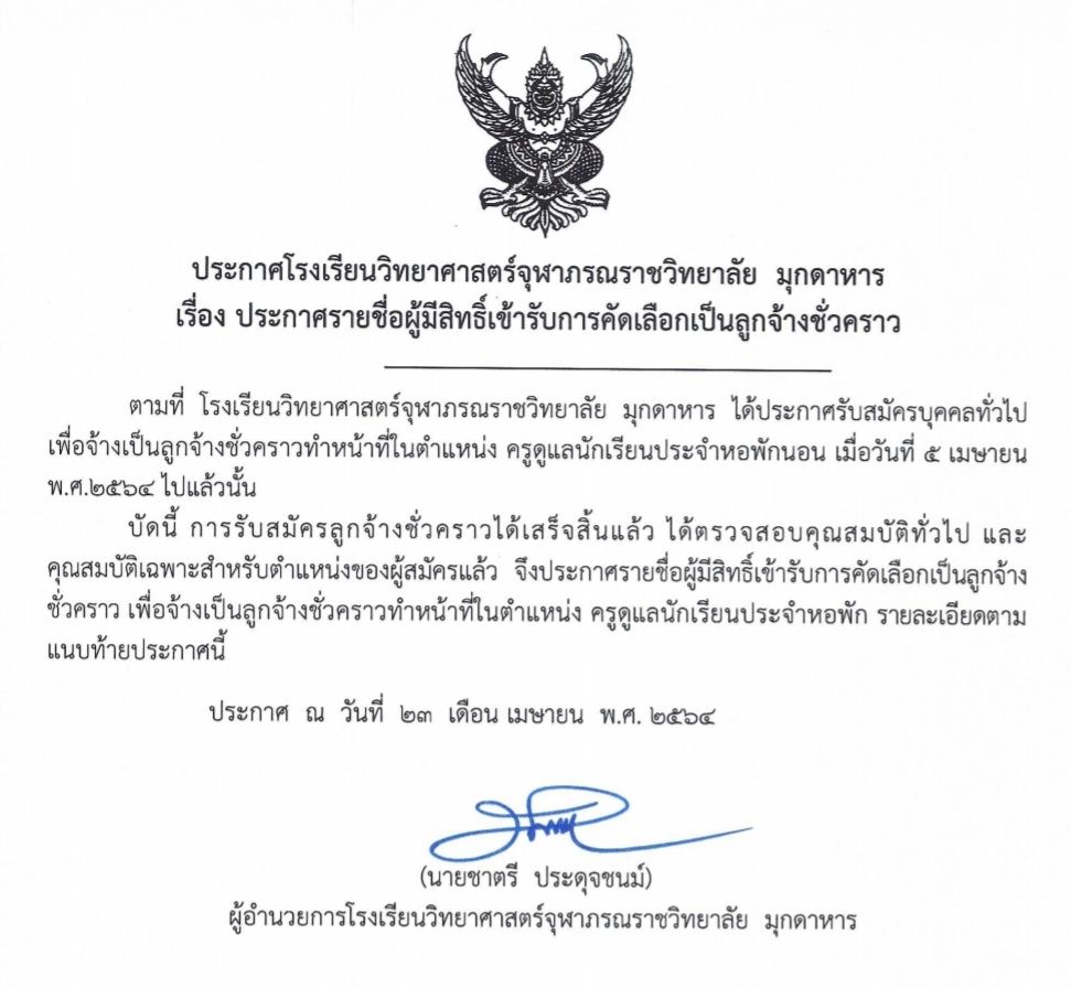 ประกาศรายชื่อผู้เข้ารับการคัดเลือกลูกจ้างชั่วคราว ครูหอพัก