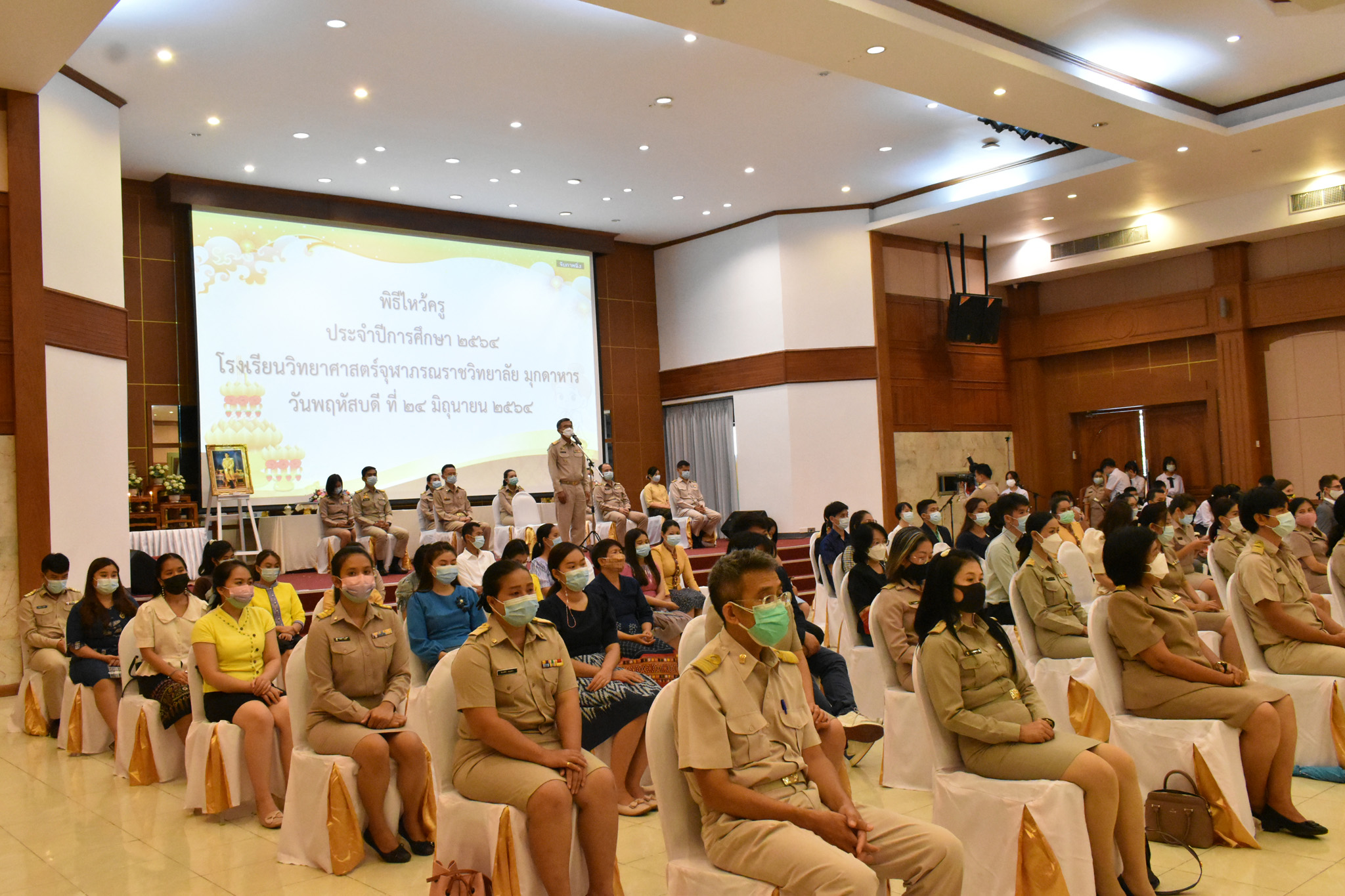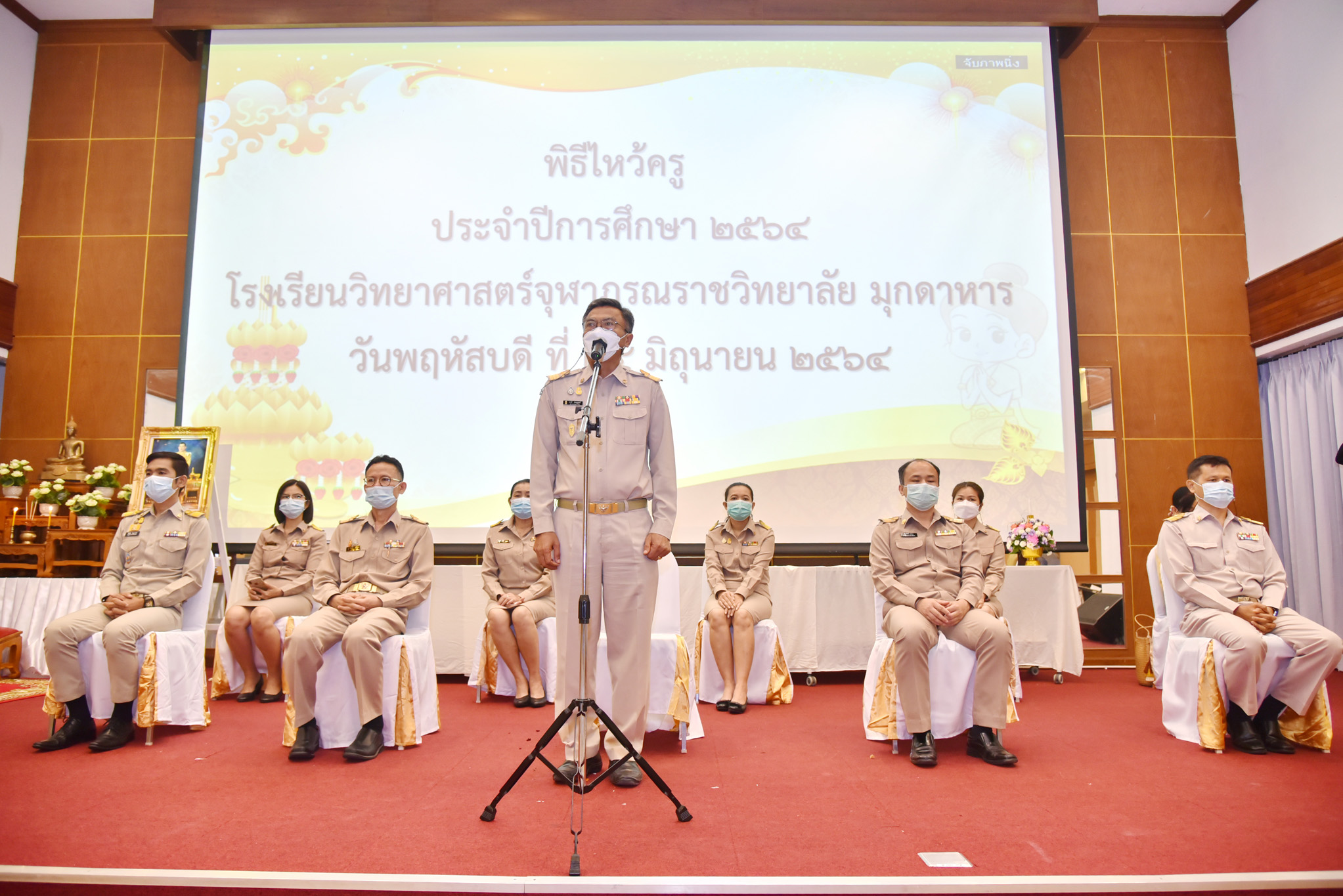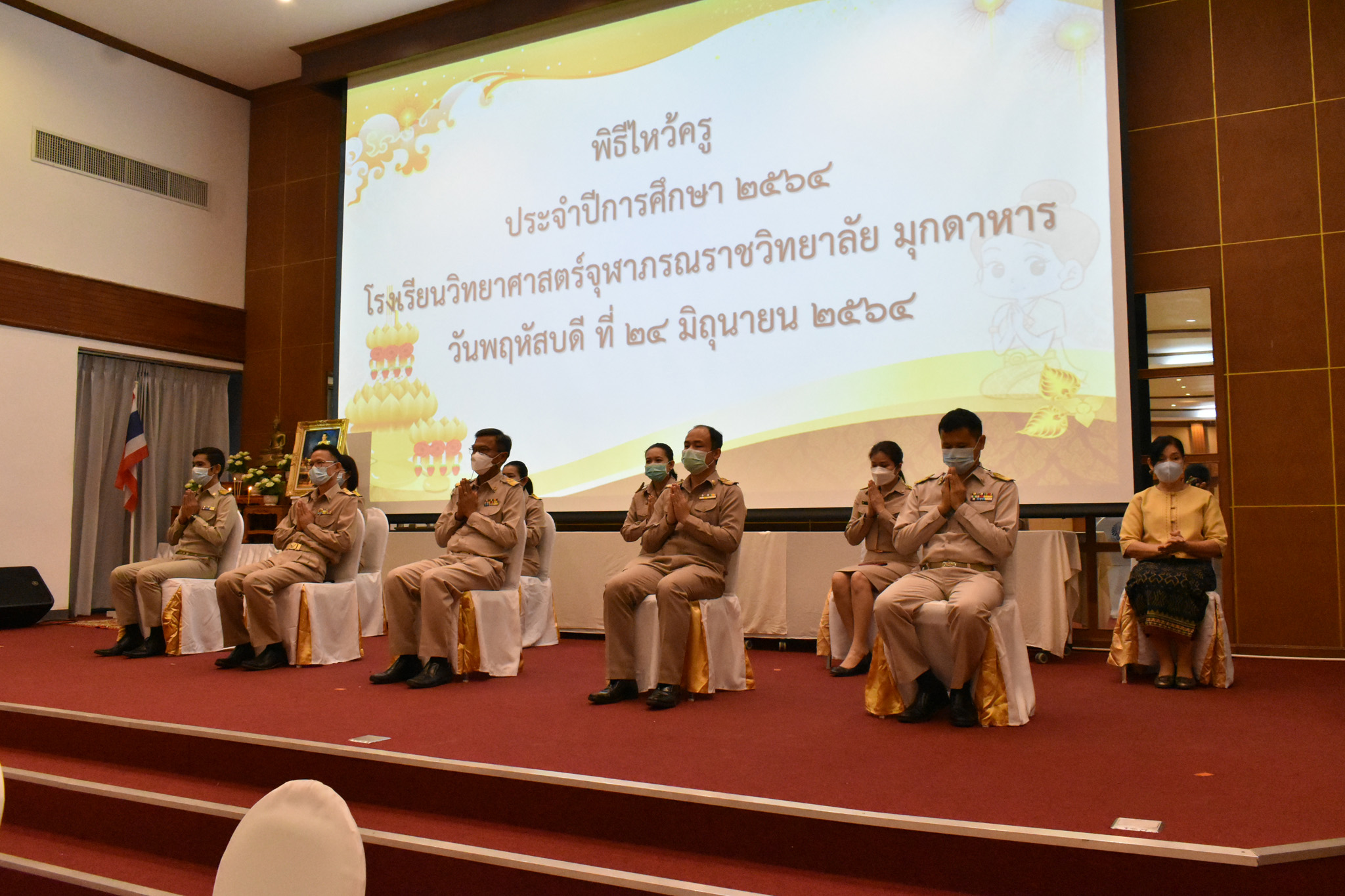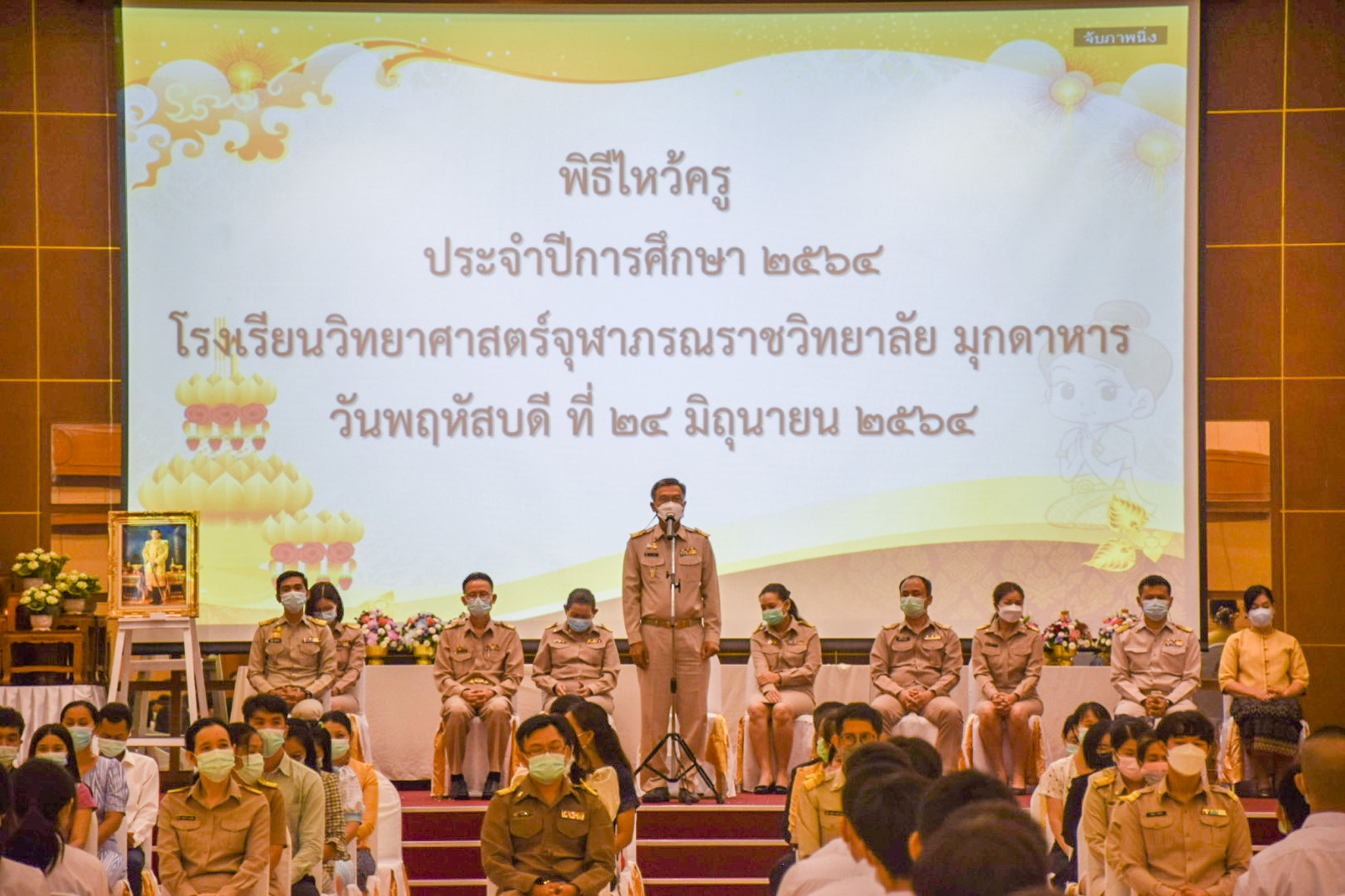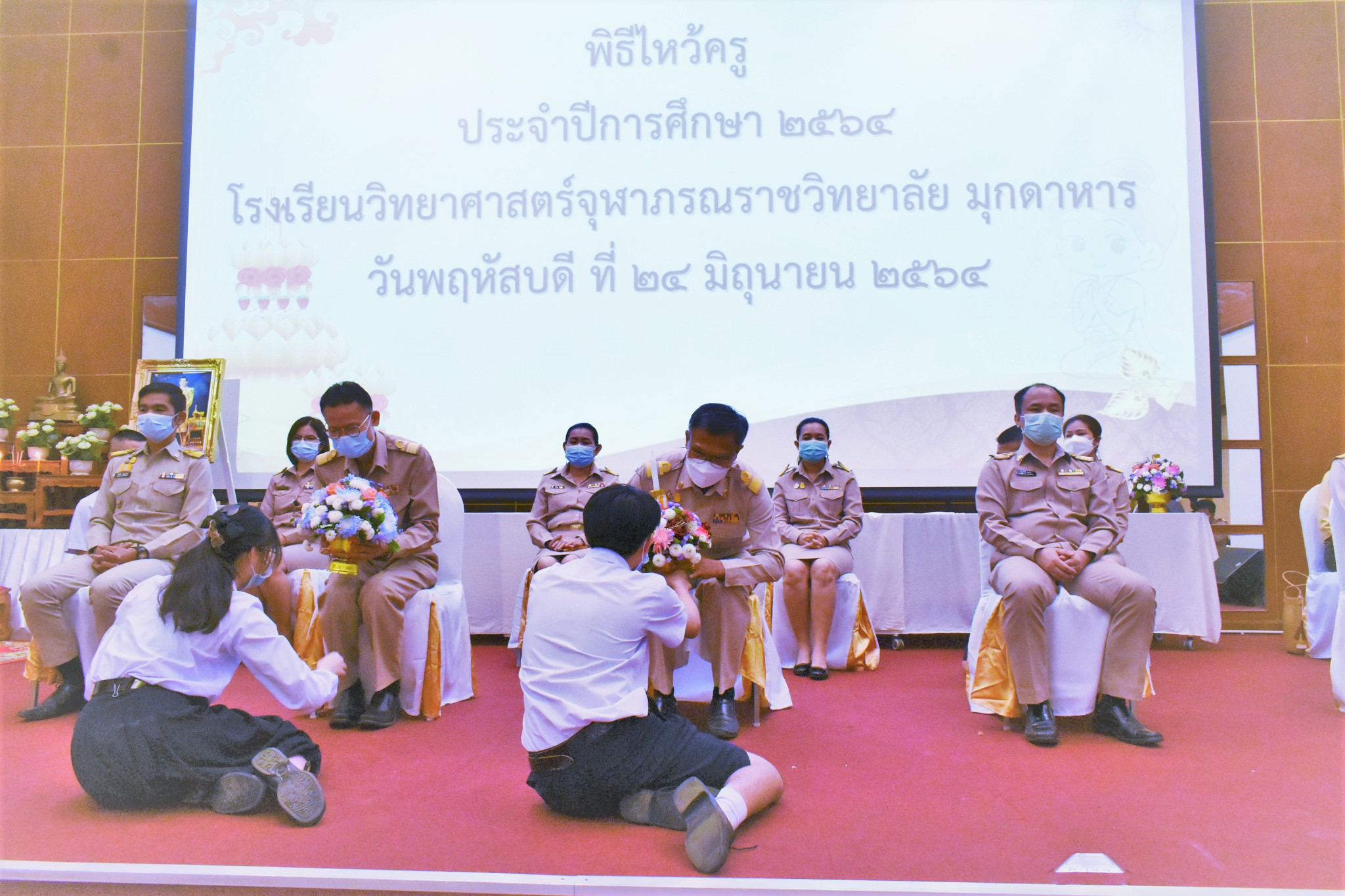 โรงเรียนวิทยาศาสตร์จุฬาภรณราชวิทยาลัย มุกดาหาร จัดกิจกรรมพิธีไหว้ครู ประจำปีการศึกษา 2564 ในวันที่ 24 มิถุนายน 2564 เวลา 15.00-17.00 น. บนอาคารหอประชุมโรงเรียน โดยในการจัดกิจกรรมได้มีการกำหนดมาตรการควบคุมโรคอย่างเคร่งครัด ได้จัดให้มีการจำกำดจำนวนนักเรียนที่เข้าร่วมกิจกรรม