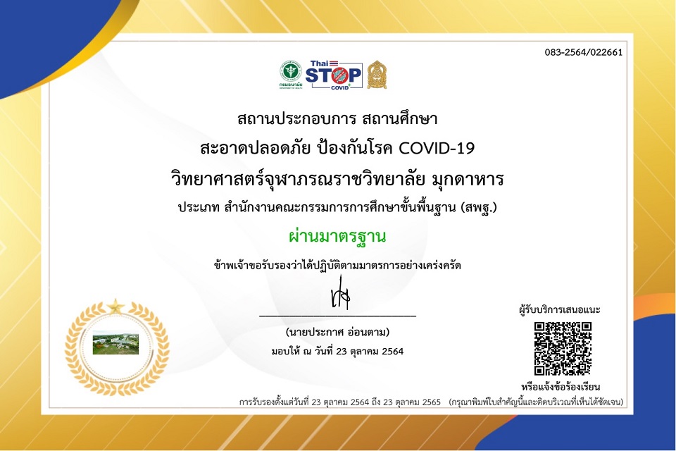 โรงเรียนวิทยาศาสตร์จุฬาภรณราชวิทยาลัย มุกดาหาร ได้รับการรับรองสถานประกอบการ สถานศึกษา สะอาดปลอดภัย ป้องกันโรค COVID-19