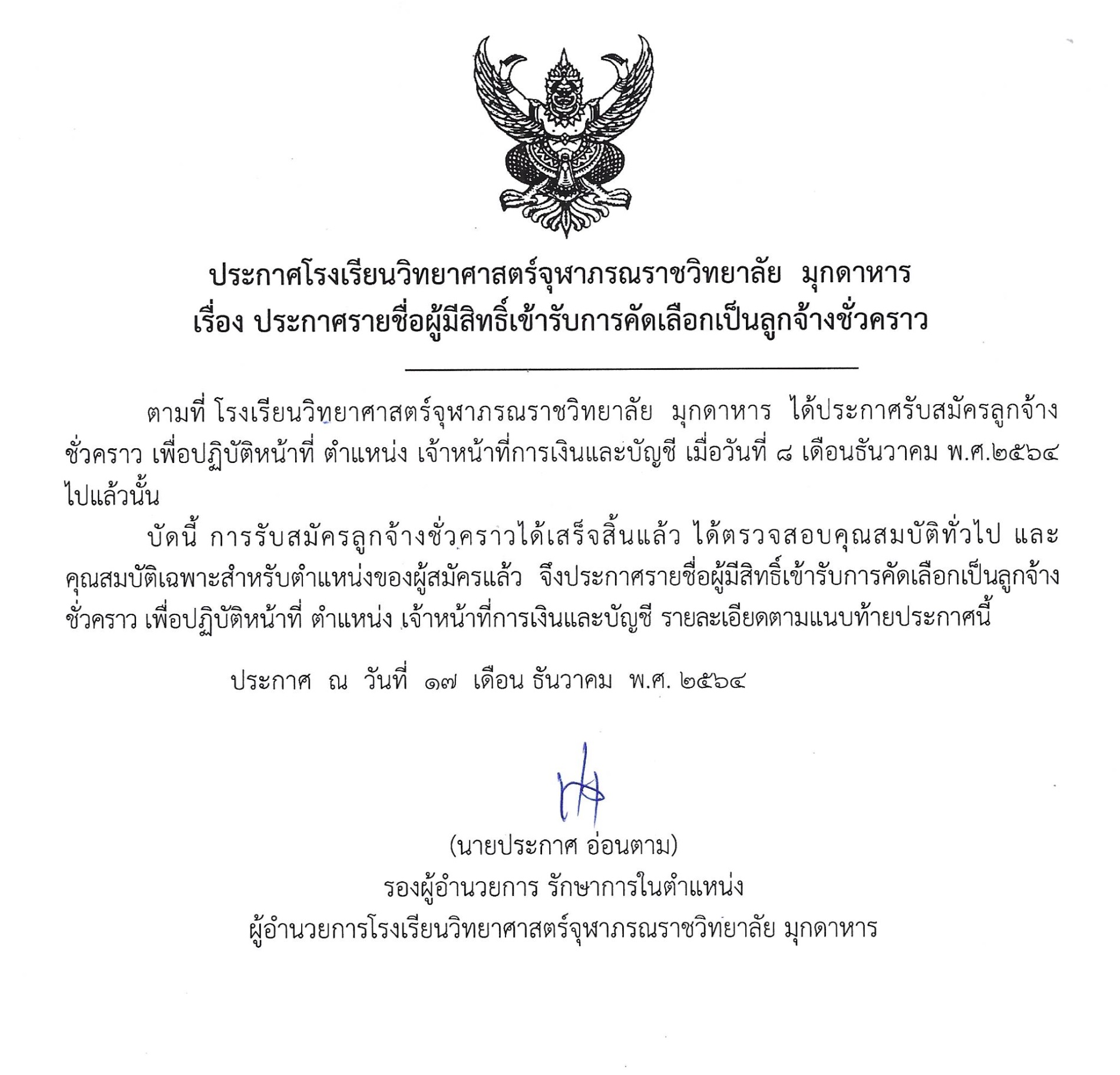 ประกาศรายชื่อผู้มีสิทธิ์เข้ารับการคัดเลือกเป็นลูกจ้างชั่วคราว ตำแหน่งเจ้าหน้าที่การเงิน (สอบ 17 ธ.ค.2564 ณ ห้องประชุม 2 อาคารอำนวยการ)