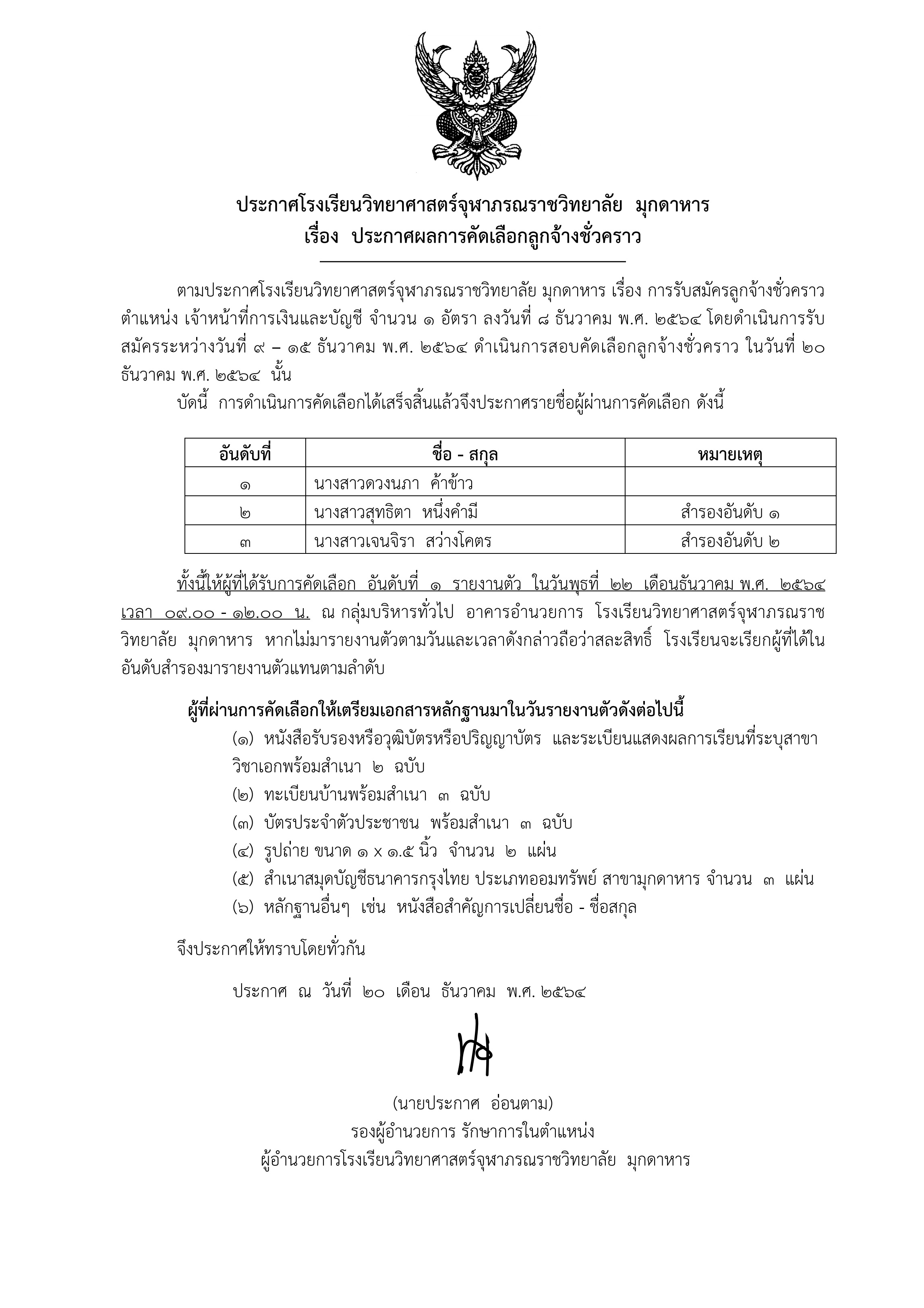 โรงเรียนวิทยาศาสตร์จุฬาภรณราชวิทยาลัย มุกดาหาร ประกาศผลการคัดเลือกลูกจ้างชั่วคราว ตำแหน่งเจ้าหน้าที่การเงิน