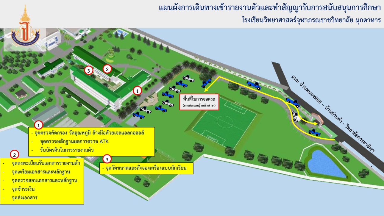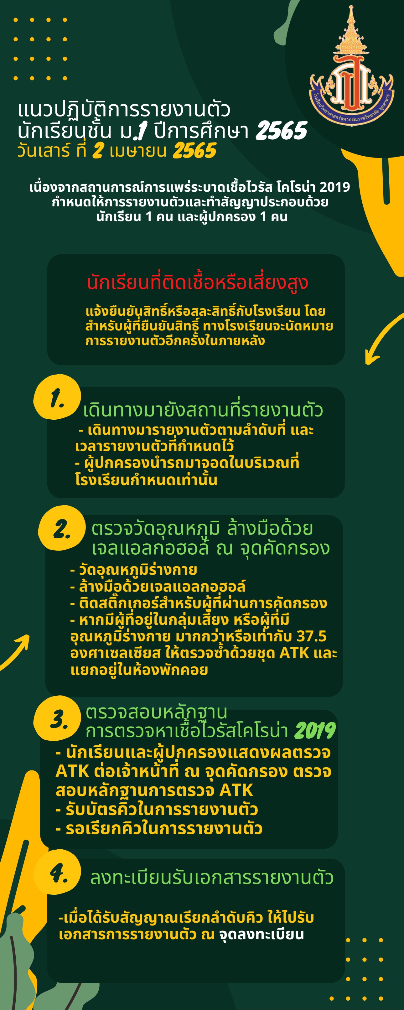3) นักเรียน และผู้ปกครอง ให้ตรวจหาเชื้อไวรัสโคโรนา 2019 ด้วยวิธีการใช้ชุดตรวจ ATK จากสถานพยาบาลของรัฐ หรือเอกชน หรือตรวจด้วยตนเอง หากตรวจ Antigen Test Kit (ATK) ด้วยตนเองให้ดำเนินการตามแบบฟอร์มที่โรงเรียนกำหนด ก่อนวันรายงานตัวไม่เกิน 48 ชั่วโมง และนำส่งหลักฐานรับรองผลการตรวจ ที่แสดงผลการตรวจเชื้อไวรัสโคโรนา 2019 (COVID - 19) ต่อเจ้าหน้าที่ ณ จุดคัดกรองหน้าอาคารอำนวยการ