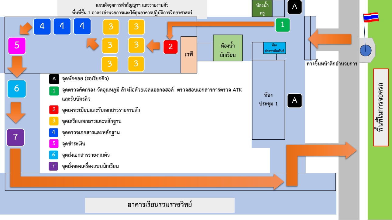 10) หลังจากรายงานตัวและมอบตัว นักเรียนและผู้ปกครองวัดตัวชุดนักเรียน ชุดพละ รองเท้าและอื่นๆบริเวณทางเชื่อมอาคารปฏิบัติการวิทยาศาสตร์และอาคารเรียนรวมราชวิทย์ ตามลำดับบัตรคิว