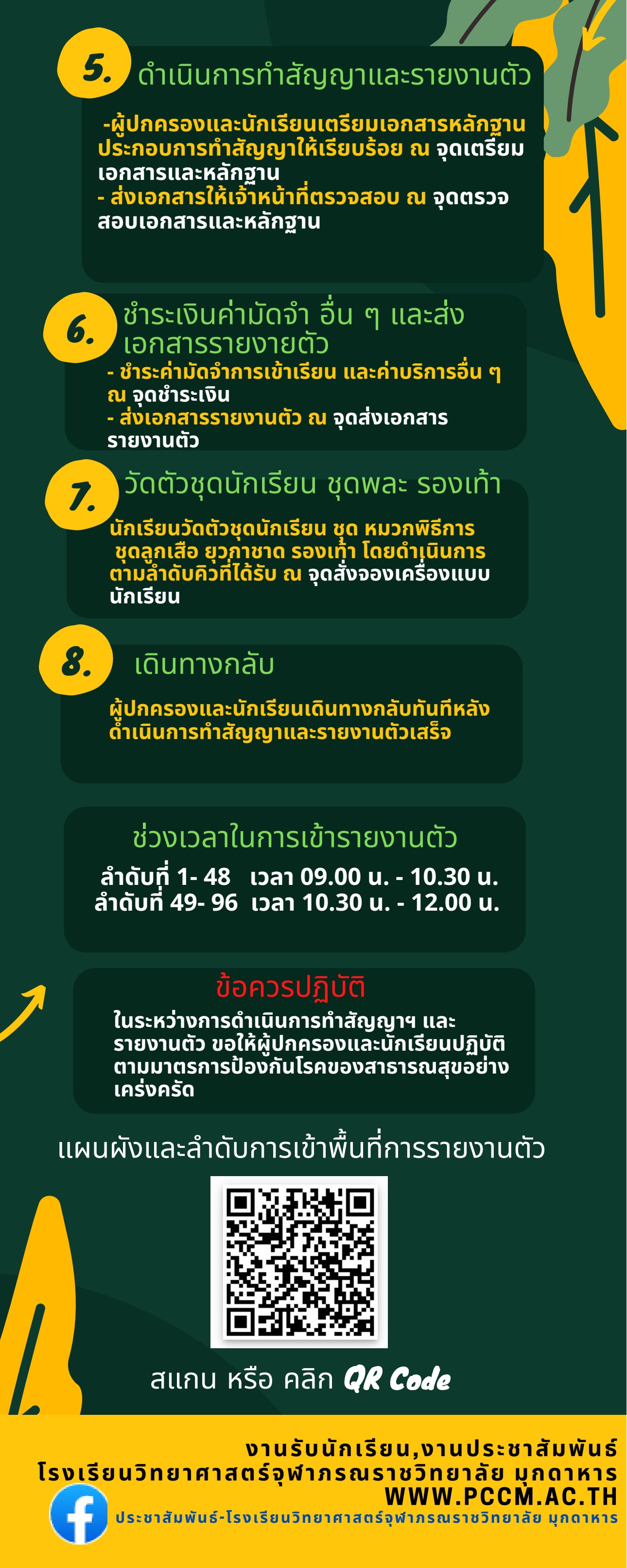 4) นักเรียนผู้ และปกครองทุกคนต้องสวมหน้ากากอนามัย ในวันรายงานตัว ตลอดระยะเวลาของการรายงานตัว