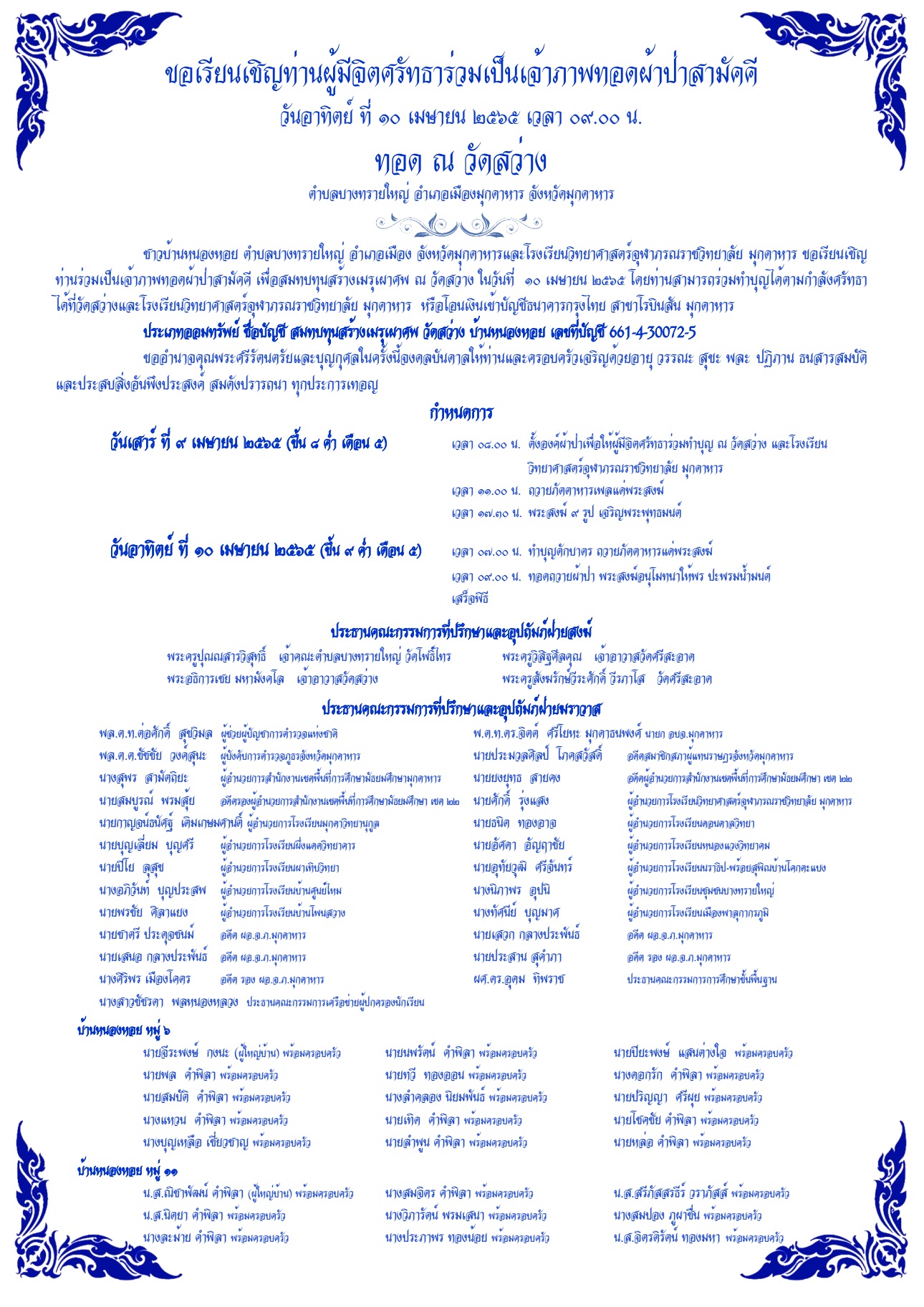 - วัน เสาร์ ที่ 9 เมษายน 2565 : ตั้งกองผ้าป่าที่วัดสว่าง บ้านหนองหอย และโรงเรียนวิทยาศาสตร์จุฬาภรณราชวิทยาลัย มุกดาหาร
