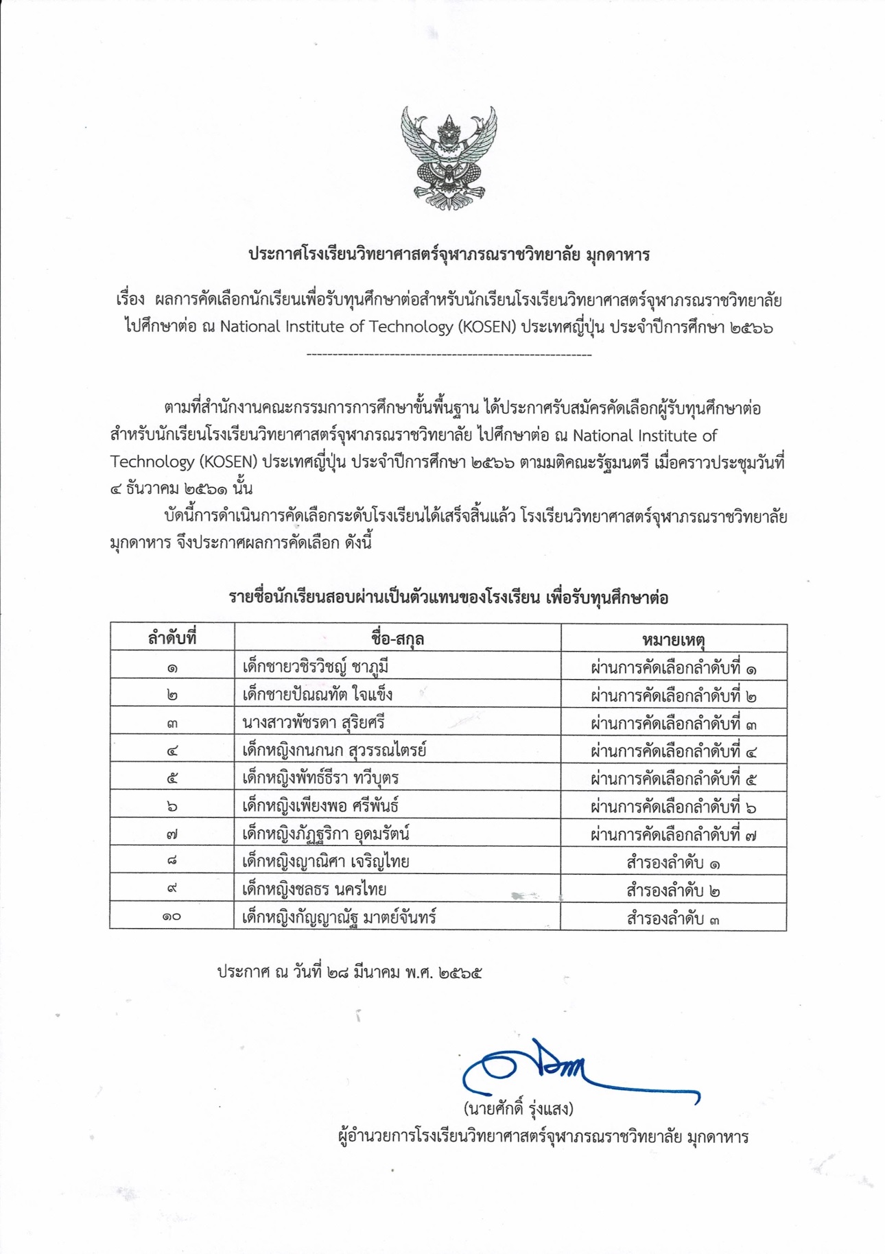 ประกาศผลการคัดเลือกนักเรียนเพื่อเข้ารับทุนศึกษาต่อสำหรับนักเรียนโรงเรียนวิทยาศาสตร์จุฬาภรณราชวิทยาลัยไปศึกษาต่อที่ KOSEN