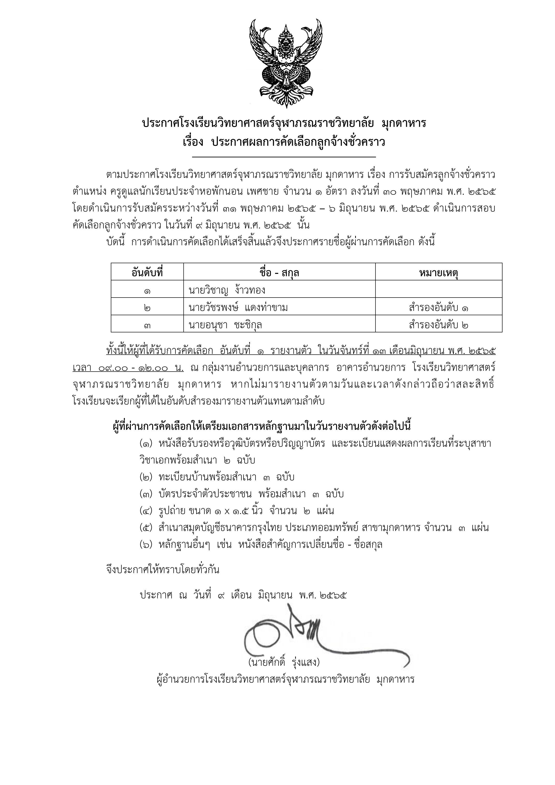 ประกาศผลการคัดเลือกลูกจ้างชั่วคราว ตำแหน่ง ครูดูแลนักเรียนประจำเรือนพักนอนชาย