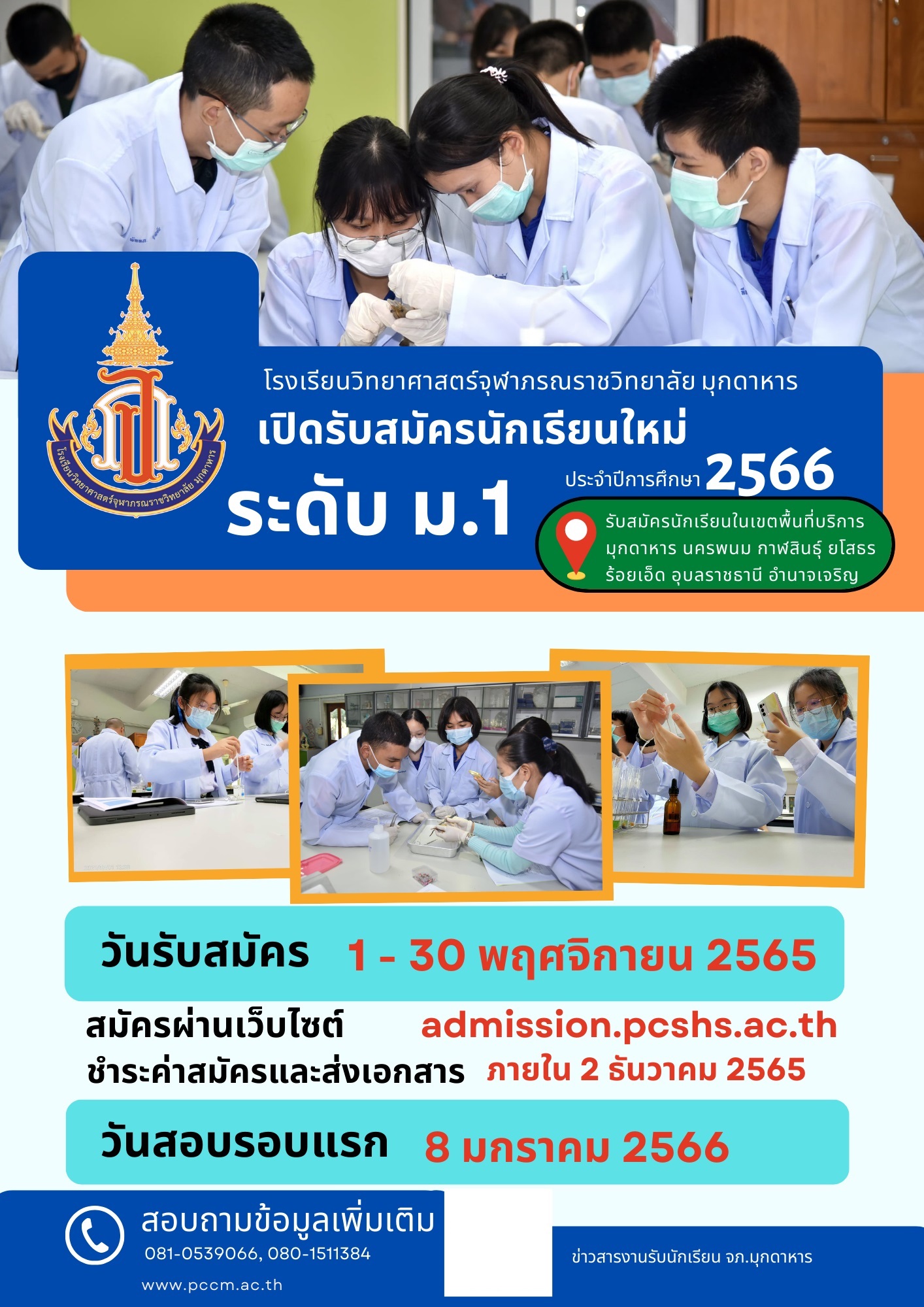 ประกาศรับสมัครสอบคัดเลือกเข้าเป็นนักเรียนระดับชั้นมัธยมศึกษาปีที่ 1 ปีการศึกษา 2566 โรงเรียนวิทยาศาสตร์จุฬาภรณราชวิทยาลัย มุกดาหาร