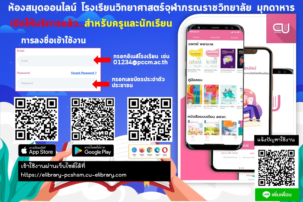 โปรแกรมห้องสมุดออนไลน์ CU-Library เป็นแอพลิเคชั่นสำหรับอ่านอีบุ๊ ค(E-Book) ซึ่งได้จัดหาสื่อความรู้จากสำนั กพิมพ์ชั้นนำ เพื่อให้บริการครู บุคลากร และนักเรียน โรงเรียนวิทยาศาสตร์จุ ฬาภรณราชวิทยาลัย มุกดาหารทุกคน ให้สามารถเข้าถึงความรู้ได้อย่ างง่ายบนฝ่ามือ ทุกที่ ทุกเวลา
