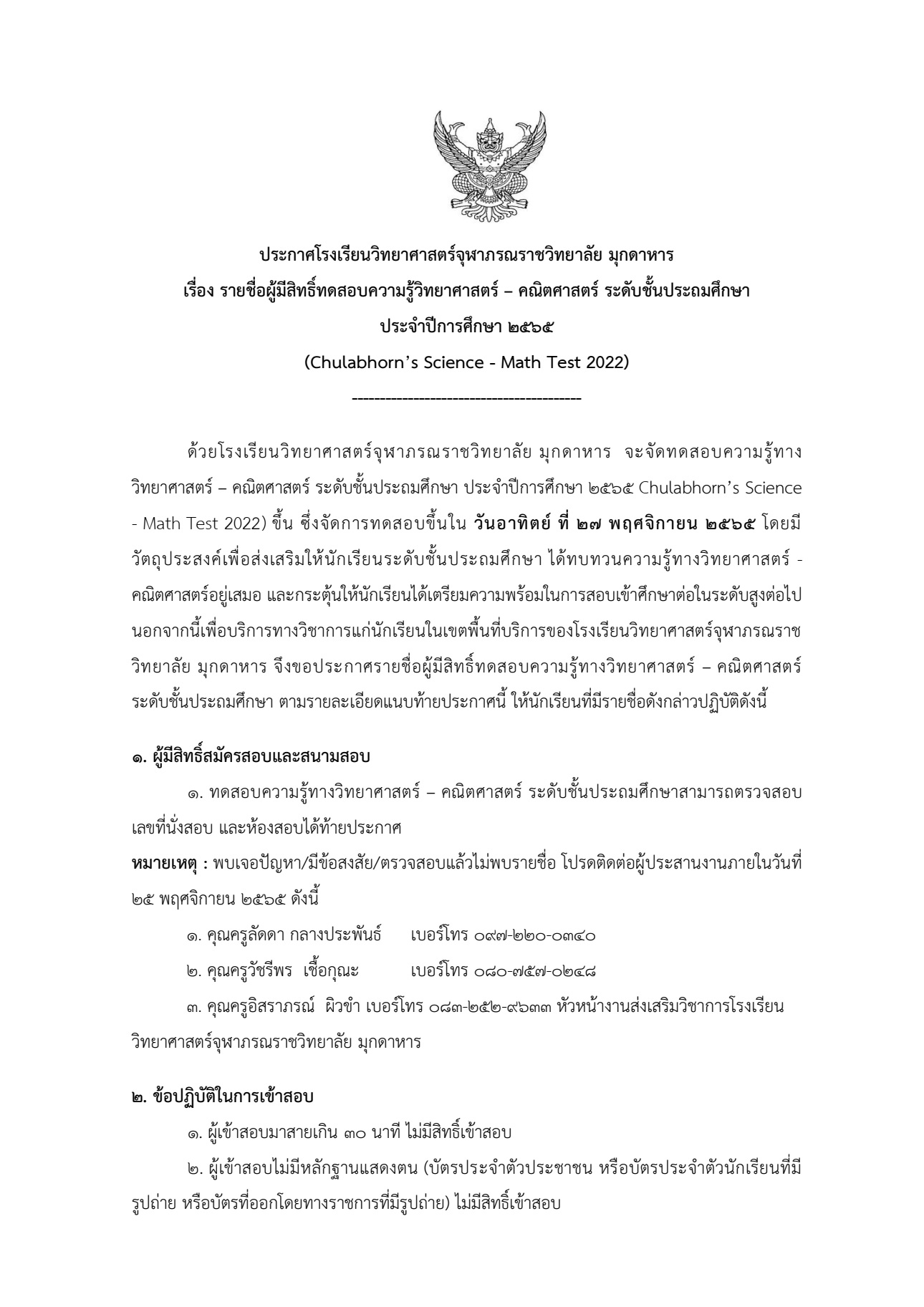 ประกาศรายชื่อผู้มีสิทธิ์ทดสอบความรู้วิทยาศาสตร์– คณิตศาสตร์ระดับชั้นประถมศึกษา ประจำปีการศึกษา 2565