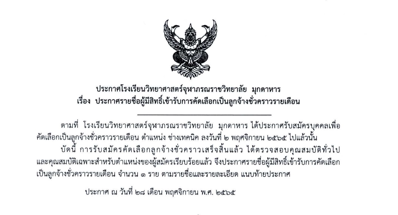 ประกาศรายชื่อผู้มีสิทธิ์เข้ารับการคัดเลือก เป็นลูกจ้างชั่วคราวรายเดือน ตำแหน่งช่างเทคนิค (สอบ 30 พ.ย. 2565)