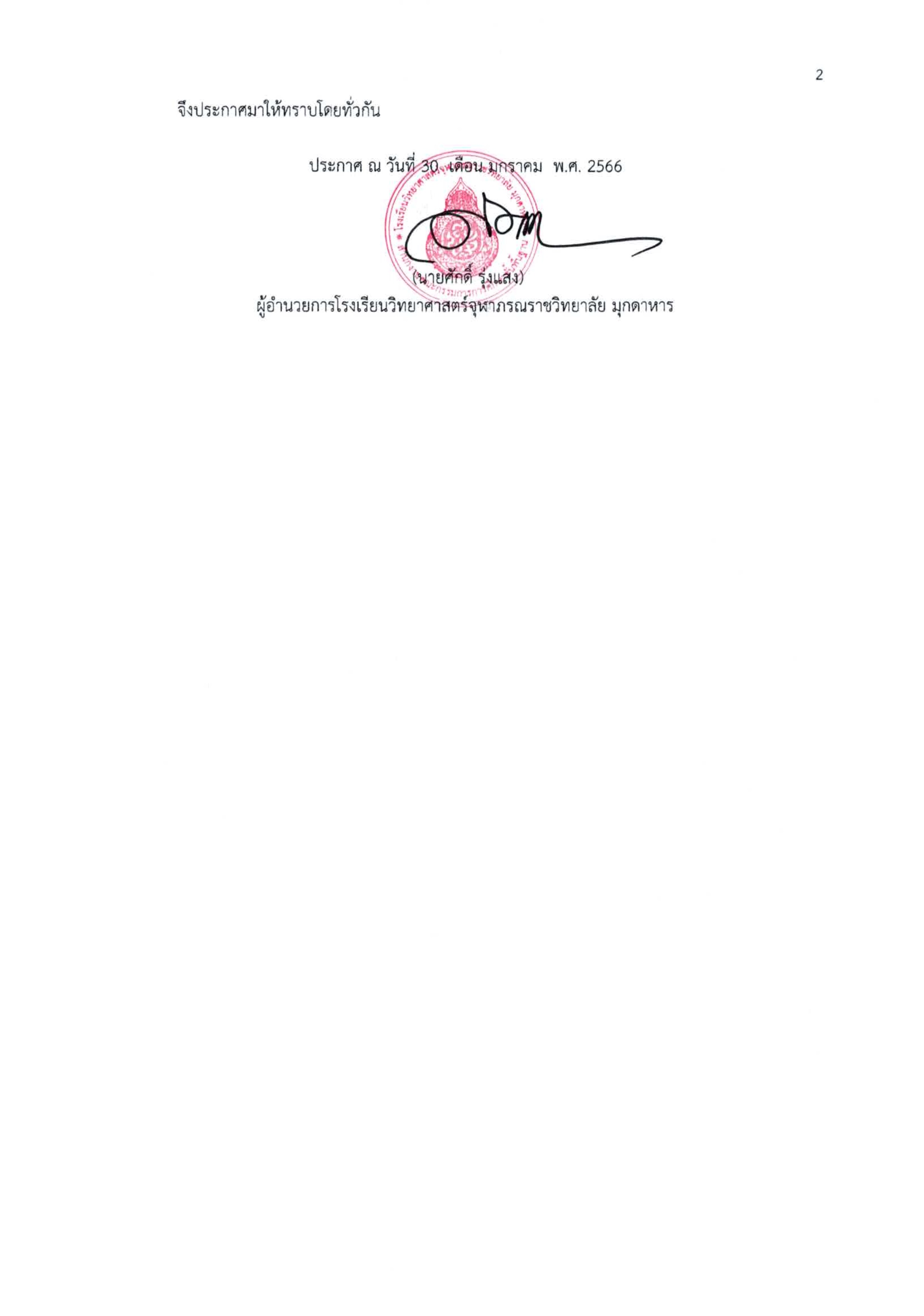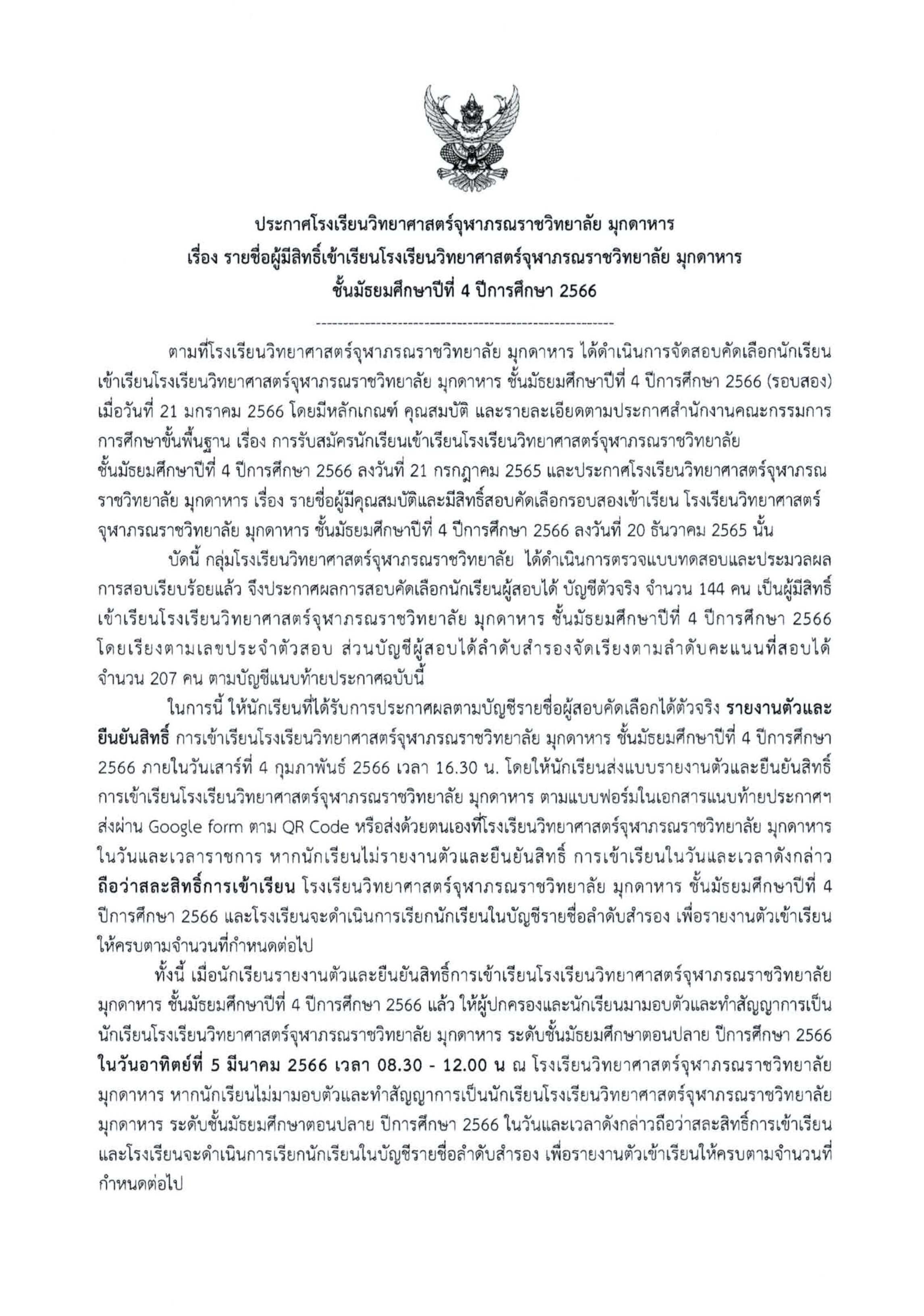 ประกาศรายชื่อผู้มีสิทธิ์เข้าเรียนชั้นมัธยมศึกษาปีที่ 4 โรงเรียนวิทยาศาสตร์จุฬาภรณราชวิทยาลัย มุกดาหาร ปีการศึกษา 2566