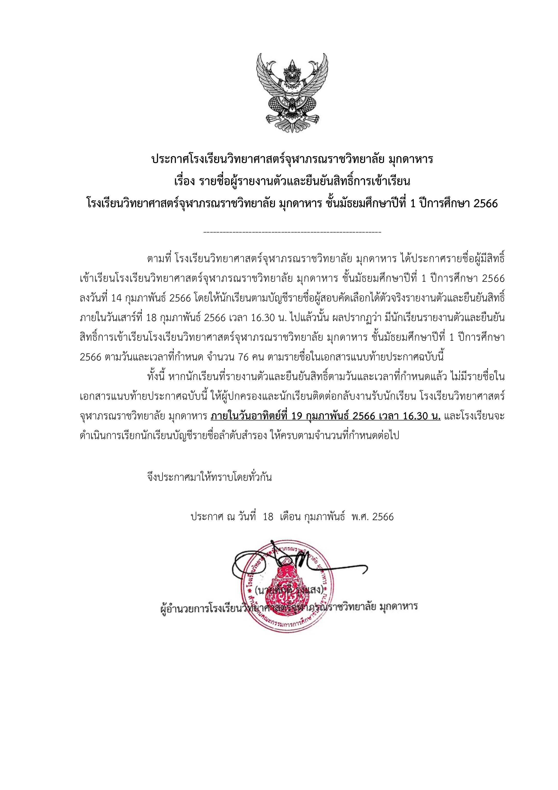 ประกาศรายชื่อผู้ที่รายงานตัวและยืนยันสิทธิ์การเข้าเรียนชั้น ม.1 โรงเรียนวิทยาศาสตร์จุฬาภรณราชวิทยาลัย มุกดาหาร ปีการศึกษา 2566