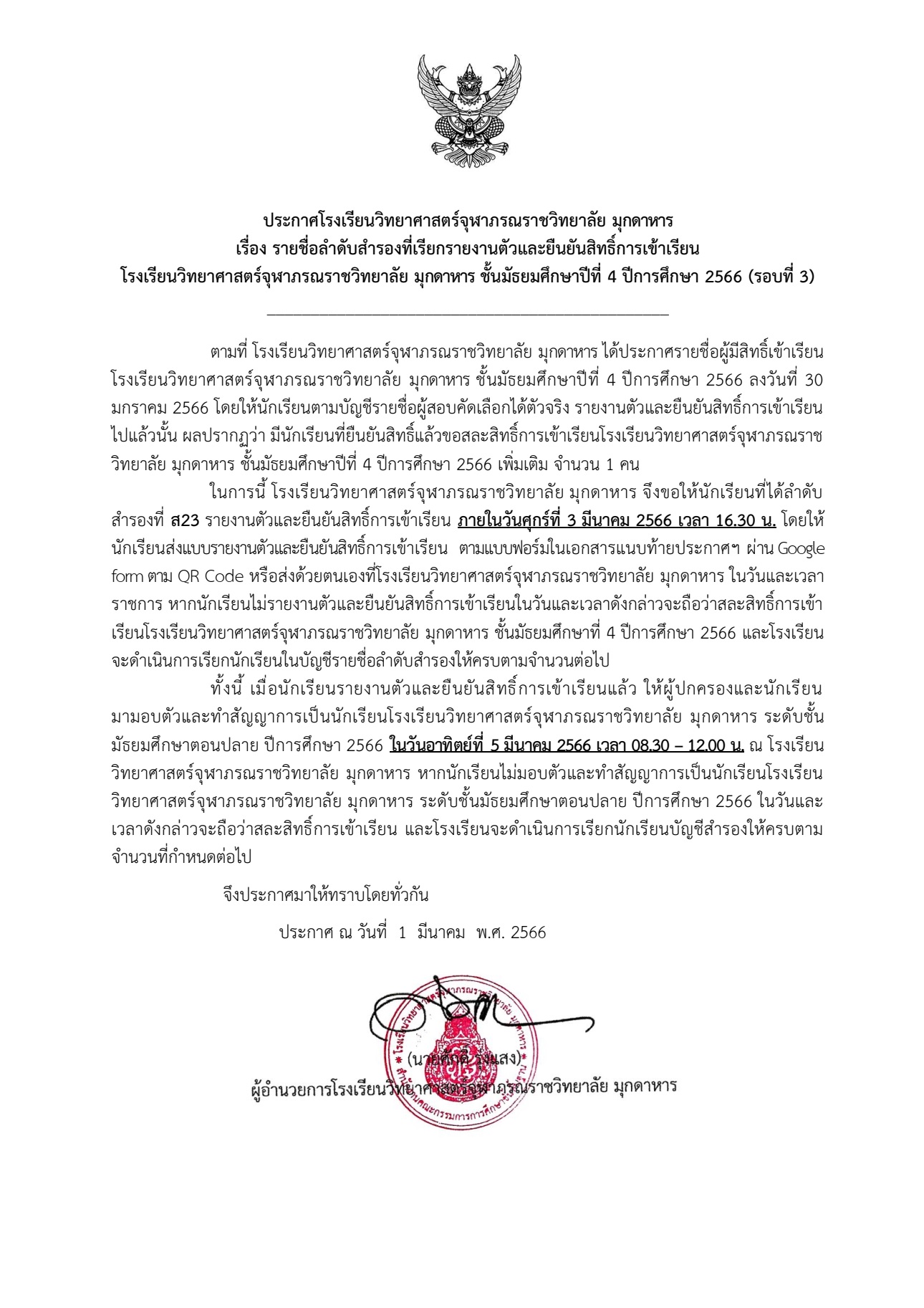 ประกาศรายชื่อลำดับสำรองที่เรียกรายงานตัวและยืนยันสิทธิ์การเข้าเรียน ชั้นมัธยมศึกษาปีที่ 4 ปีการศึกษา 2566 (รอบที่ 3)