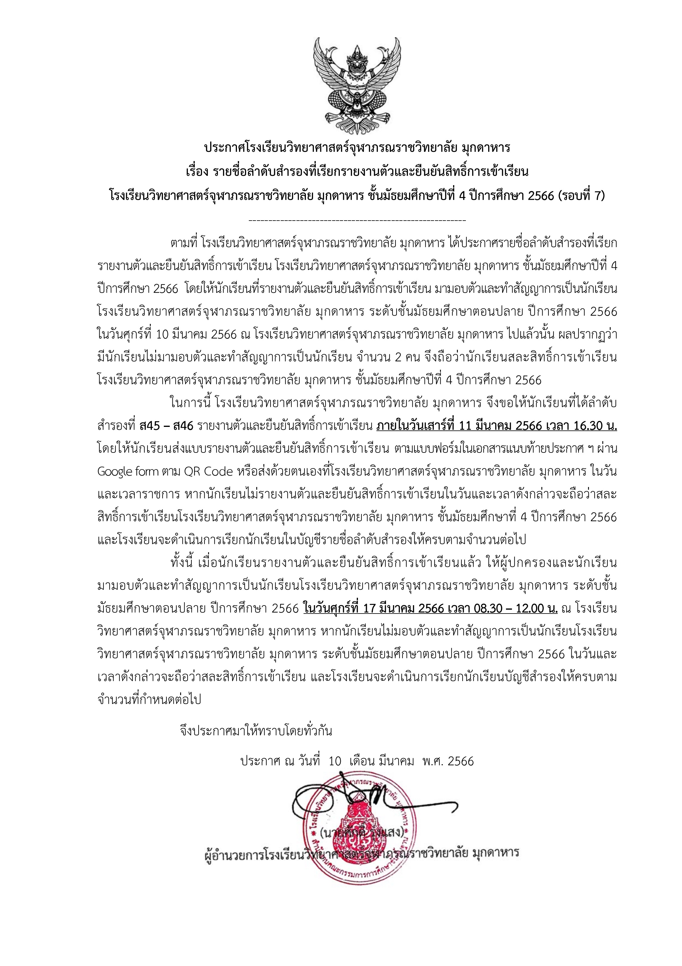 ประกาศรายชื่อลำดับสำรองที่เรียกรายงานตัวและยืนยันสิทธิ์การเข้าเรียน ชั้นมัธยมศึกษาปีที่ 4 ปีการศึกษา 2566 (รอบที่ 7)
