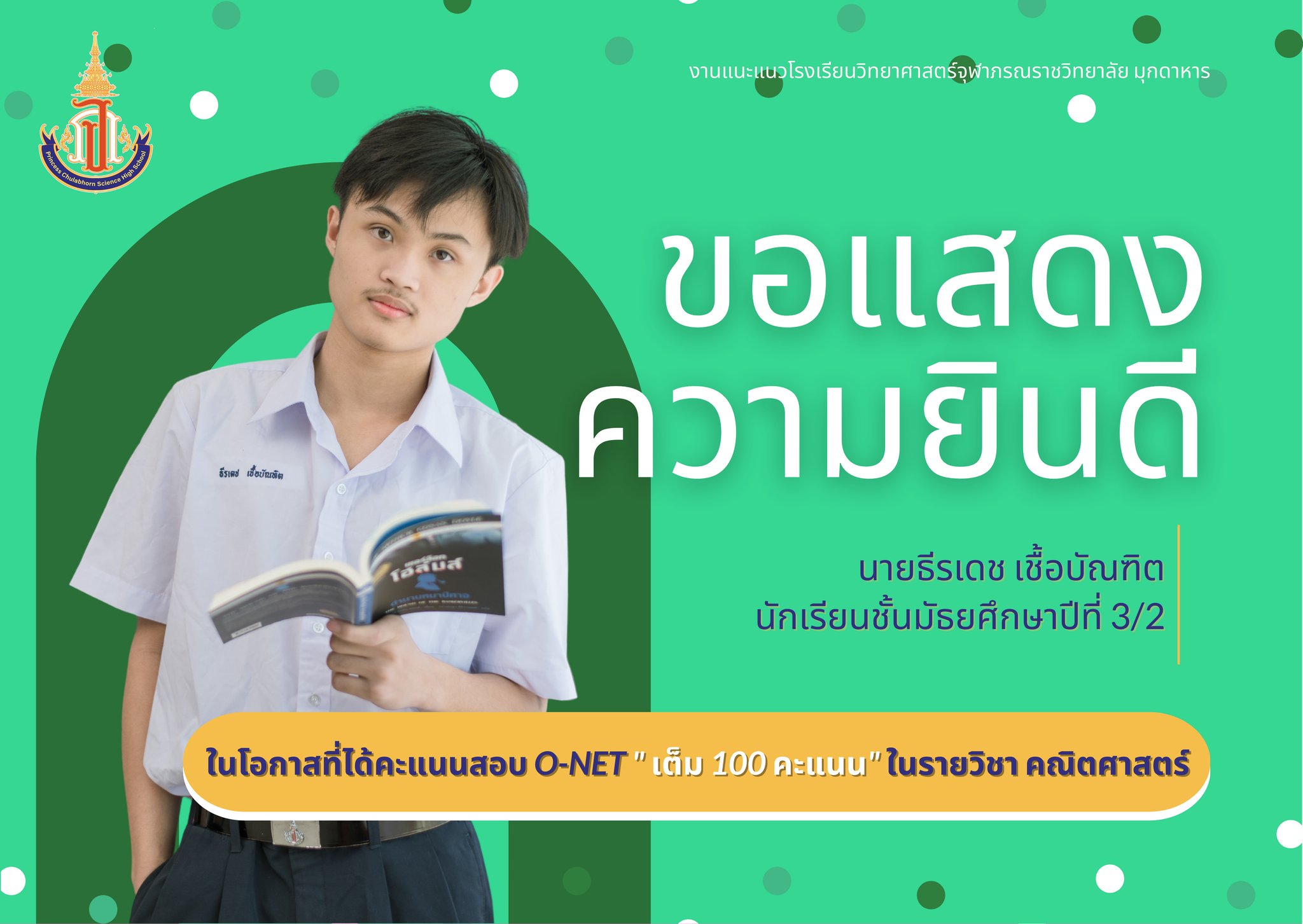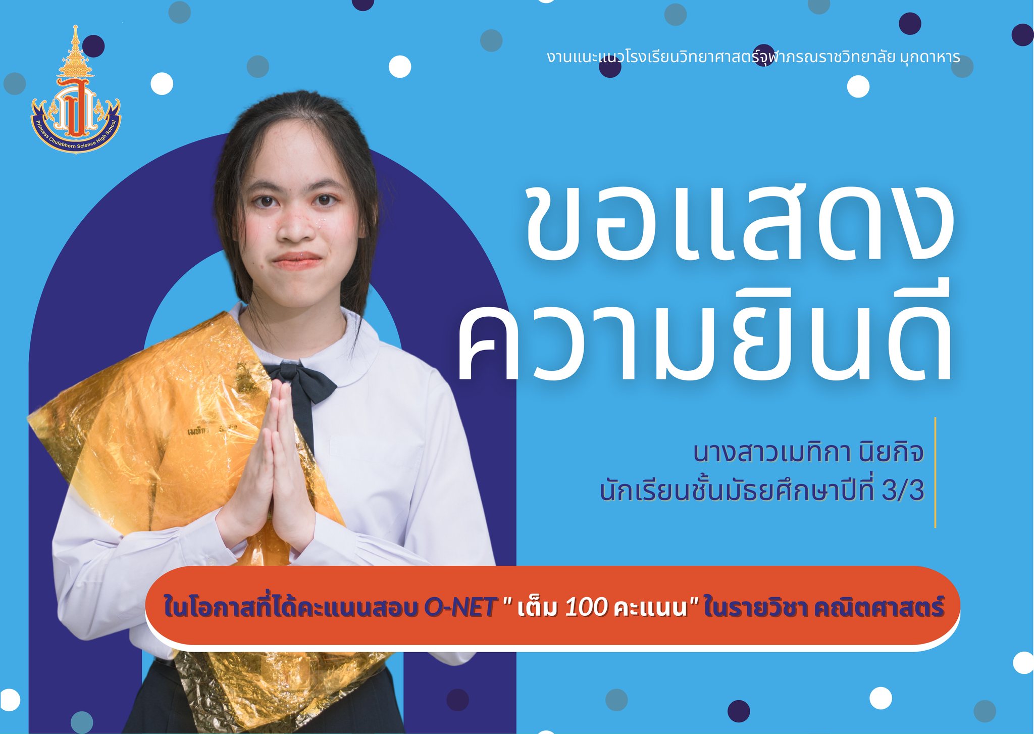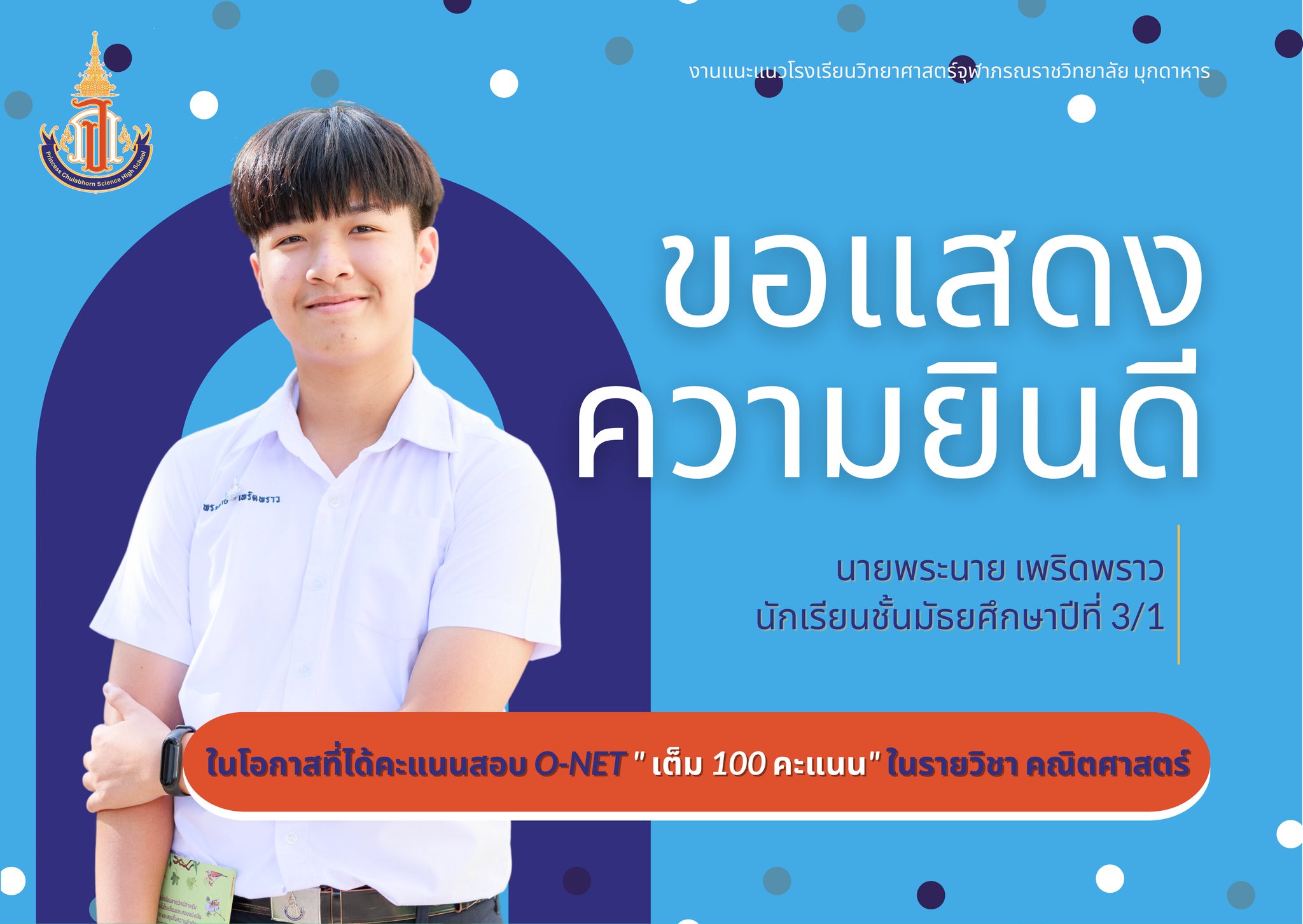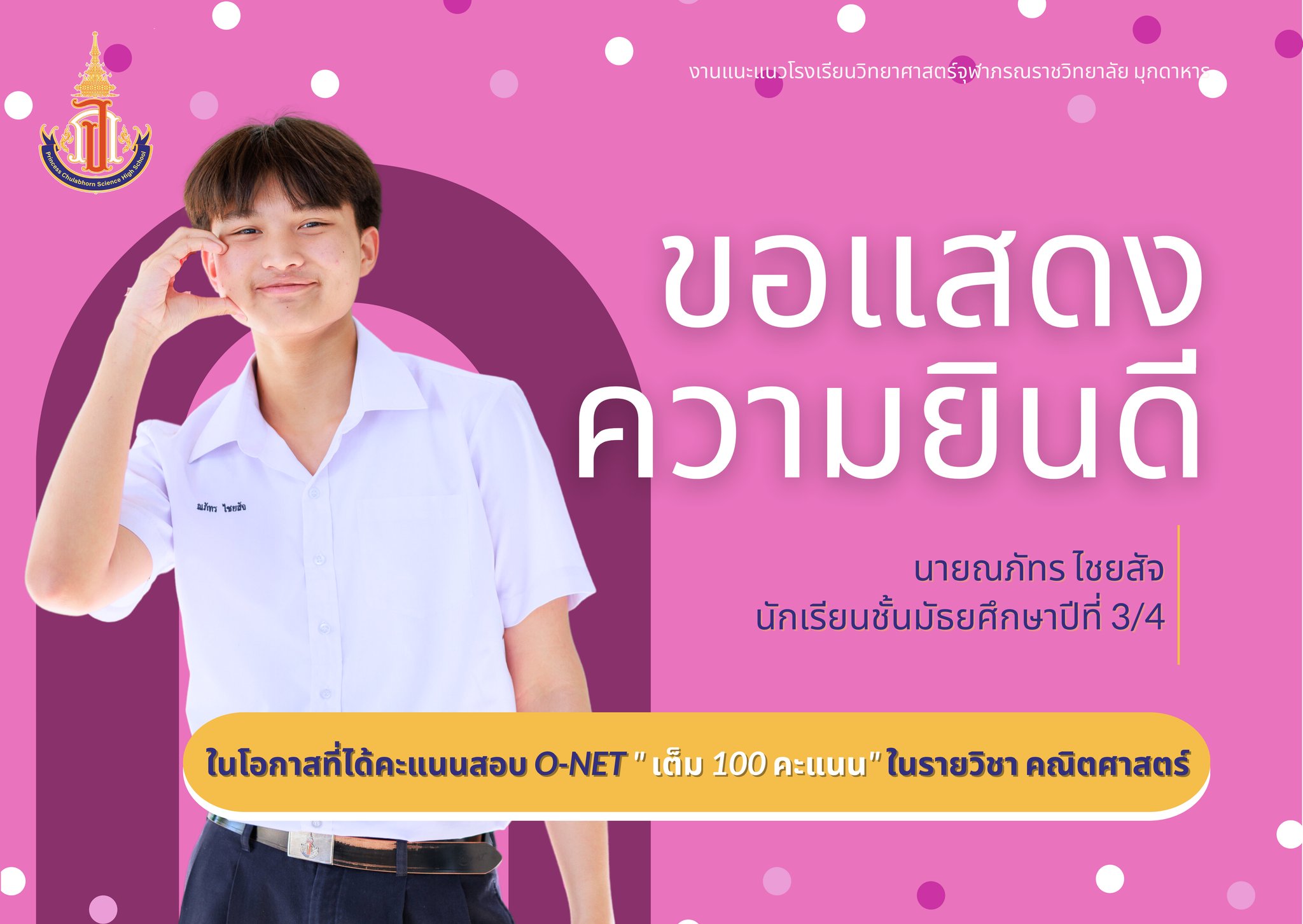 แสดงความยินดีกับนักเรียนชั้นมัธยมศึกษาปีที่ 3 ที่ได้คะแนนสอบ O-NET รายวิชาคณิตศาสตร์ และรายวิชาภาษาอังกฤษ เต็ม 100 คะแนน