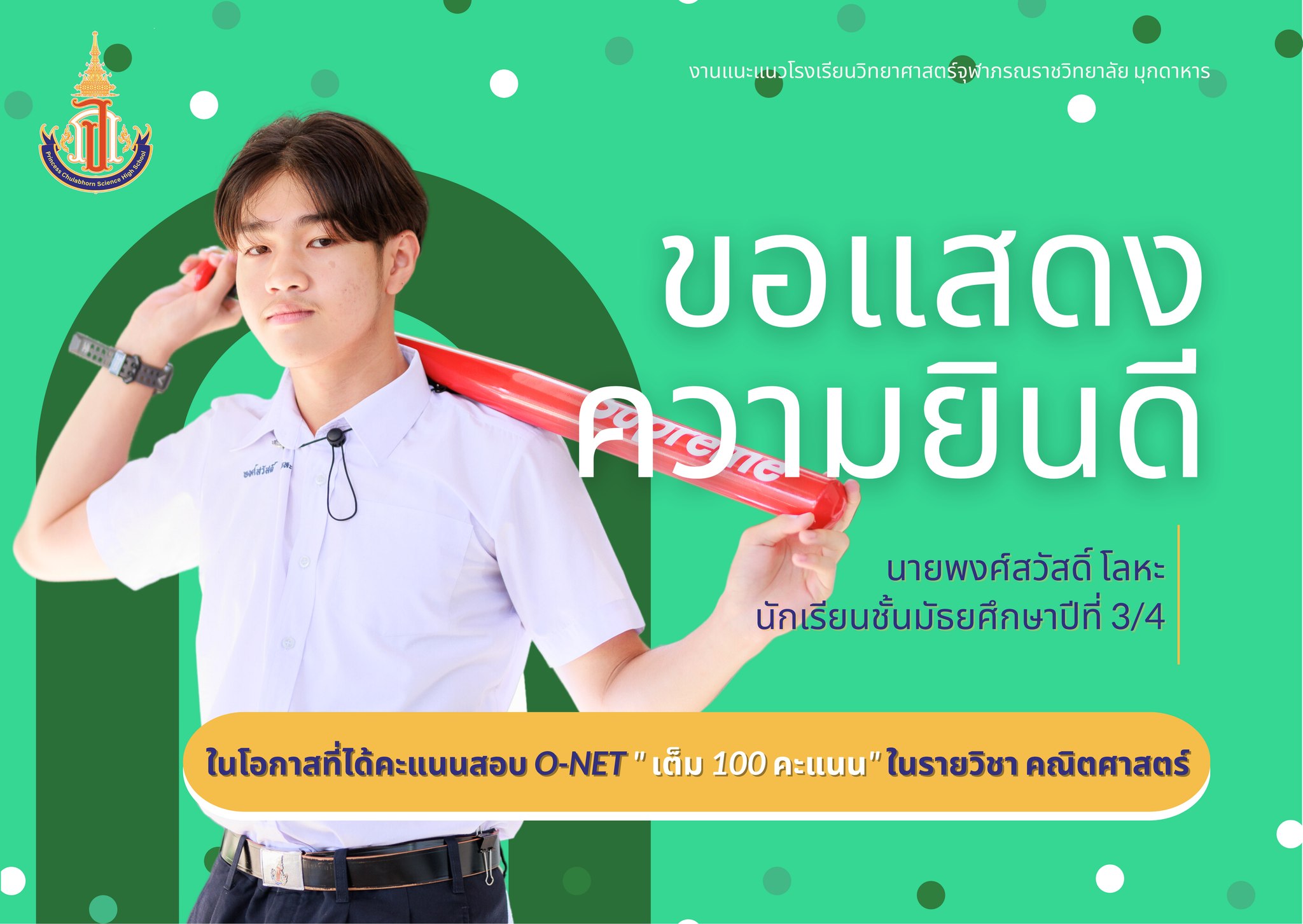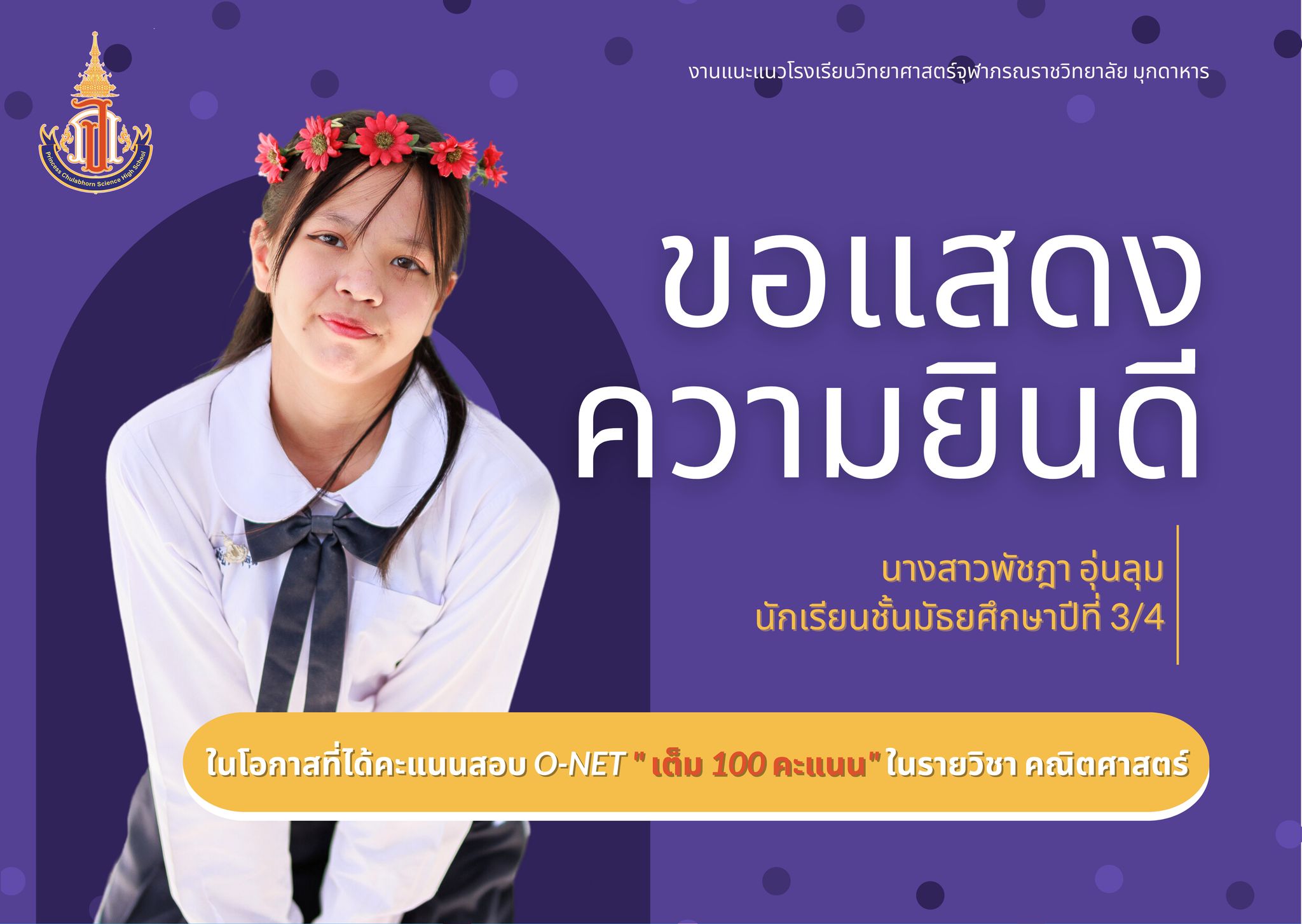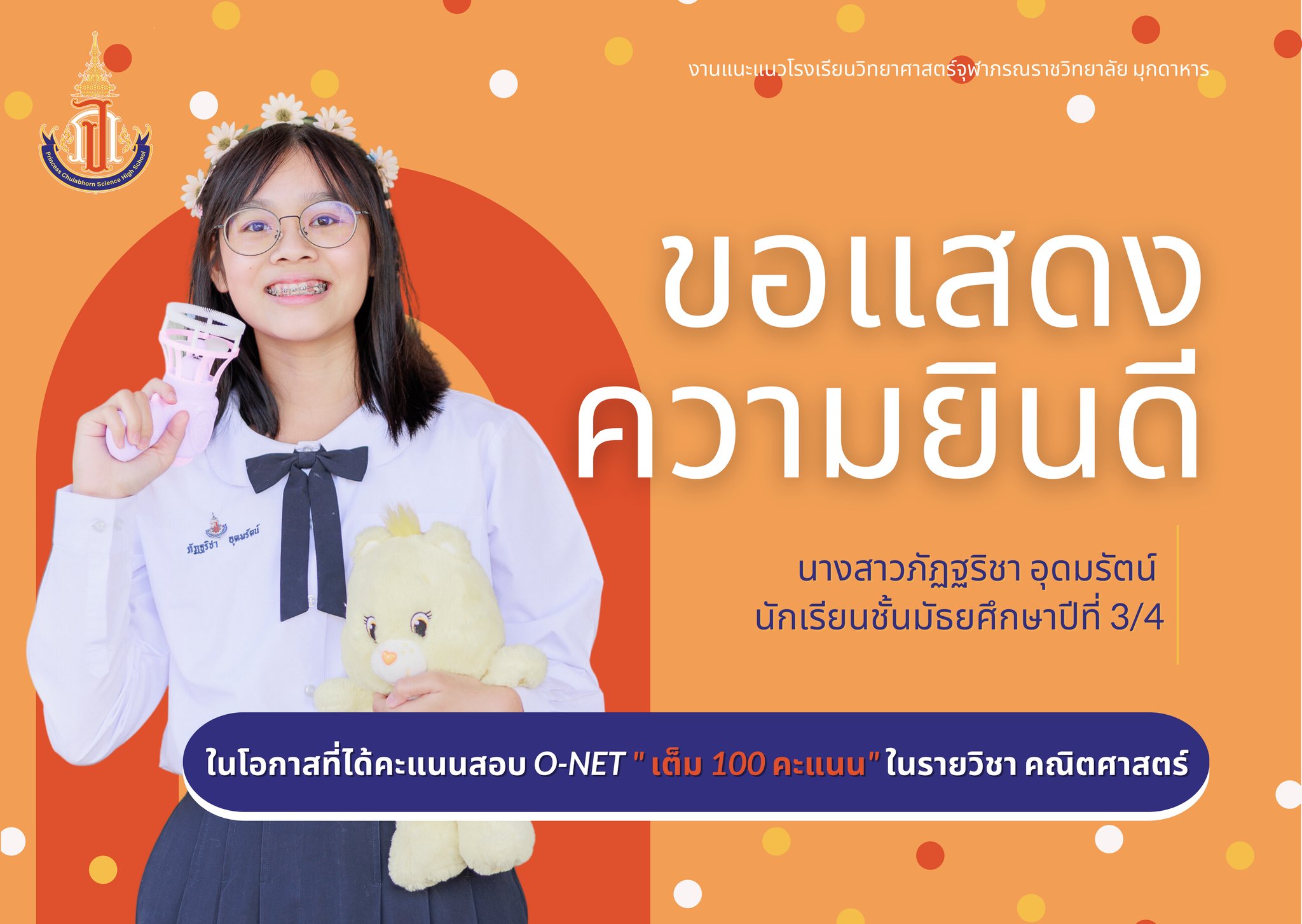 แสดงความยินดีกับนักเรียนชั้นมัธยมศึกษาปีที่ 3 ที่ได้คะแนนสอบ O-NET รายวิชาคณิตศาสตร์ และรายวิชาภาษาอังกฤษ เต็ม 100 คะแนน