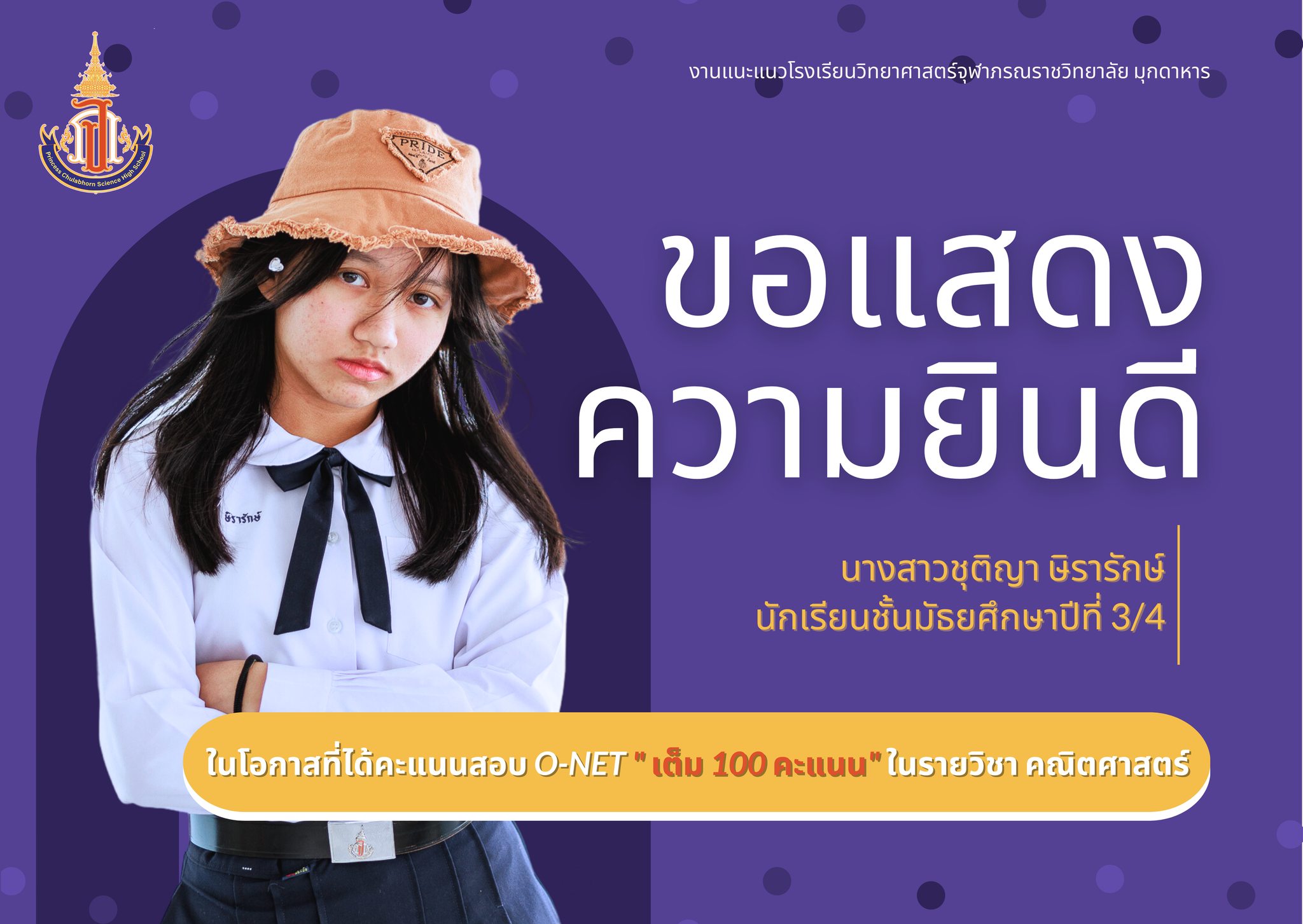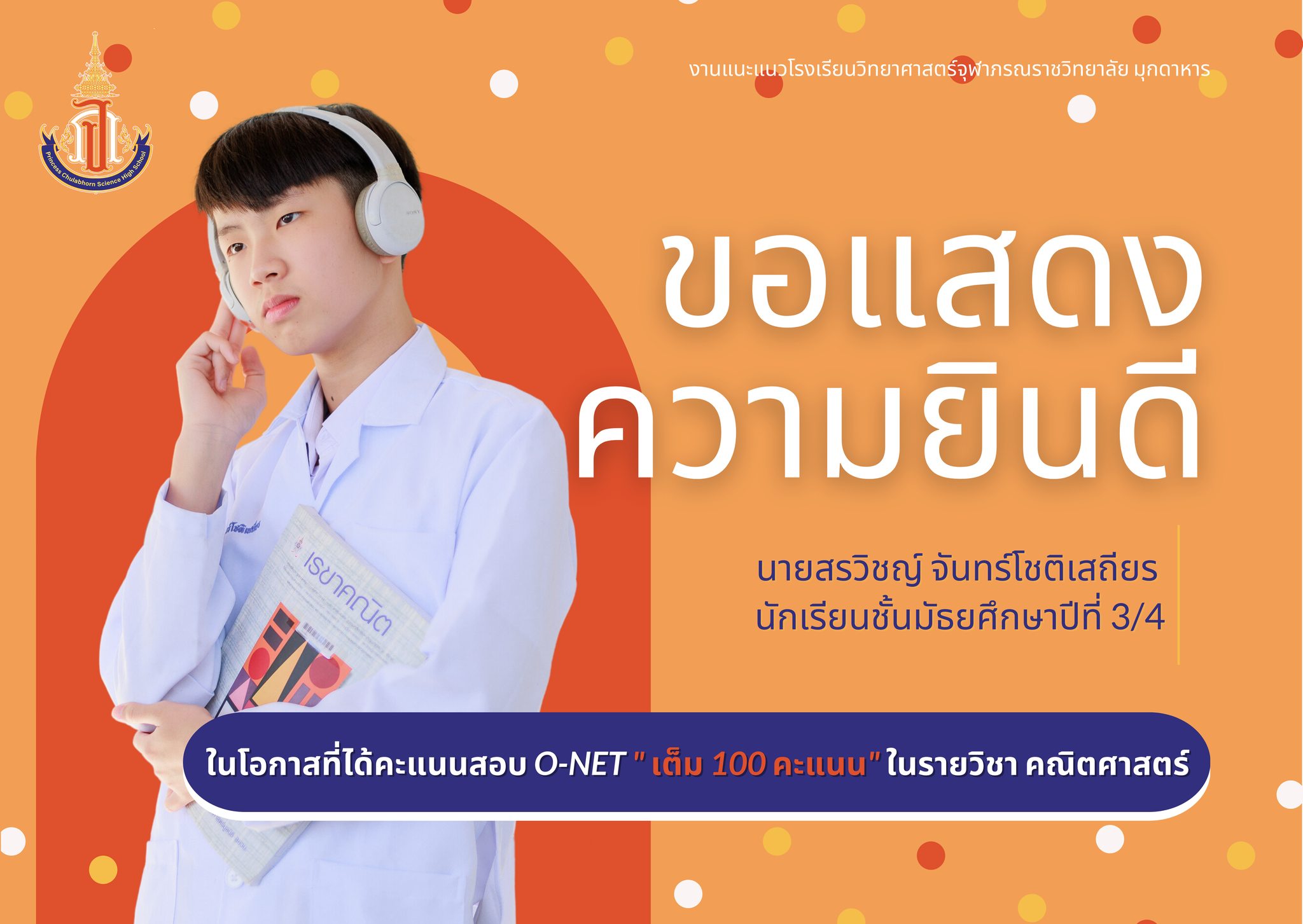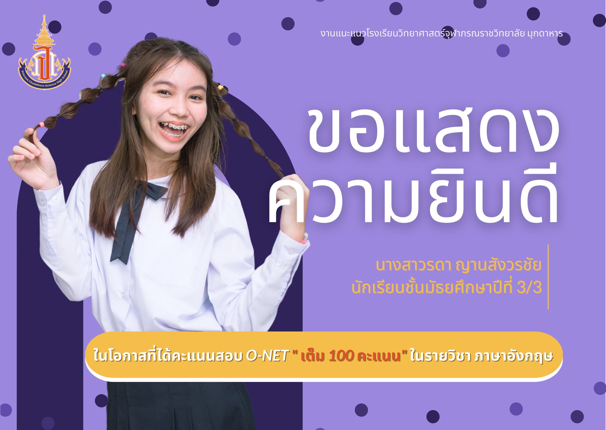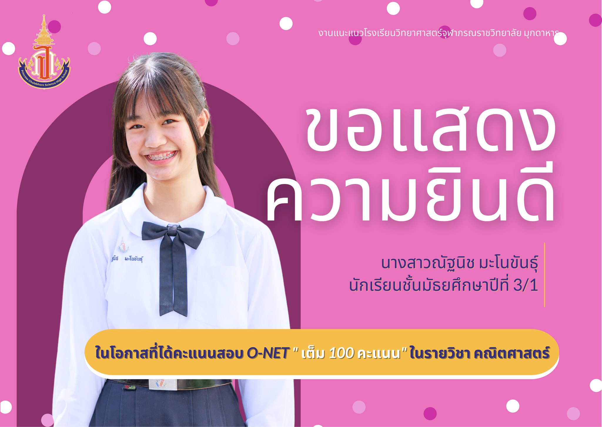 แสดงความยินดีกับนักเรียนชั้นมัธยมศึกษาปีที่ 3 ที่ได้คะแนนสอบ O-NET รายวิชาคณิตศาสตร์ และรายวิชาภาษาอังกฤษ เต็ม 100 คะแนน