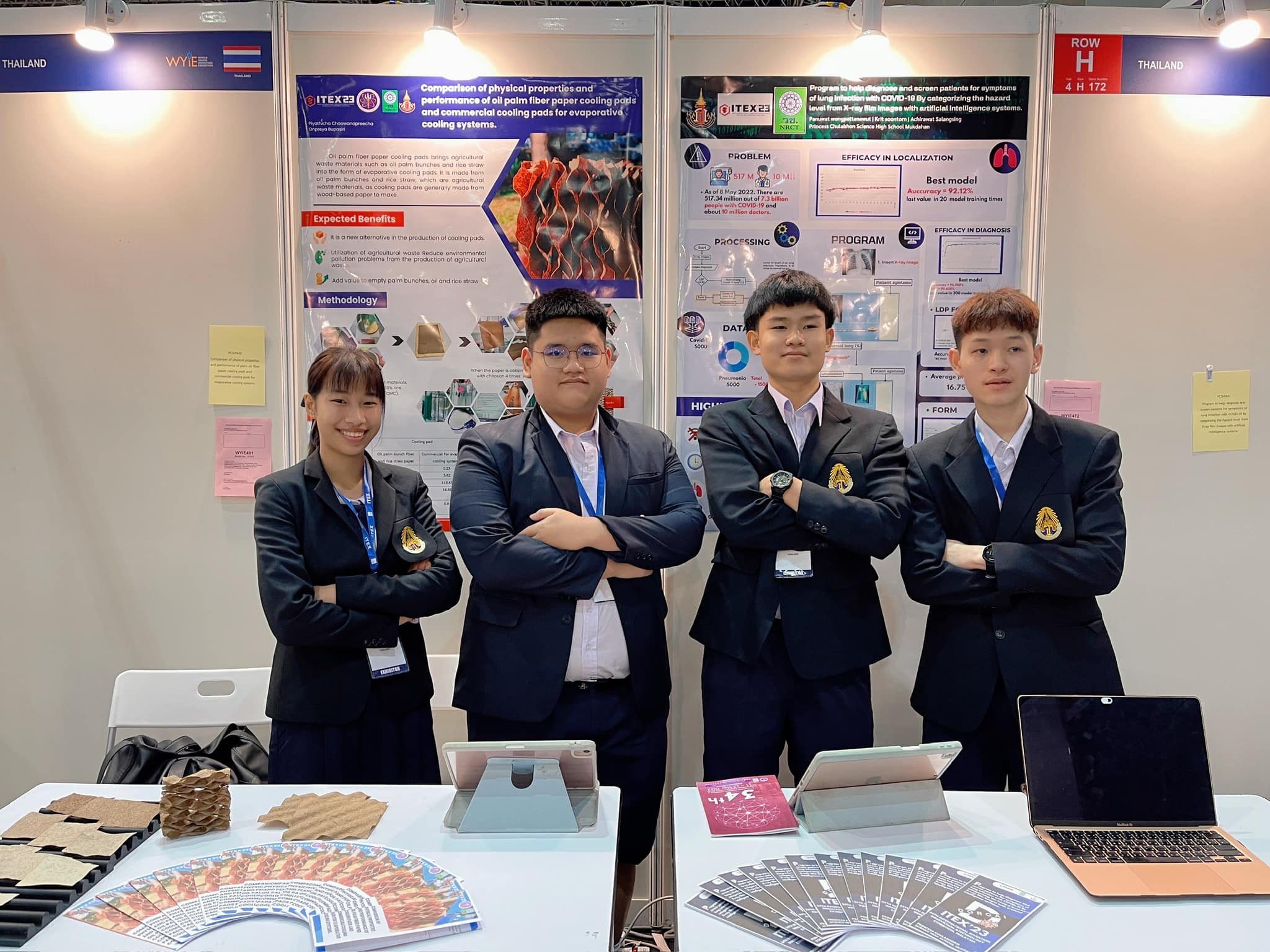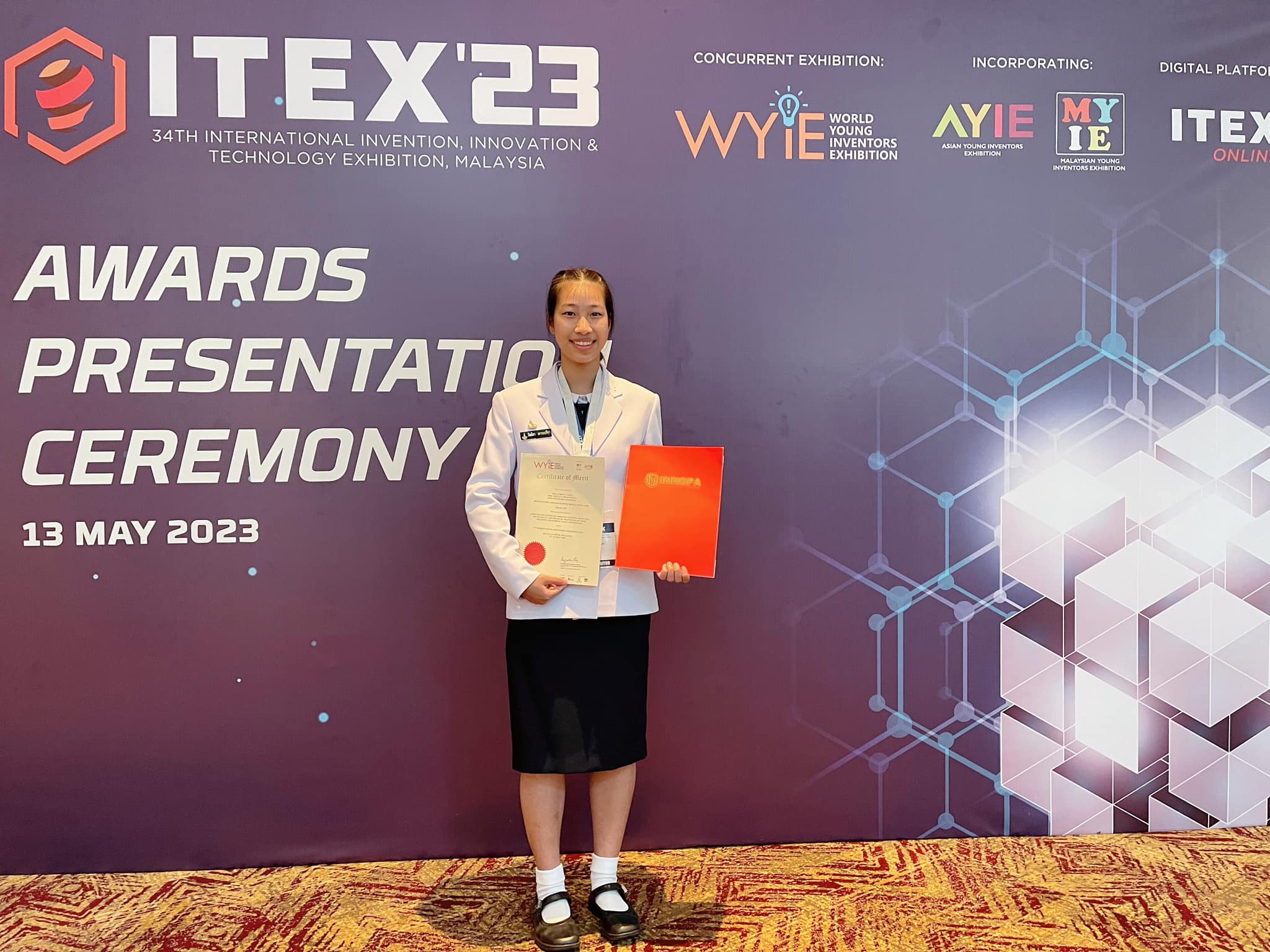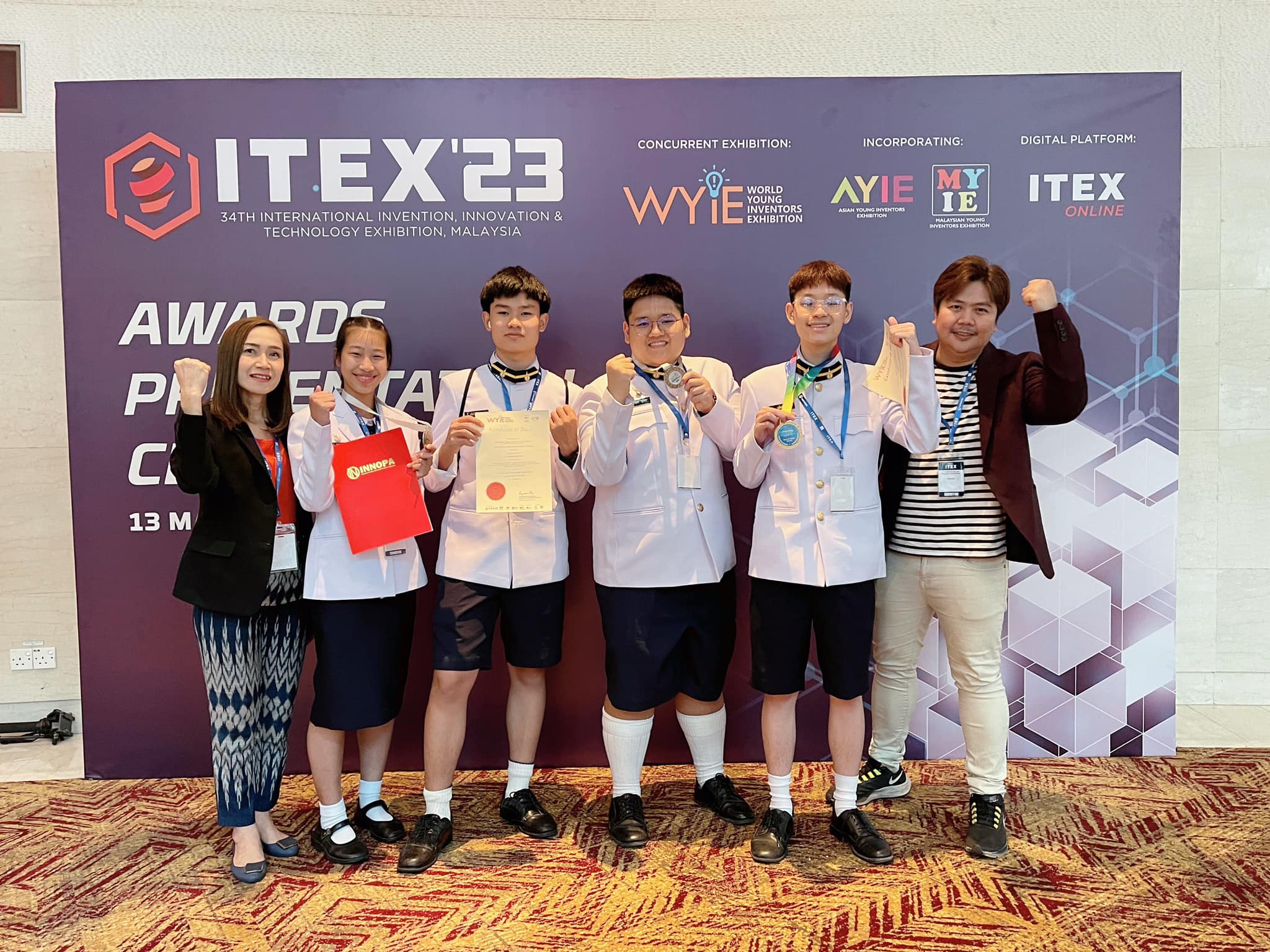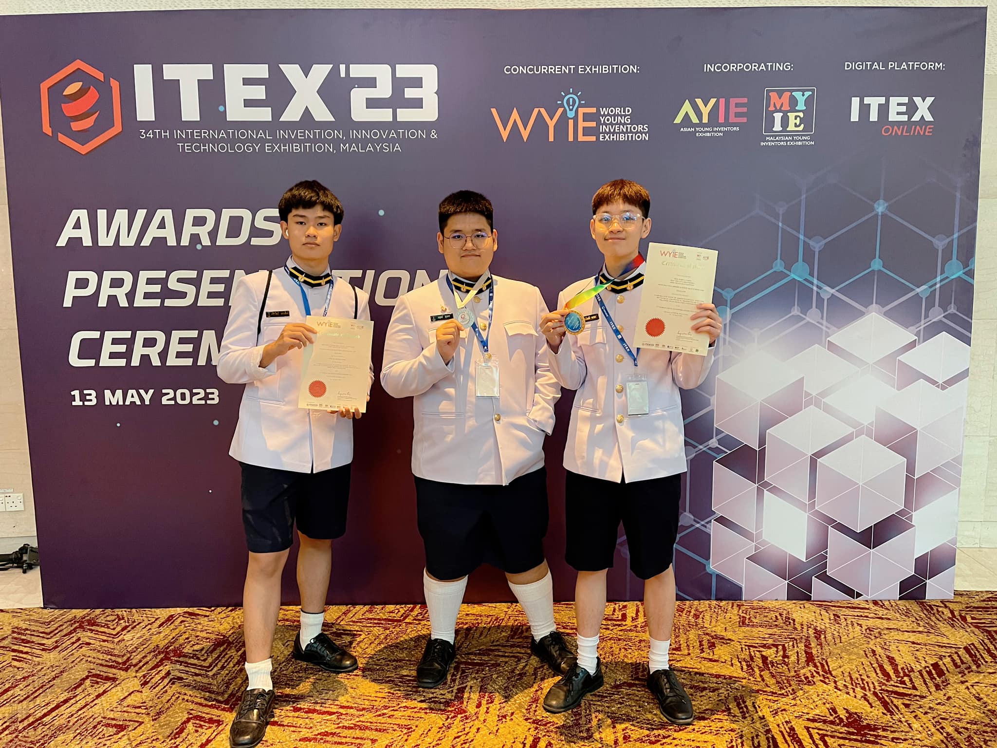 นายกฤตย์ สุนทร นายอชิรวัฒน์ สลางสิงห์ ครูที่ปรึกษา นายธีระวุฒิ จันทะพันธ์ นายชวลิต บัวพรม ในการประกวดผลงานวิจัย/ผลงานประดิษฐ์คิดค้นของนักวิจัยและนักประดิษฐ์ ในงานThe 34th International Invention, Innovation & Technology Exhibition (ITEX 2023) และ WYIE ระหว่างวันที่ 11-13 พฤษภาคม 2566 ณ Kuala Lumpur Convention Centre Hall 1-4 กรุงกัวลาลัมเปอร์ สหพันธรัฐมาเลเซีย