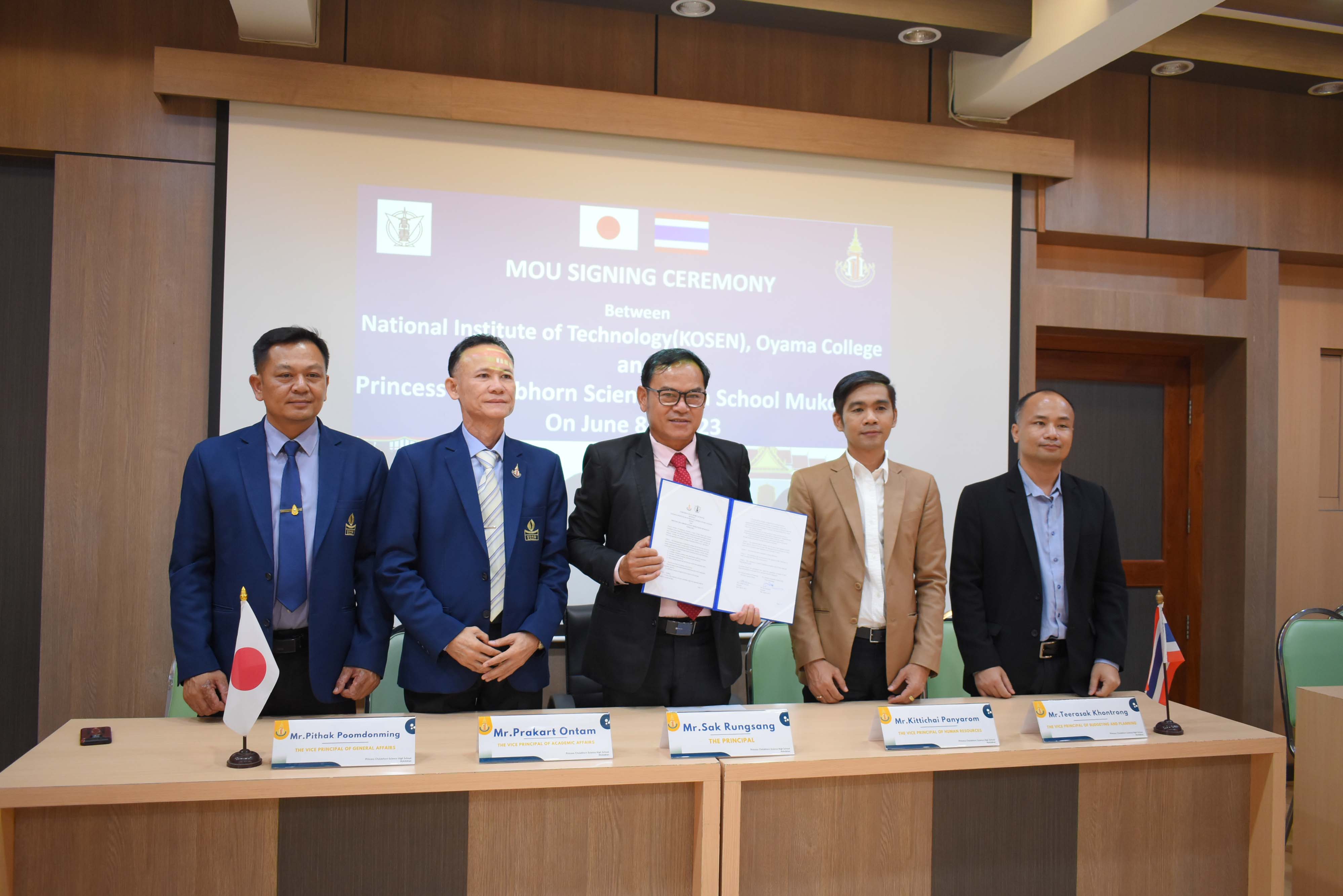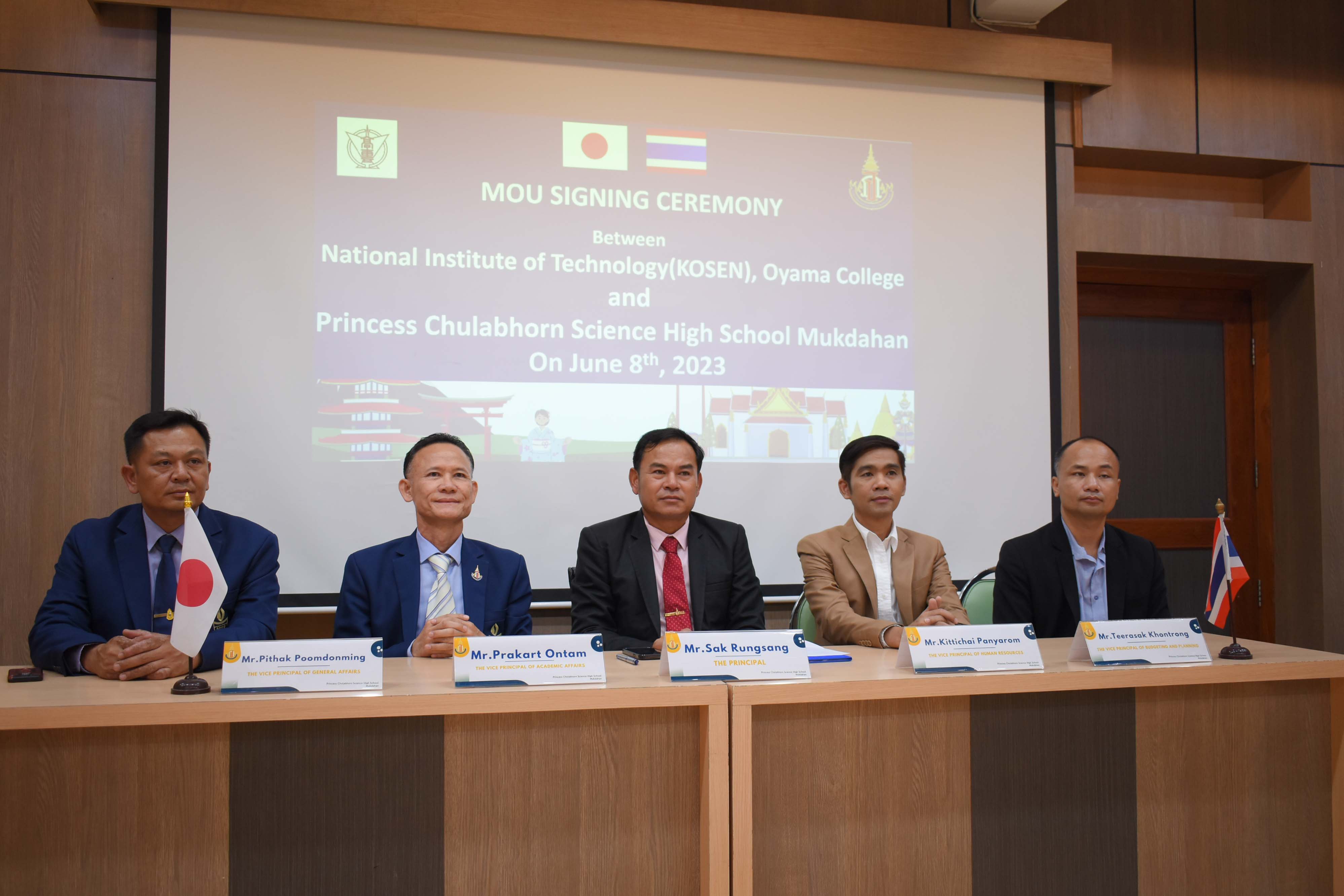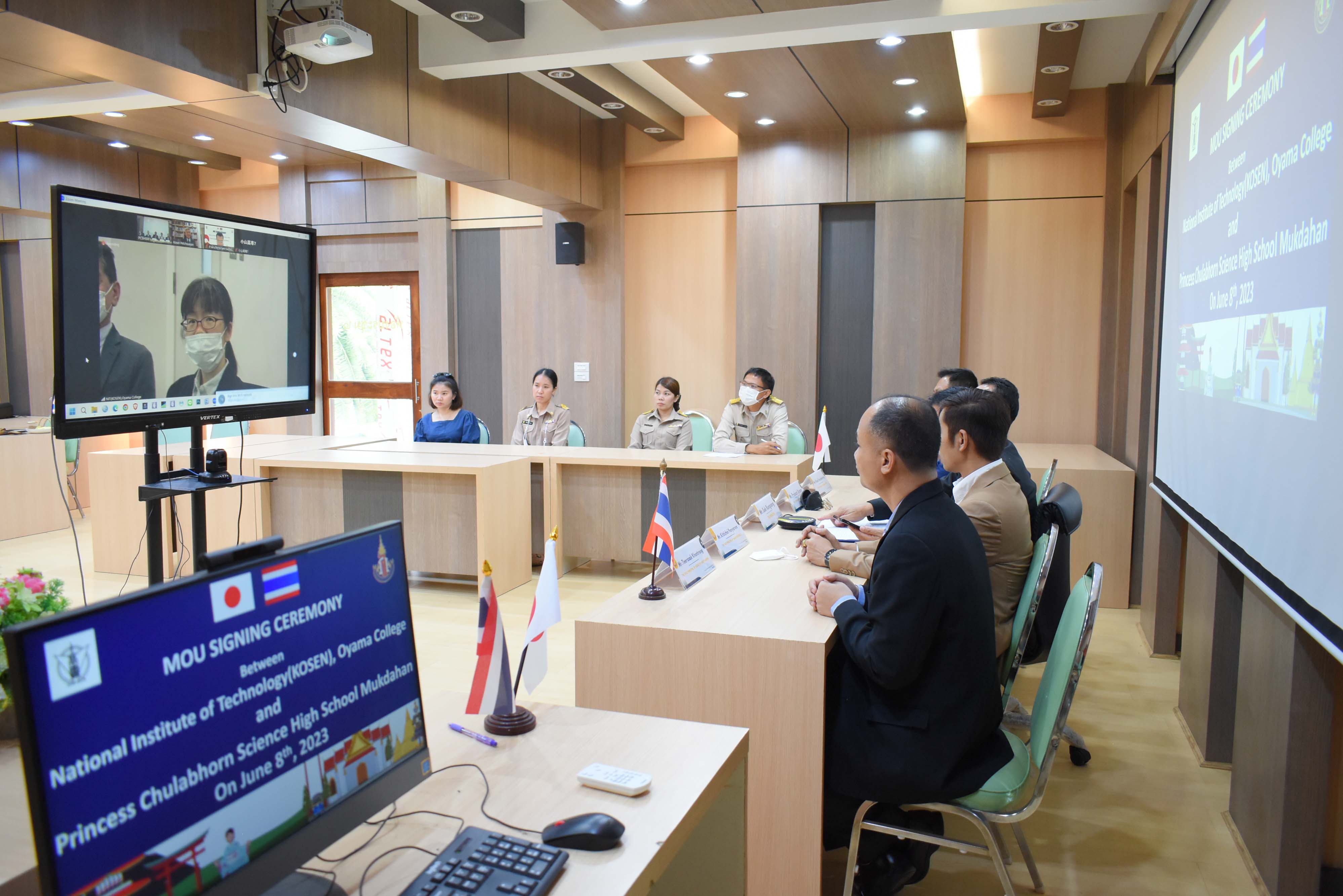 โรงเรียนวิทยาศาสตร์จุฬาภรณราชวิทยาลัย มุกดาหาร ร่วมลงนามความร่วมมือทางวิชาการกับสถาบัน OYAMA KOSEN ประเทศญี่ปุ่น ผ่านการประชุมทางวีดีโอออนไลน์ ในวันพฤหัสบดีที่ 8 มิถุนายน 2566 เวลา 13.00 น. ตามเวลาในประเทศไทย