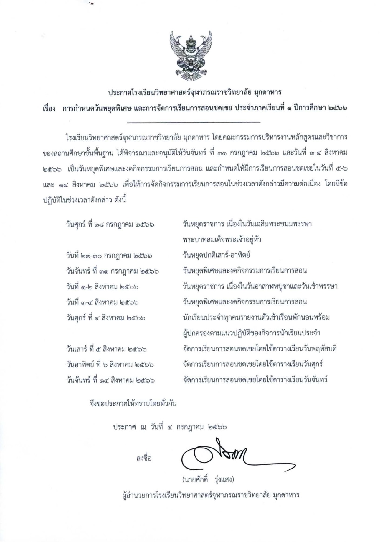 โรงเรียนวิทยาศาสตร์จุฬาภรณราชวิทยาลัย มุกดาหาร ประกาศกำหนดวันหยุดพิเศษและการสอนชดเชย ภาคเรียนที่ 1 ปีการศึกษา 2566