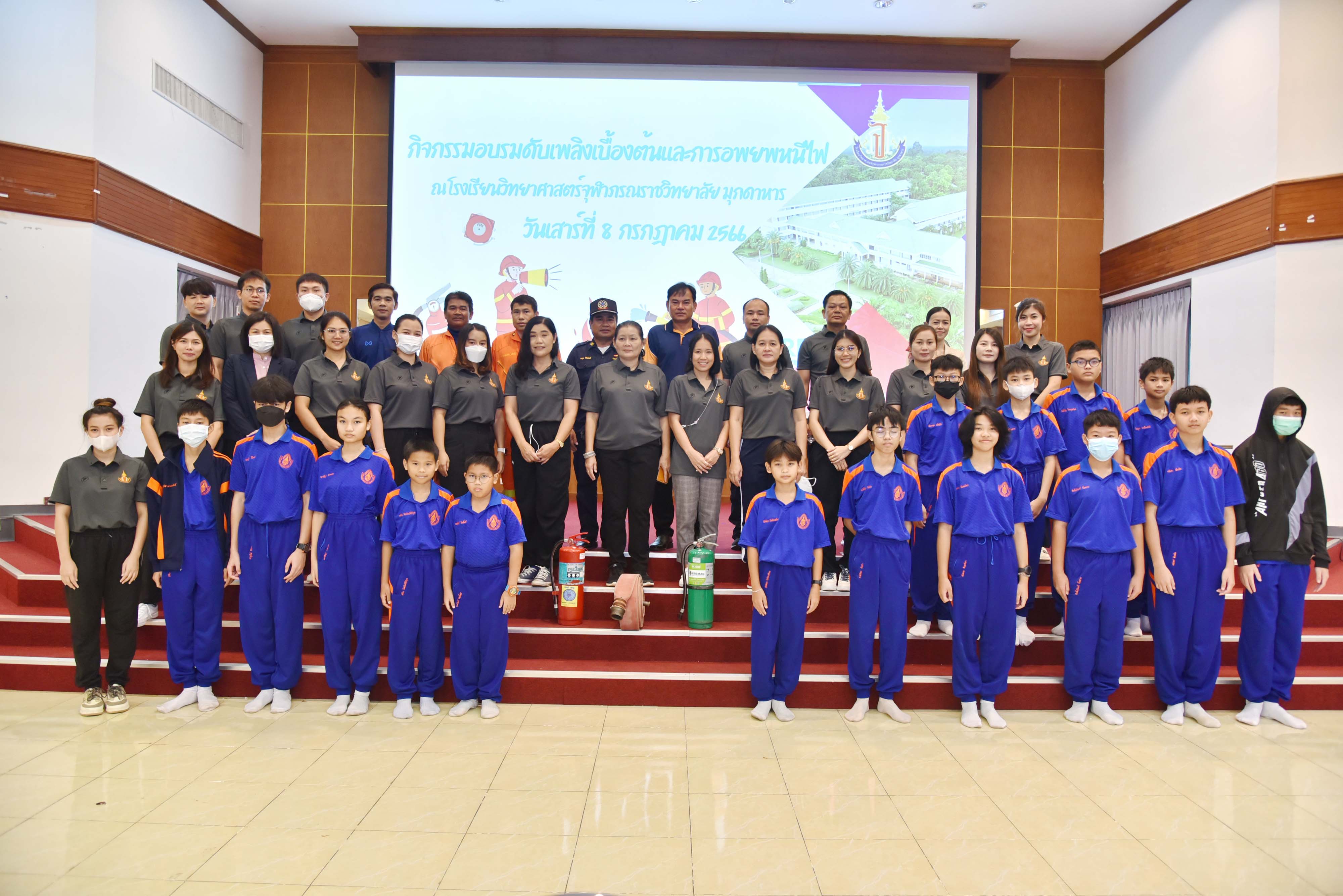 กิจกรรมการฝึกอบรมดับเพลิงเบื้องต้นและการซ้อมแผนอพยพหนีไฟภายในเรือนพักนอนนักเรียนประจำ ปีการศึกษา 2566 จัดขึ้นเมื่อวันที่ 8 กรกฎาคม 2566 ณ หอประชุมโรงเรียน และบริเวณเรือนพักนอนนักเรียนประจำ โรงเรียนวิทยาศาตร์จุฬาภรณราชวิทยาลัย มุกดาหาร เพื่อให้คณะครูและนักเรียน ให้ความสําคัญในเรื่องความปลอดภัยในชีวิตและทรัพย์สินของตนเอง และโรงเรียนที่อาจเกิดขึ้นจากอุบัติภัยต่างๆ โดยเฉพาะอย่างยิ่งอุบิติภัยที่เกิดจากอัคคีภัย ซึ่งอาจทําให้เกิดการสูญเสียชีวิต และทรัพย์สินของโรงเรียน ดังนั้น เพื่อเป็นการลดความเสี่ยงต่อเรื่องดังกล่าว รวมทั้งเพื่อเป็นการสร้างมาตรฐานของการบริหารจัดการองค์กร คณะบริหารงานหอพักนักเรียนประจําพิจารณาแล้วเห็นว่าการสร้างความรู้ความเข้าใจพื้นฐานเรื่อง การดับเพลิงเบื้องต้น แนวทางการป้องกันอัคคีภัย และการอพยพหนีไฟ เป็นเรื่องที่มีความสําคัญ