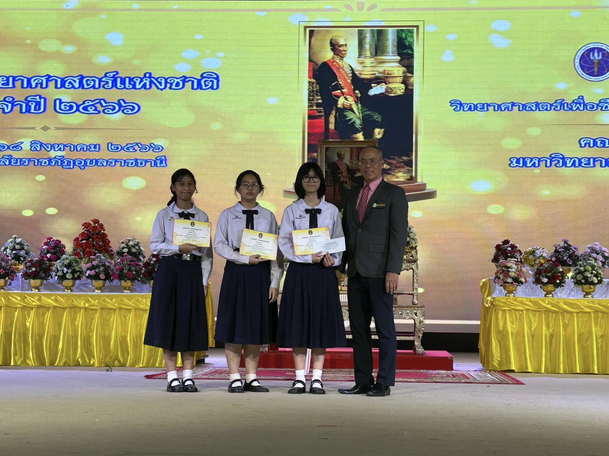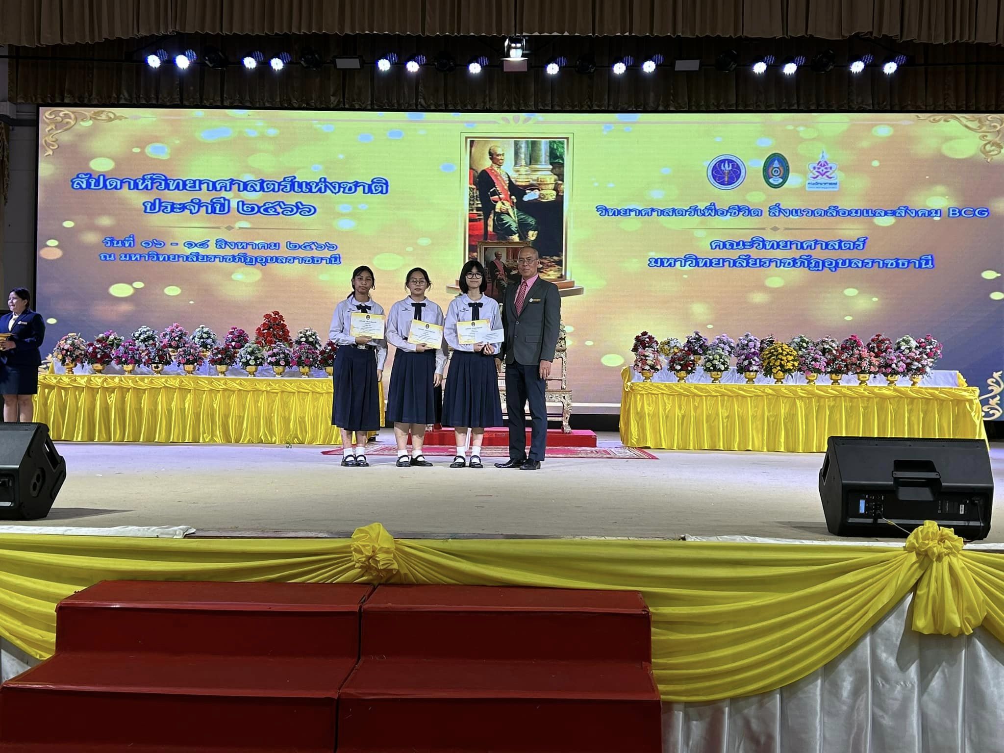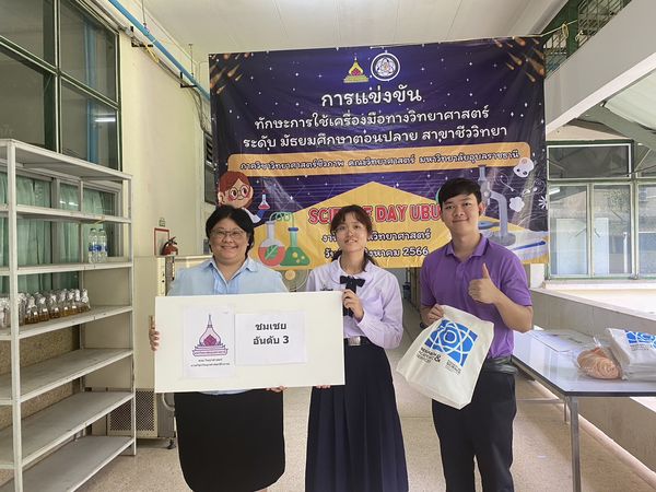 แสดงความยินดีกับนักเรียนที่ได้รับรางวัลรองชนะเลิศอันดับ 1 ในการแข่งขันทักษะกระบวนการทางวิทยาศาสตร์ เคมี สัปดาห์วิทยาศาสตร์แห่งชาติ ปี 2566 มหาวิทยาลัยราชภัฏอุบลราชธานี น.ส.นลินนิภา บุญสอน นักเรียนชั้น ม.6, น.ส.วิรัชยาภรณ์ สมศรี นักเรียนชั้น ม.6, น.ส.ฐิติภา สิมตะมะ นักเรียนชั้น ม.5
