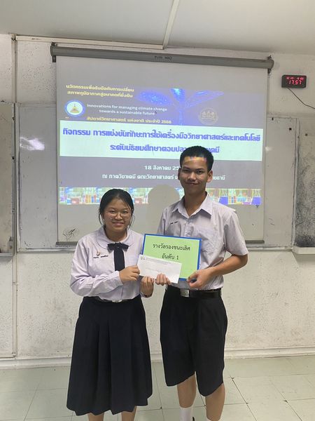 ครูที่ปรึกษา นายธีระวุฒิ จันทะพันธ์ และนายชวลิต บัวพรม ทั้งนี้โครงงานดังกล่าว จะเข้าแข่งขันในเวทีระดับประเทศ เพื่อคัดเลือกตัวแทนประเทศไทยไปเข้าร่วมงาน Regeneron ISEF โดยสมาคมวิทยาศาสตร์แห่งประเทศไทยในพระบรมราชูปถัมภ์ ต่อไป