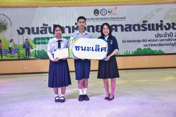 ในงานสัปดาห์วิทยาศาสตร์แห่งชาติ คณะศิลปศาสตร์และวิทยาศาสตร์ มหาวิทยาลัยราชภัฏร้อยเอ็ด นักเรียนที่ร่วมการแข่งขัน นายอมรชัย สิเนหะวัฒนะ นักเรียนชั้น ม.6, น.ส.ธัญรดา แสงพิศาล นักเรียนชั้น ม.6