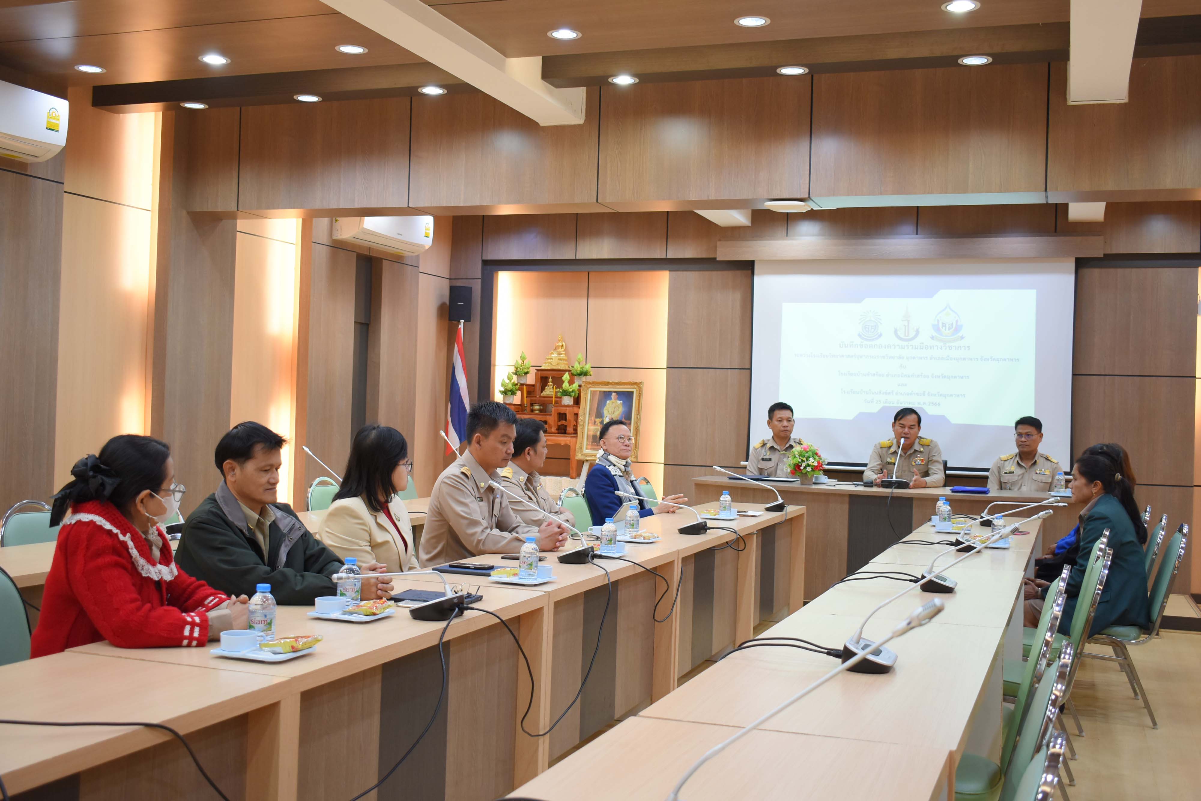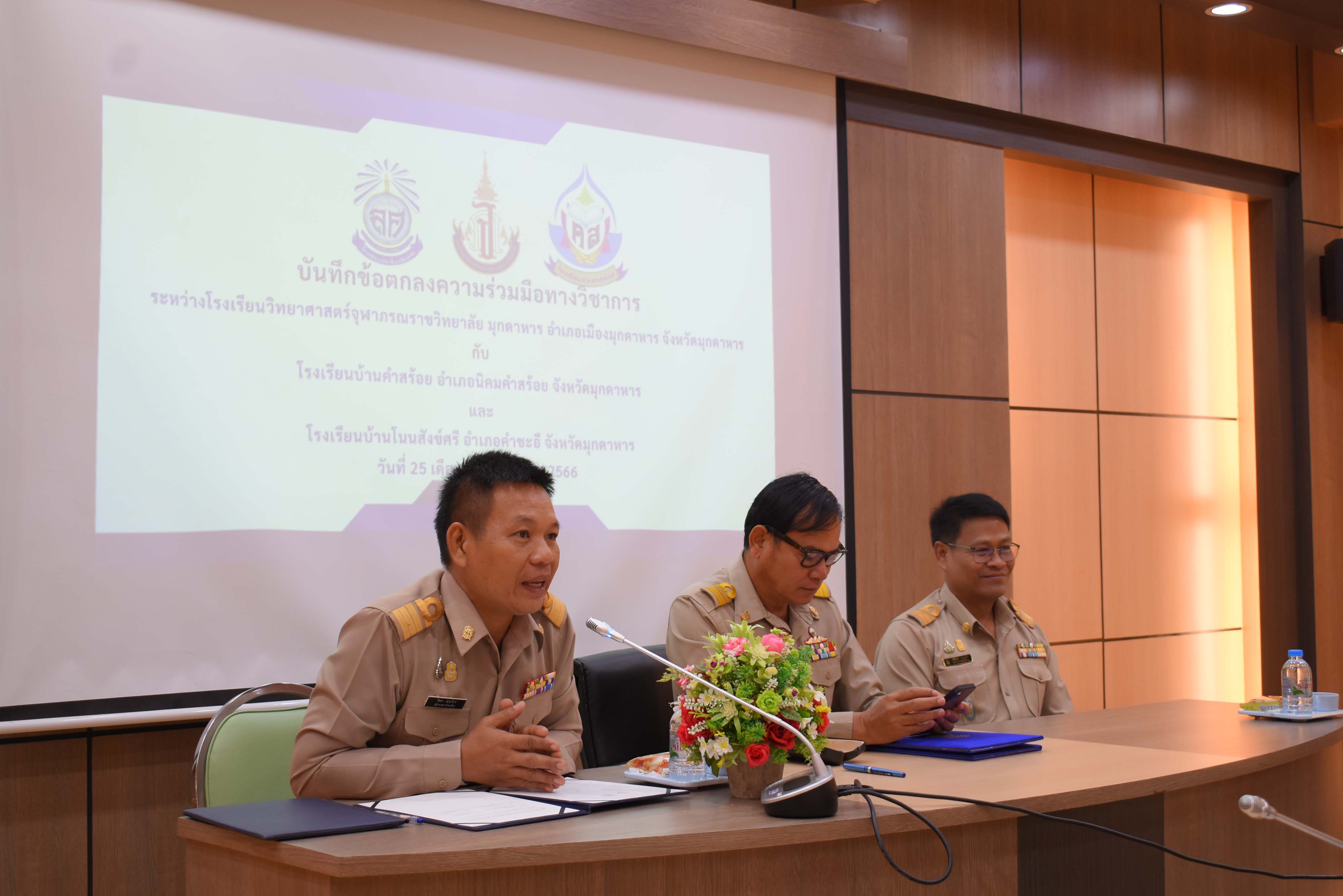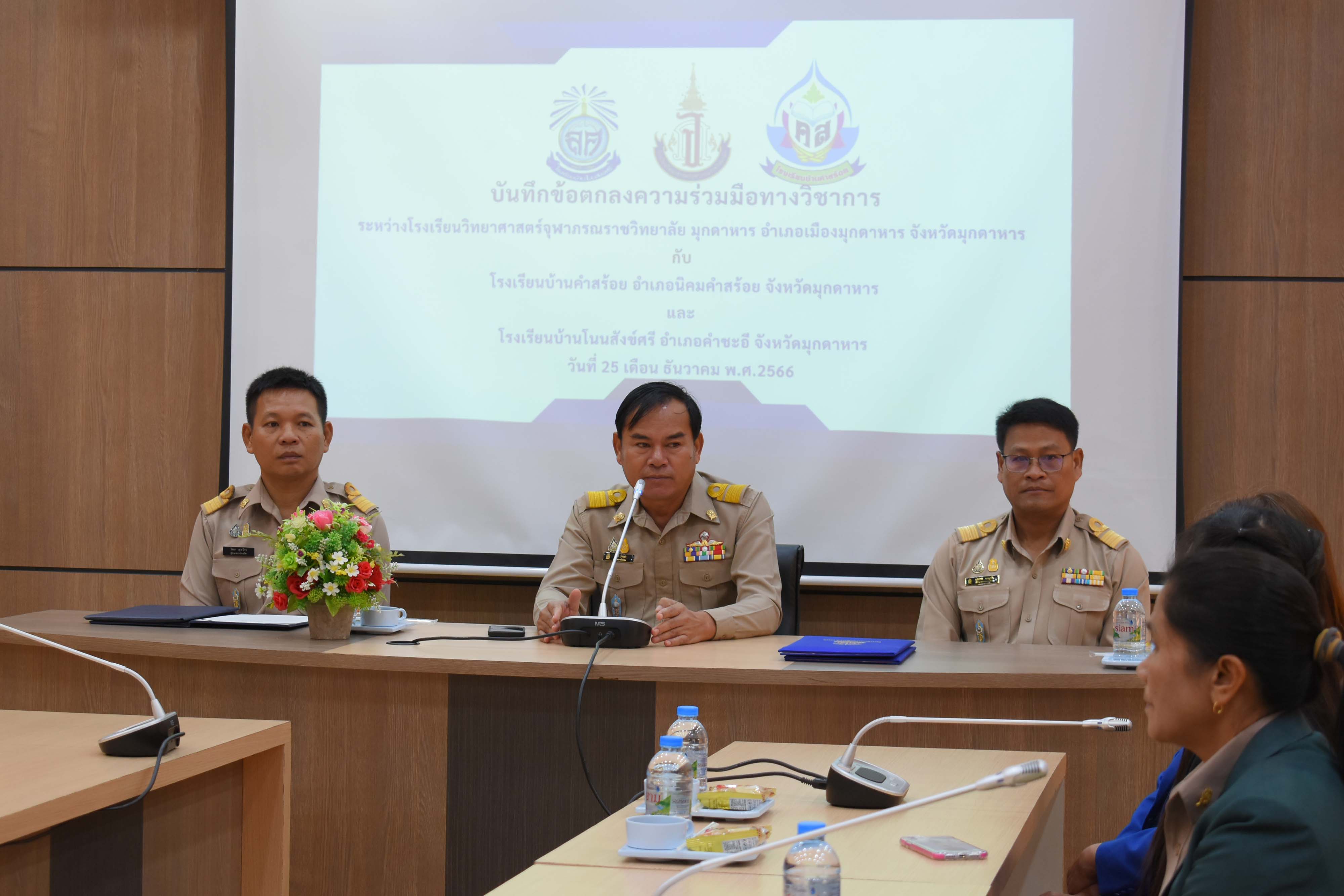 โรงเรียนวิทยาศาสตร์จุฬาภรณราชวิทยาลัย มุกดาหาร ร่วมลงนามบันทึกข้อตกลงความร่วมมือทางวิชาการกับโรงเรียนบ้านคำสร้อย อำเภอนิคมคำสร้อย จังหวัดมุกดาหาร และโรงเรียนบ้านโนนสังข์ศรี อำเภอคำชะอี จังหวัดมุกดาหาร ในวันจันทร์ที่ 25 ธันวาคม 2566 เวลา 09.00 น. ณ ห้องประชุม 2 อาคารอำนวยการ โรงเรียนวิทยาศาสตร์จุฬาภรณราชวิทยาลัย มุกดาหาร