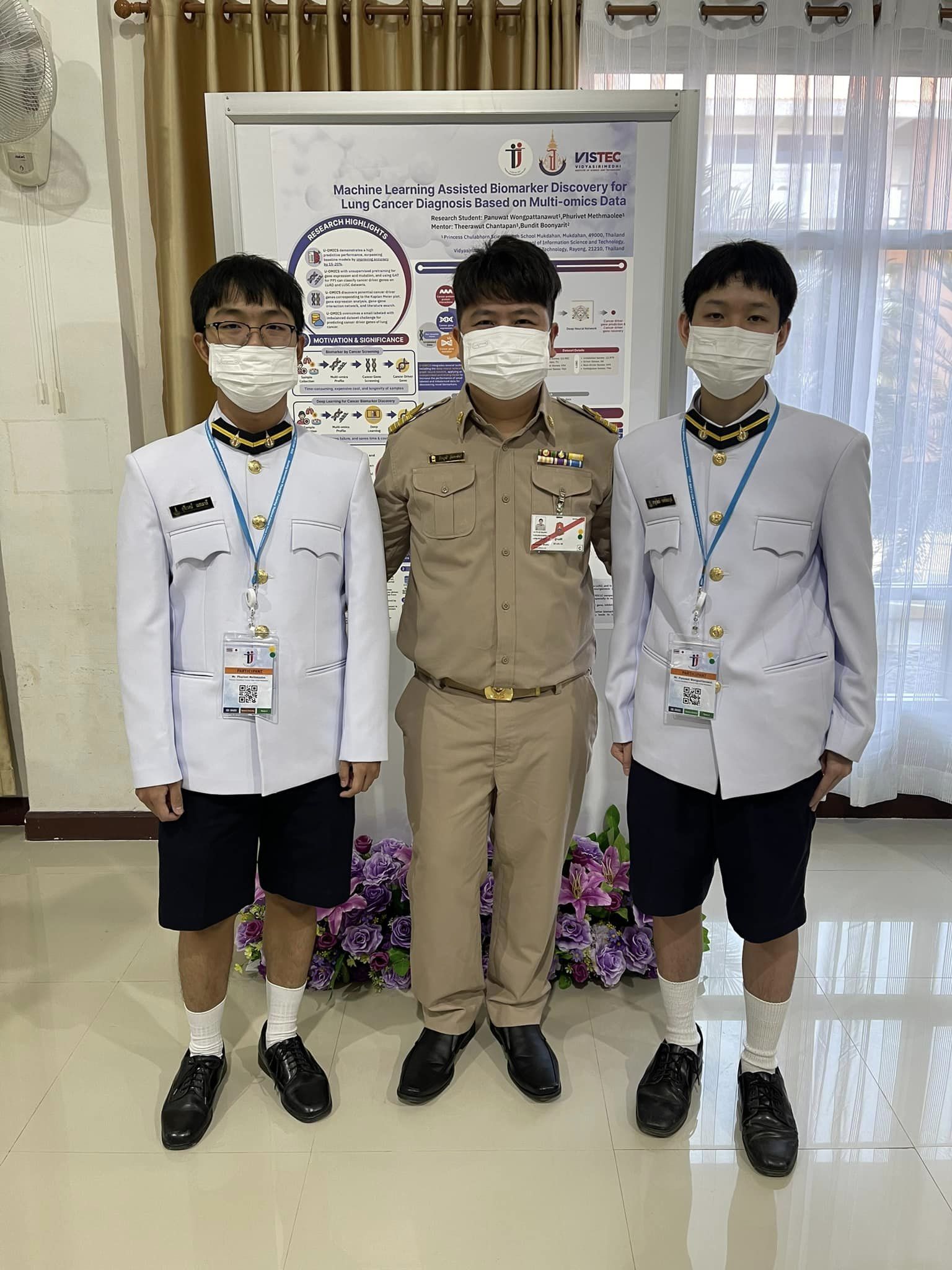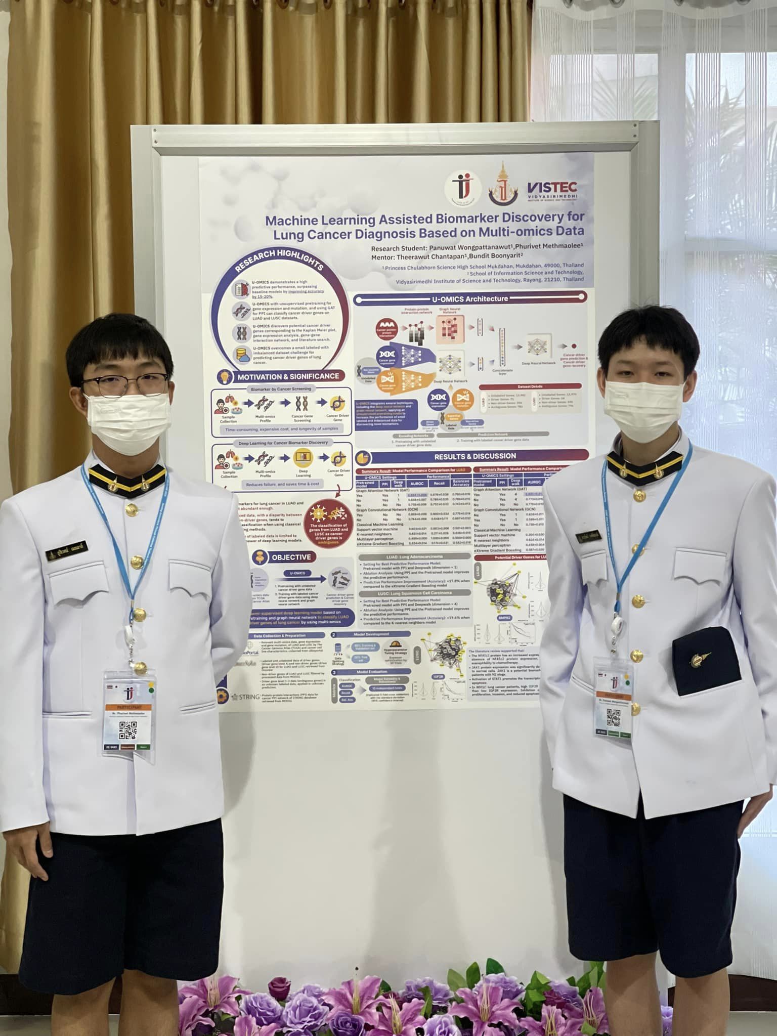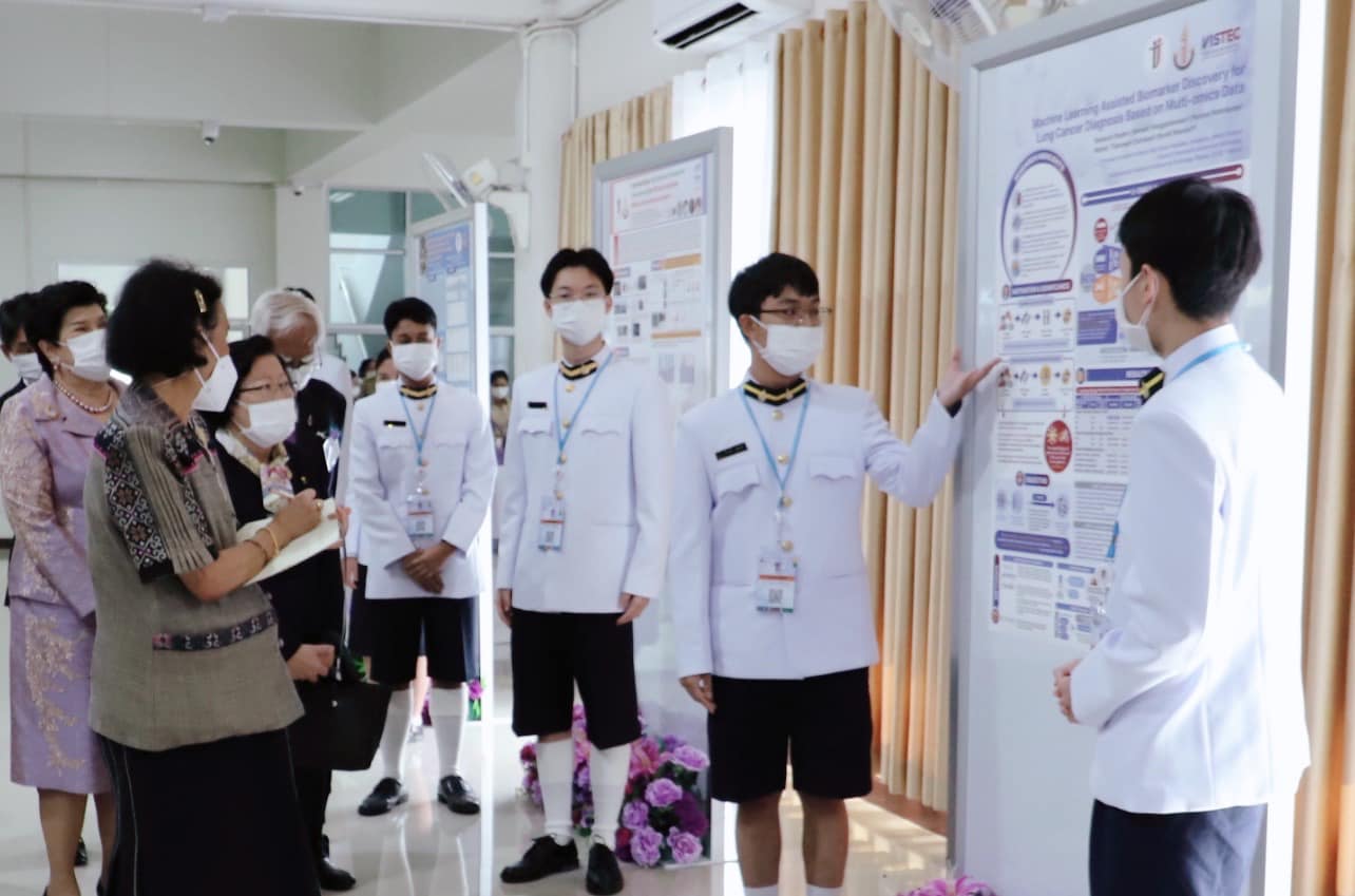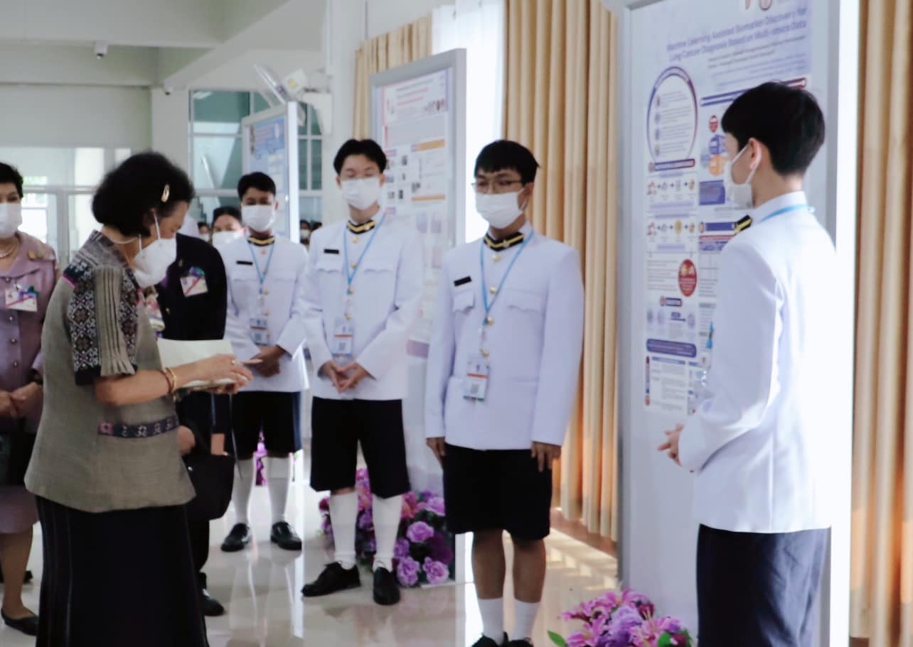 ทั้งนี้ นายภานุวัฒน์ วงศ์พัฒนวุฒิ และนายภูริเวศม์ เมธเมาลี นักเรียนชั้นมัธยมศึกษาปีที่ 6 โรงเรียนวิทยาศาสตร์จุฬาภรณราชวิทยาลัย มุกดาหาร ได้ถวายรายงานการทำโครงงานวิทยาศาสตร์ เรื่อง เทคนิคการเรียนรู้ของเครื่องสําหรับการค้นหาตัวบ่งชี้ทางชีวภาพสําหรับการวินิจฉัยโรคมะเร็งปอดโดยอาศัยข้อมูลพหุโอมิกส์ เฉพาะพระพักตร์ สมเด็จพระกนิษฐาธิราชเจ้า กรมสมเด็จพระเทพรัตนราชสุดาฯ สยามบรมราชกุมารี