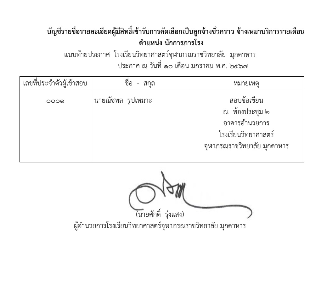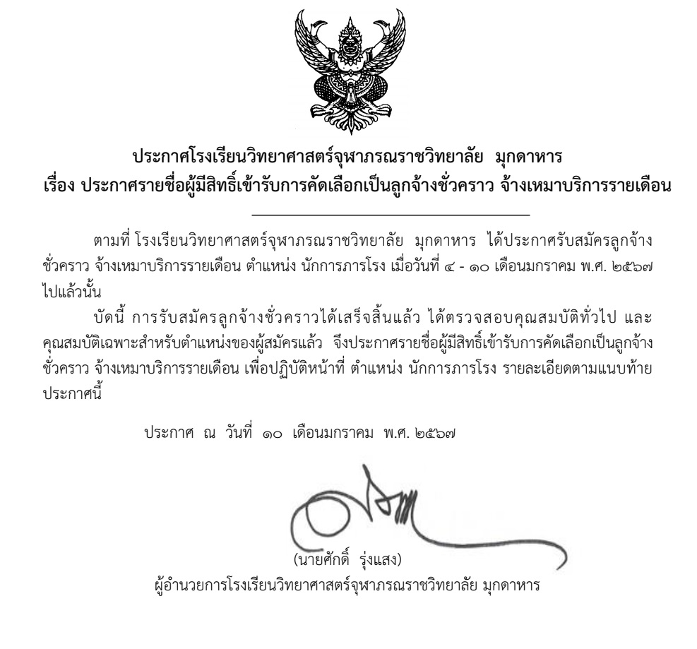 ประกาศรายชื่อผู้มีสิทธิ์เข้ารับการคัดเลือกเป็นลูกจ้างชั่วคราว จ้างเหมาบริการรายเดือน ตำแหน่งนักการภารโรง