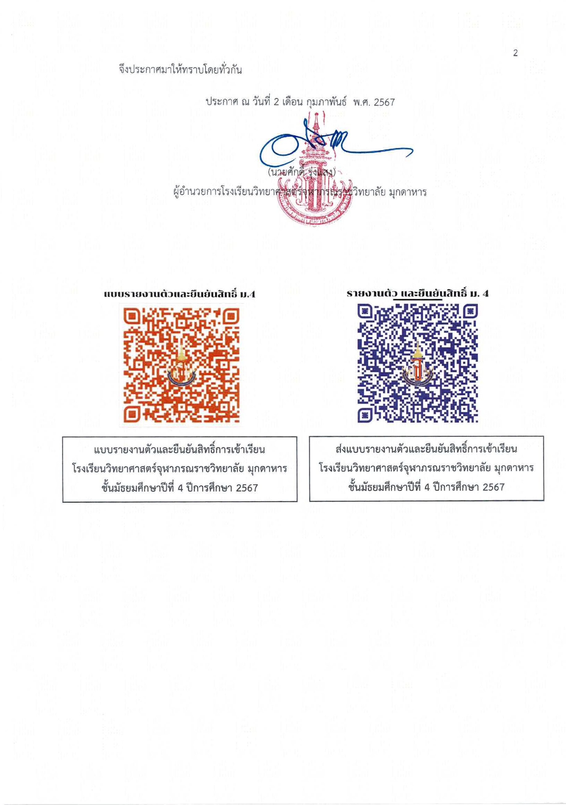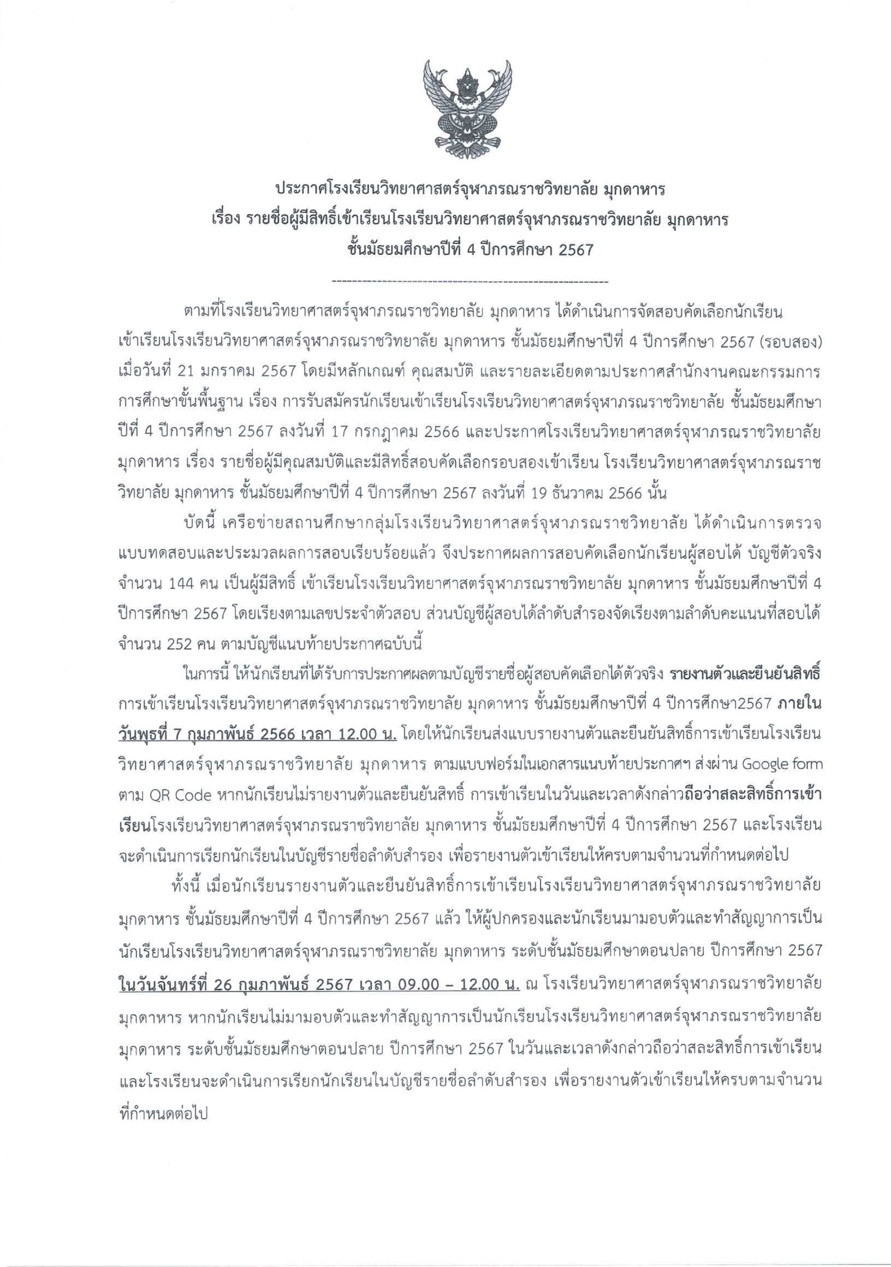 ประกาศรายชื่อผู้มีสิทธิ์เข้าเรียนชั้นมัธยมศึกษาปีที่ 4 โรงเรียนวิทยาศาสร์จุฬาภรณราชวิทยาลัย มุกดาหาร ปีการศึกษา 2567